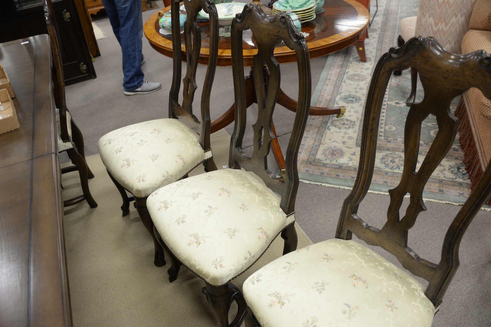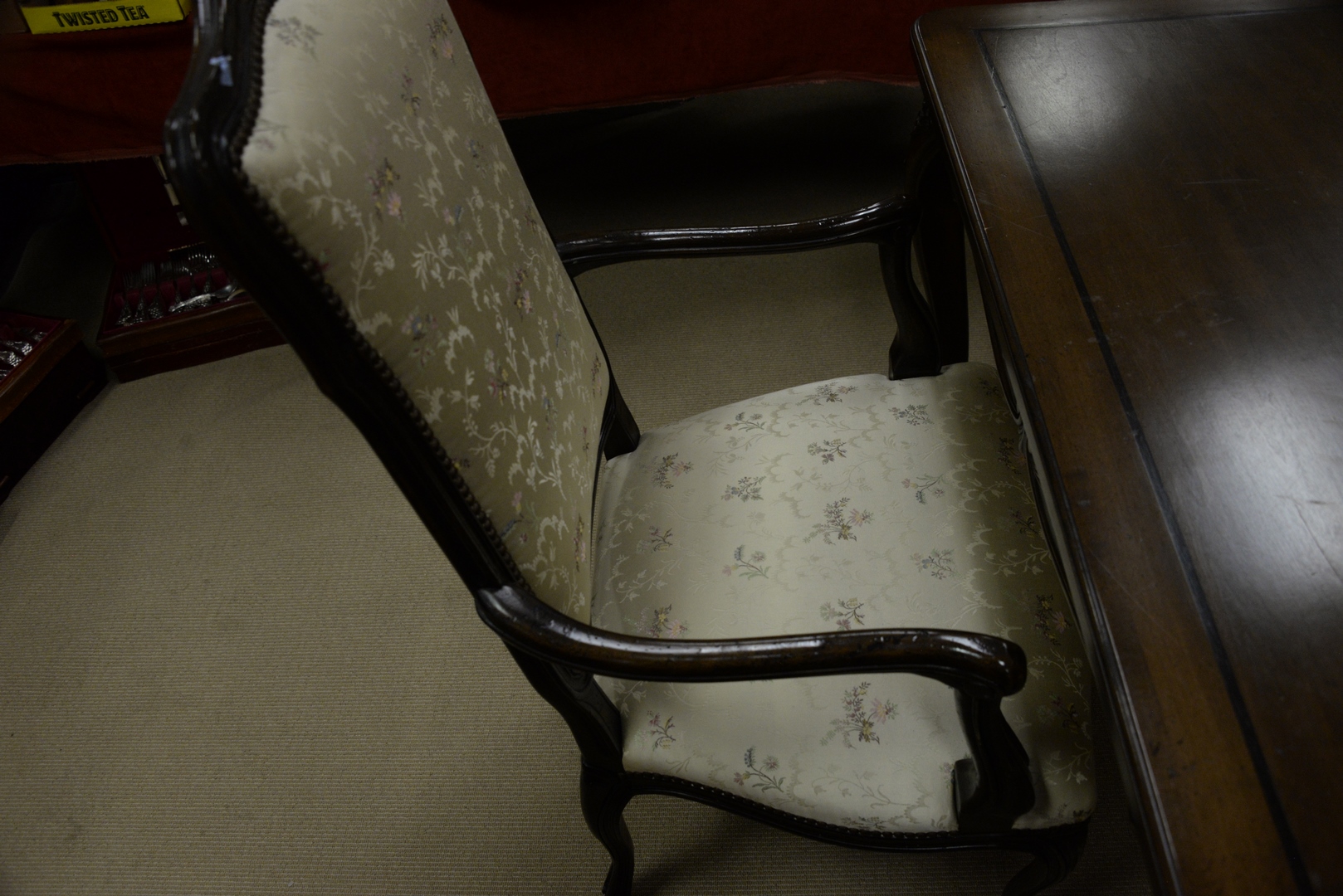 Lot 96: Set of Ten Auffray and Company Louis XV Style Dining Chairs to include two arm and eight side, all with custom silk upholstery, height 42 1/2 inches, (two armchairs are different).