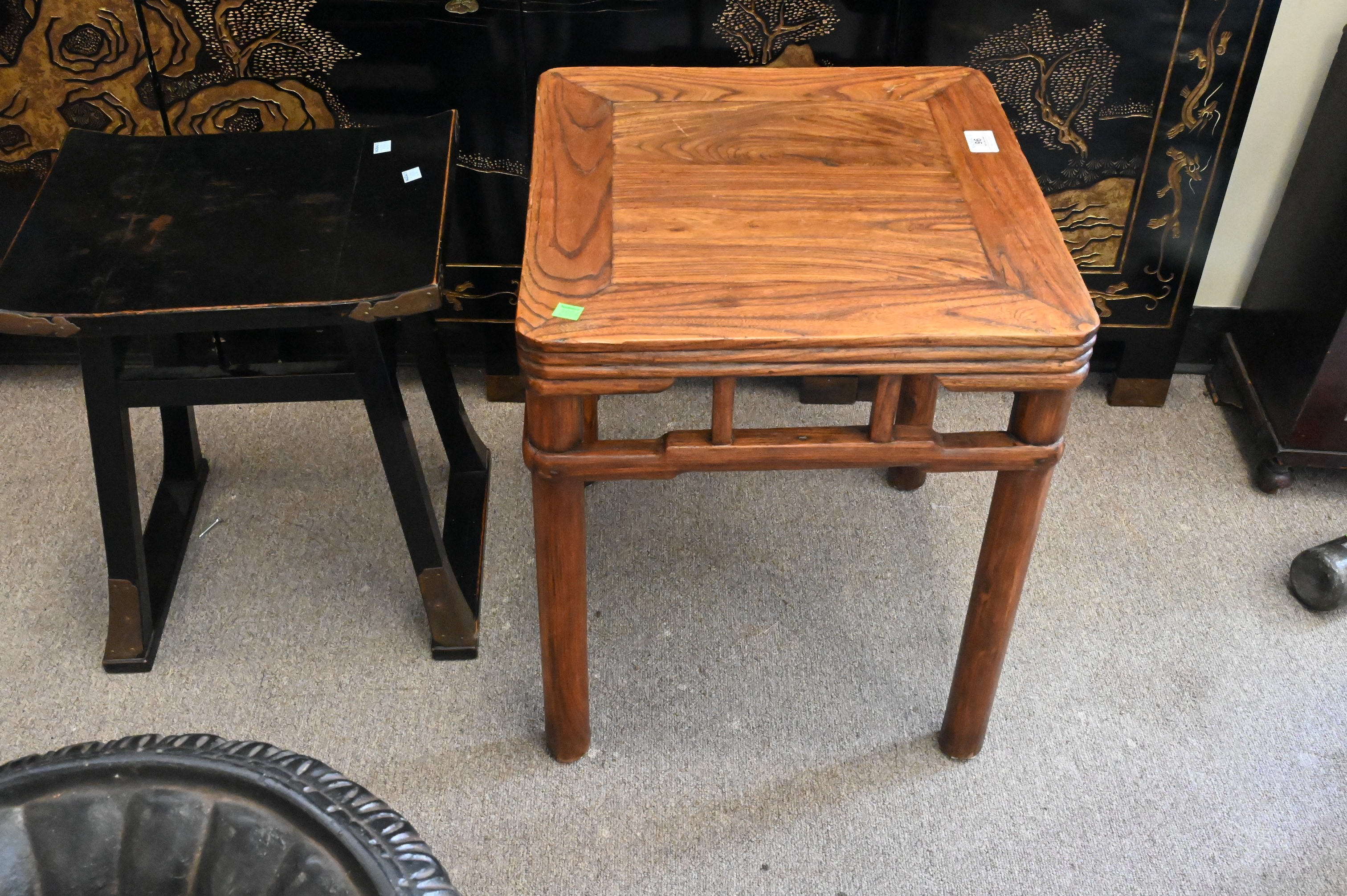 Three Asian Stands, one top loose, height red stand height 20 inches, black stand height 18 inches, brown stand height 21 inches.