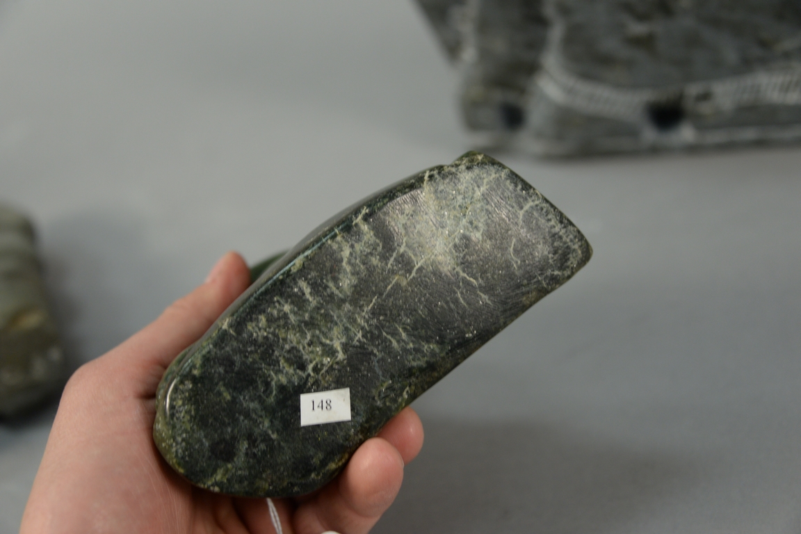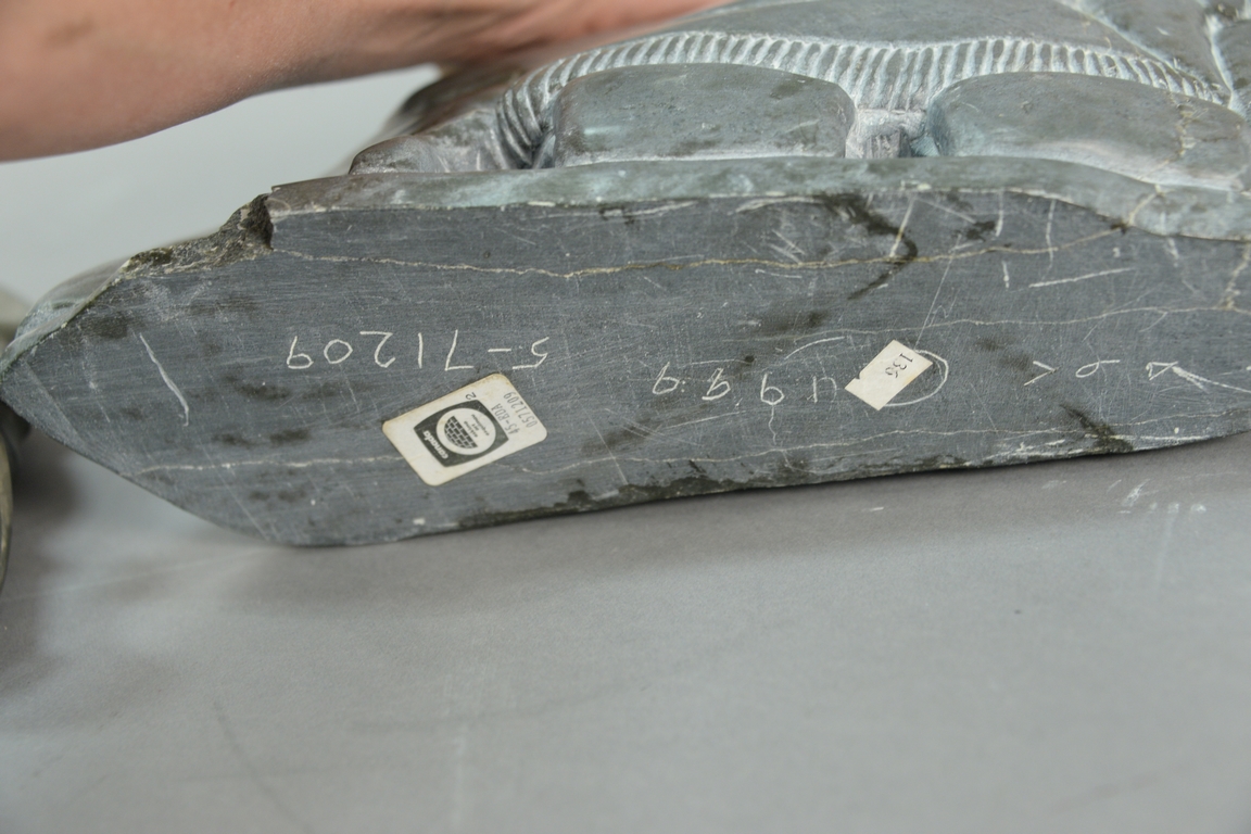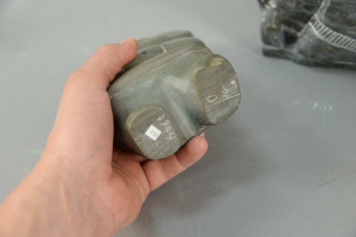 Lot 96: Three Inuit Eskimo carvings to include Annie Niviaxie 1930-1989 Kuujjuaraapik serpentine Mother & Child ht. 7 1/4in., Charlie In…