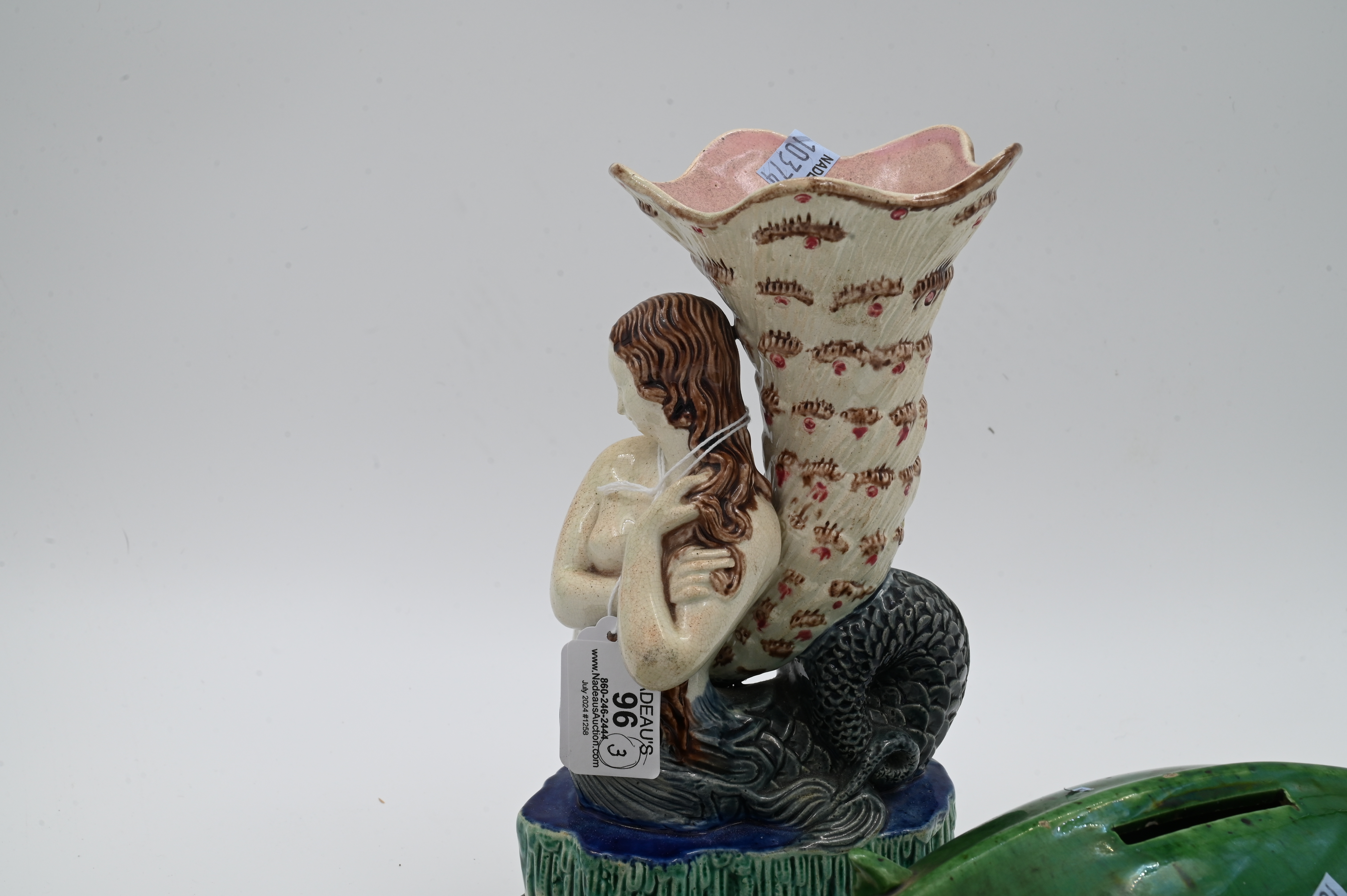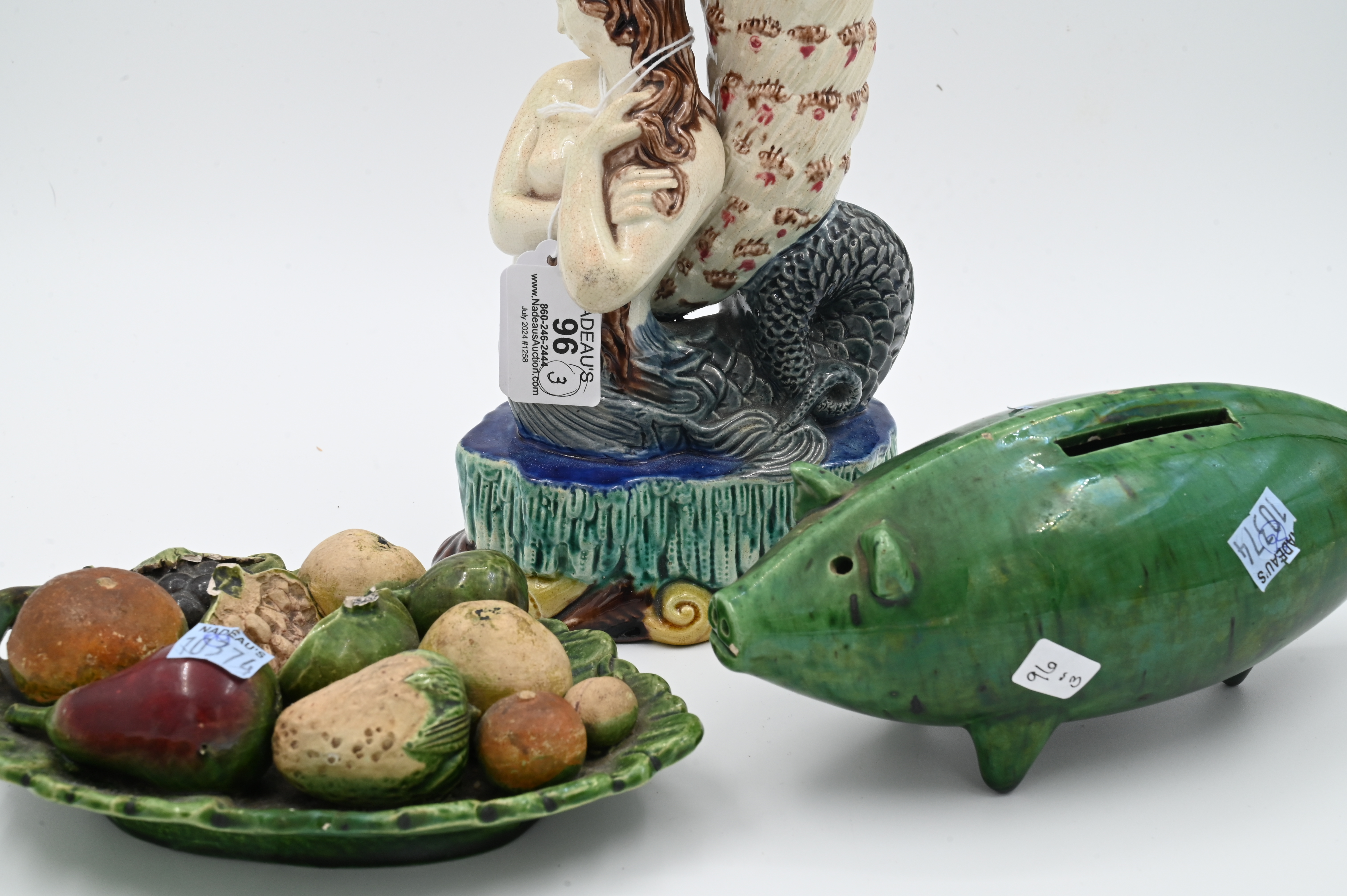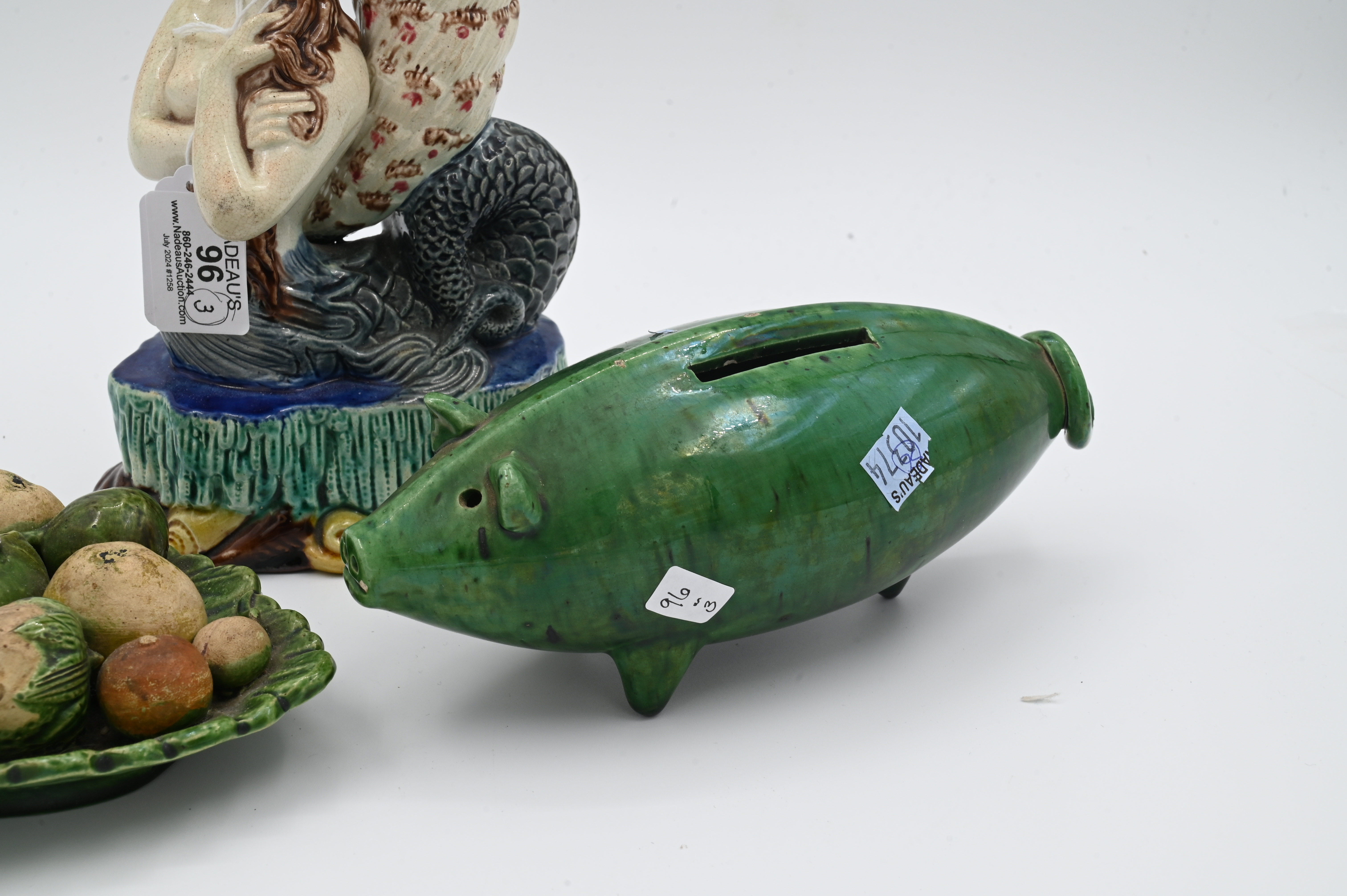 to include Netherlands Ceramic Workum/Gouela green glazed pig piggy bank, Jose A. Cunha successor fig plate palissy ware from caldas, mermaid center vase marked on bottom