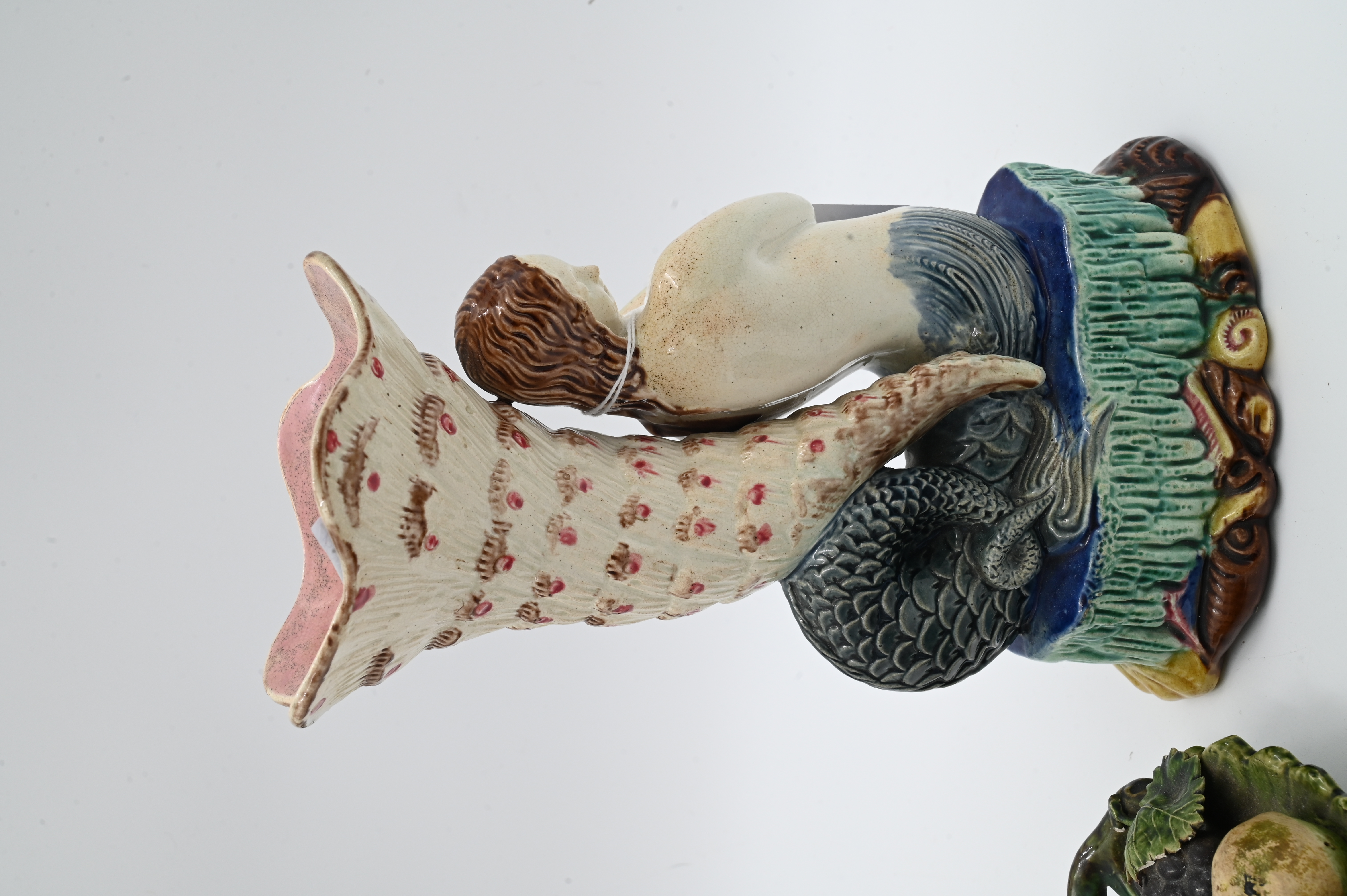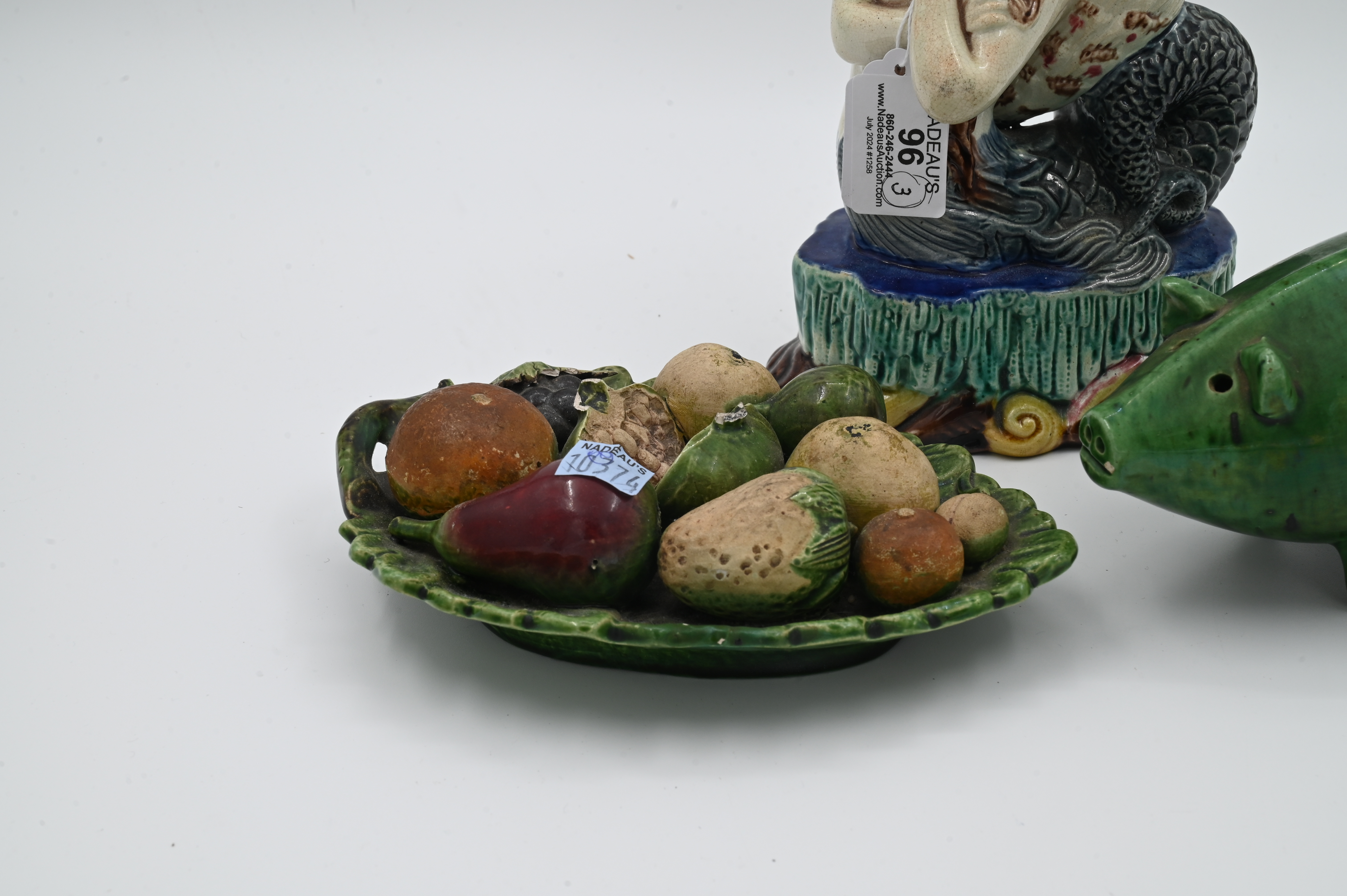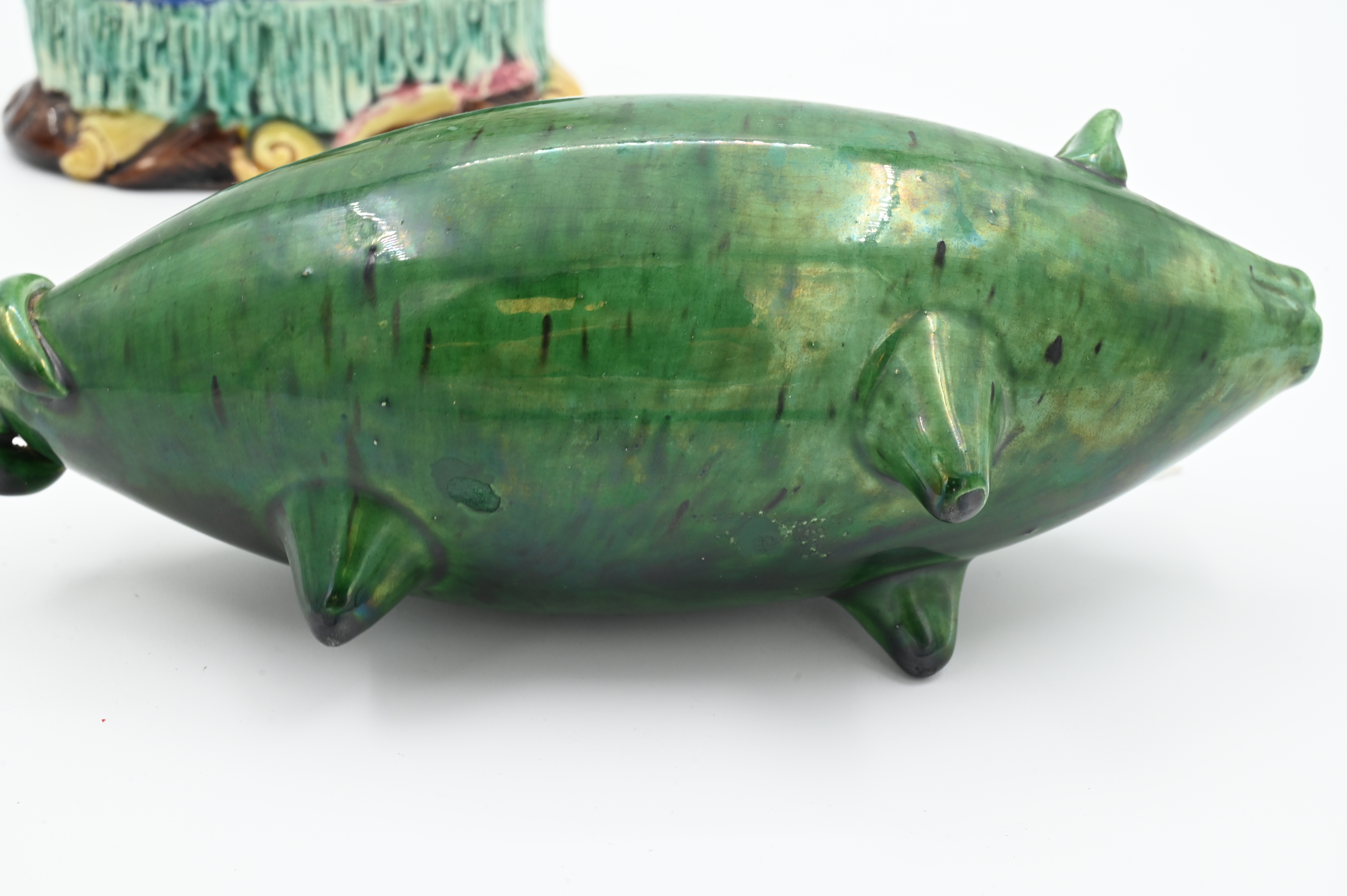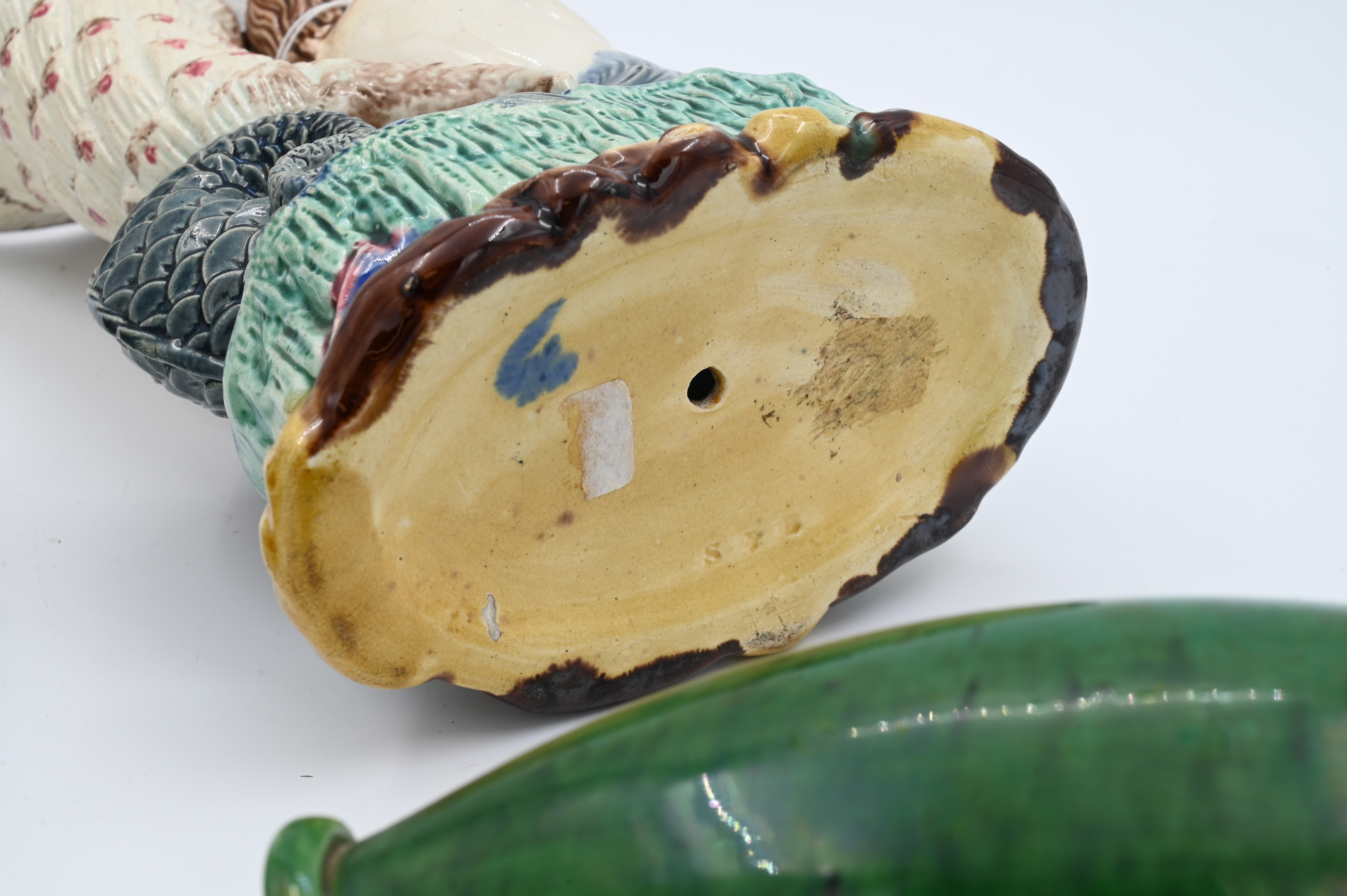 to include Netherlands Ceramic Workum/Gouela green glazed pig piggy bank, Jose A. Cunha successor fig plate palissy ware from caldas, mermaid center vase marked on bottom