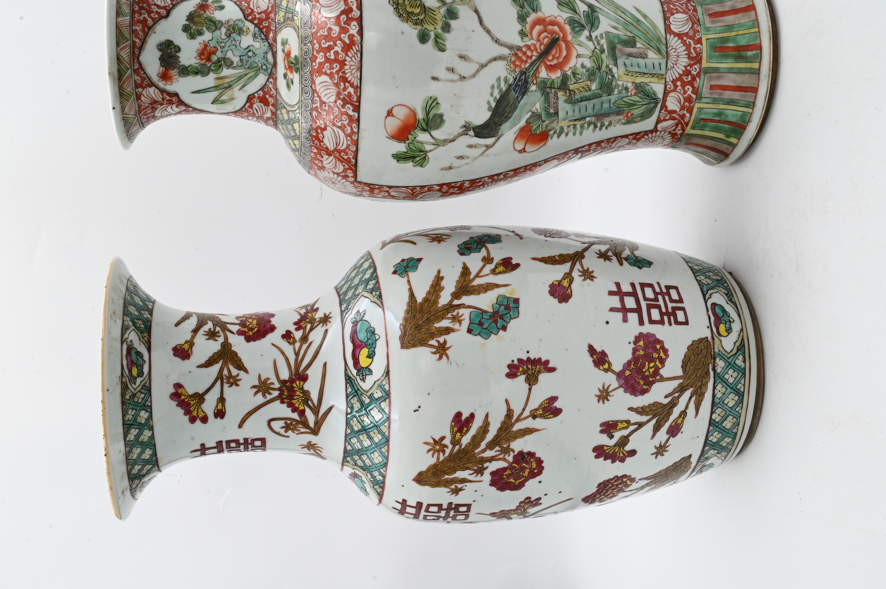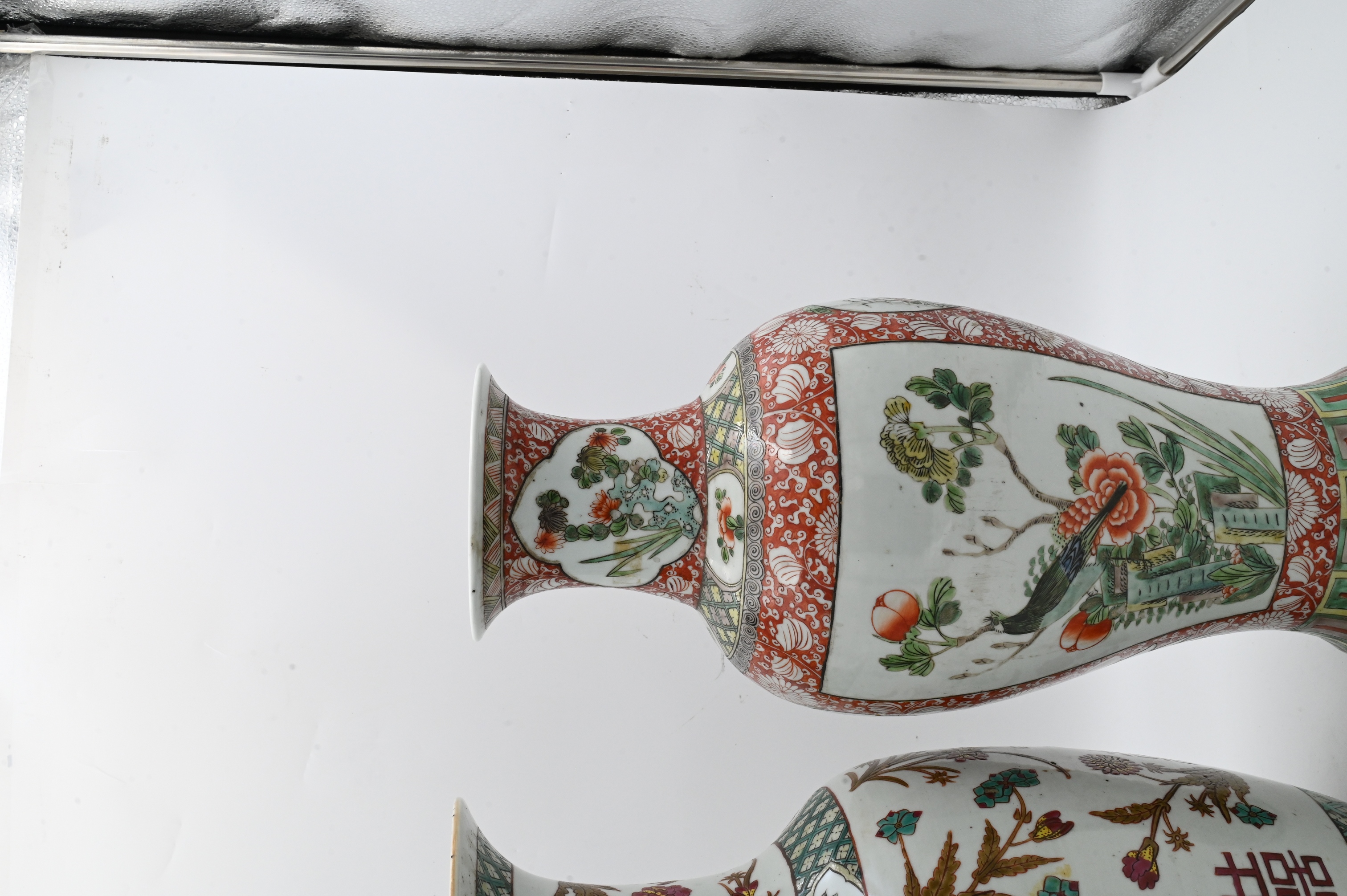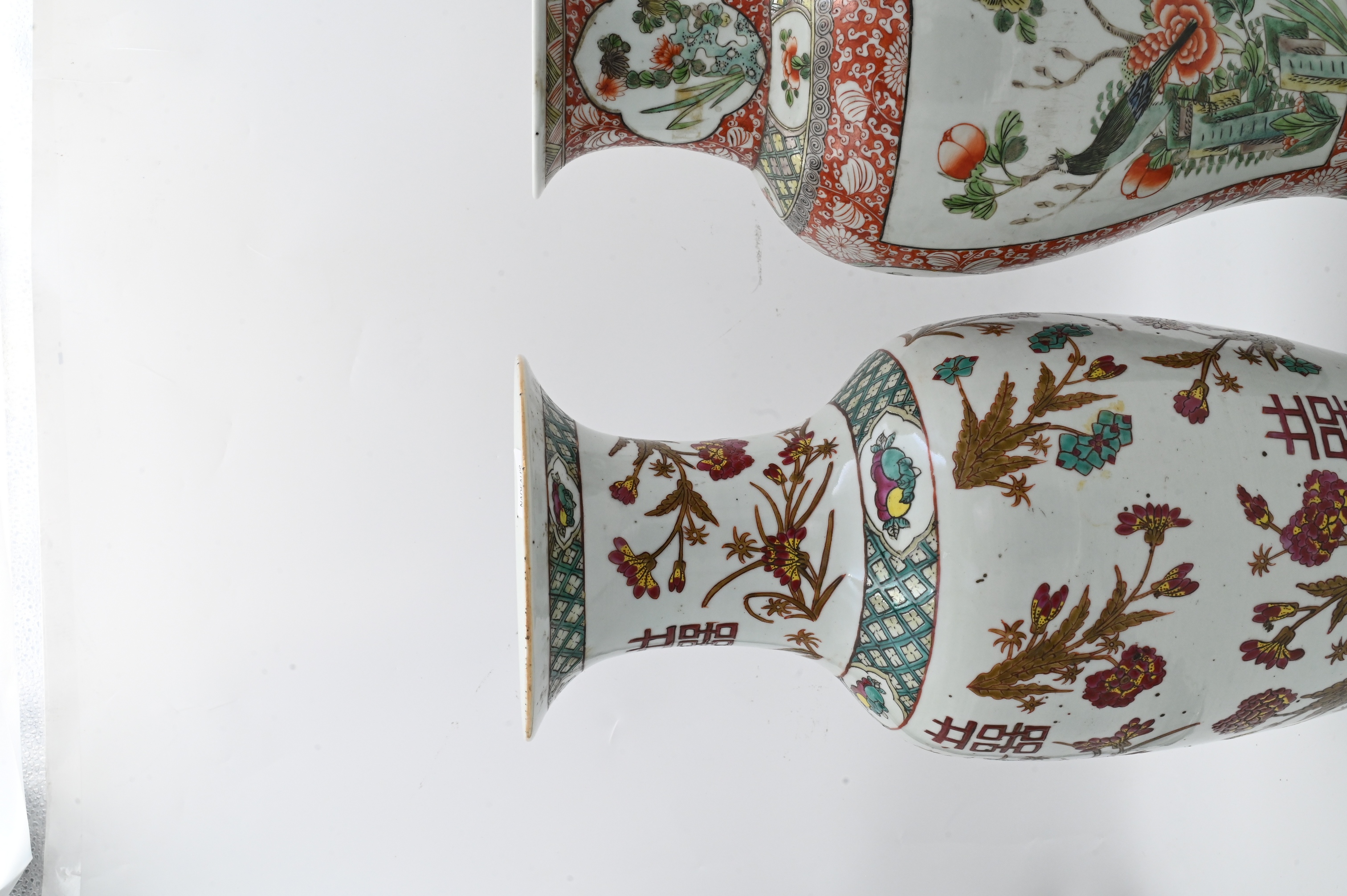 to include one baluster form famille and iron red vase featuring cartouches with birds of paradise and pheasants along with enameled flower vase with flared neck