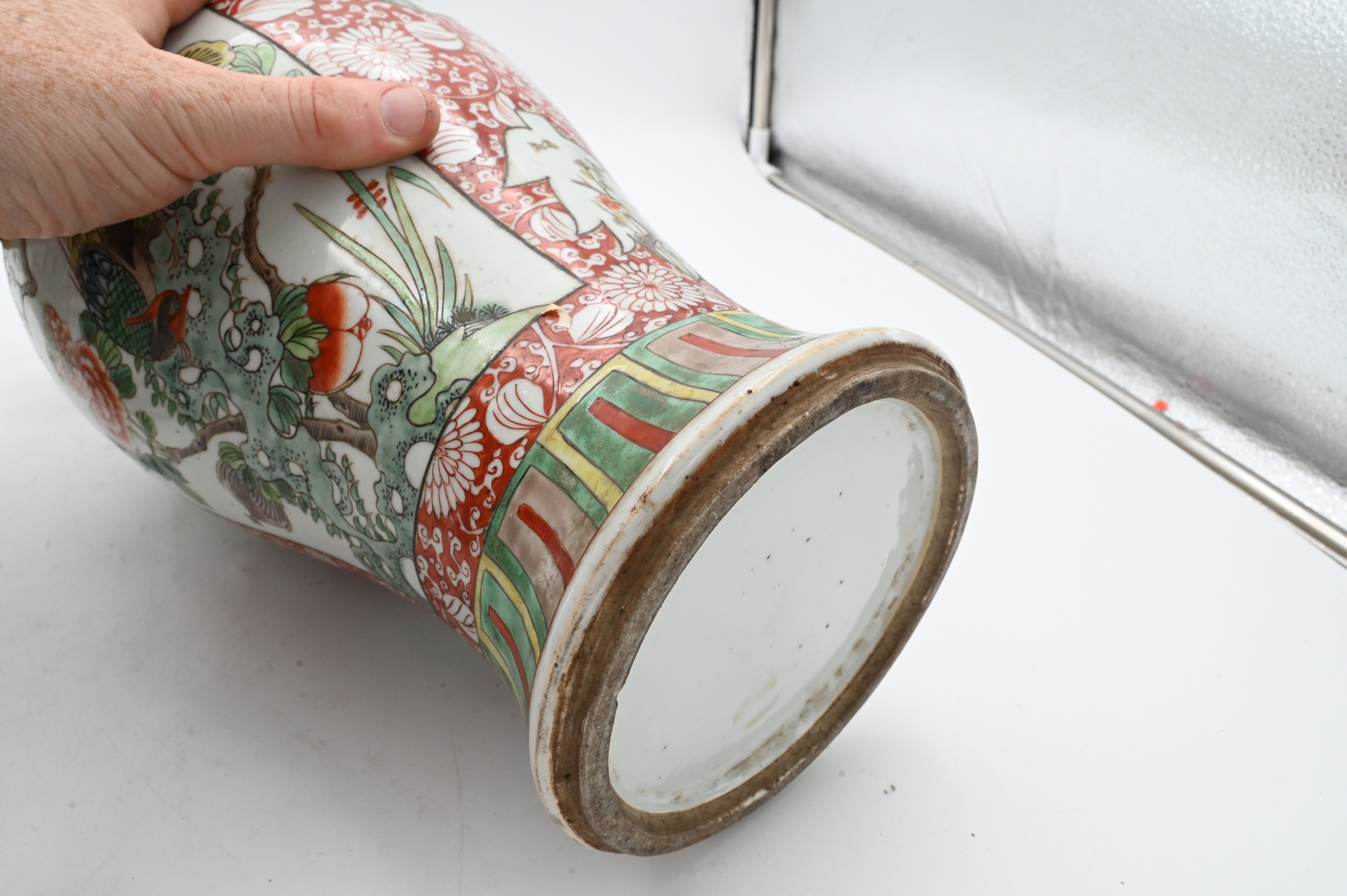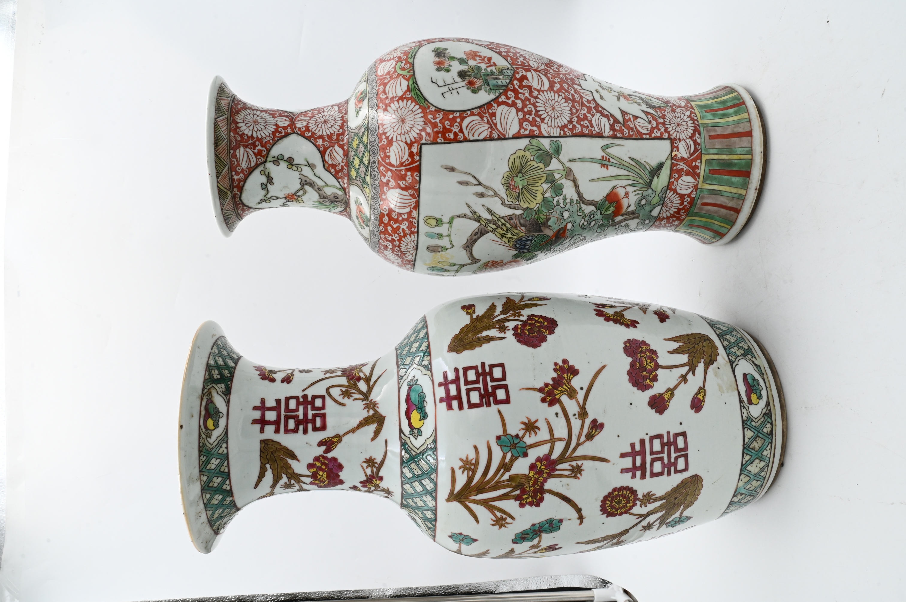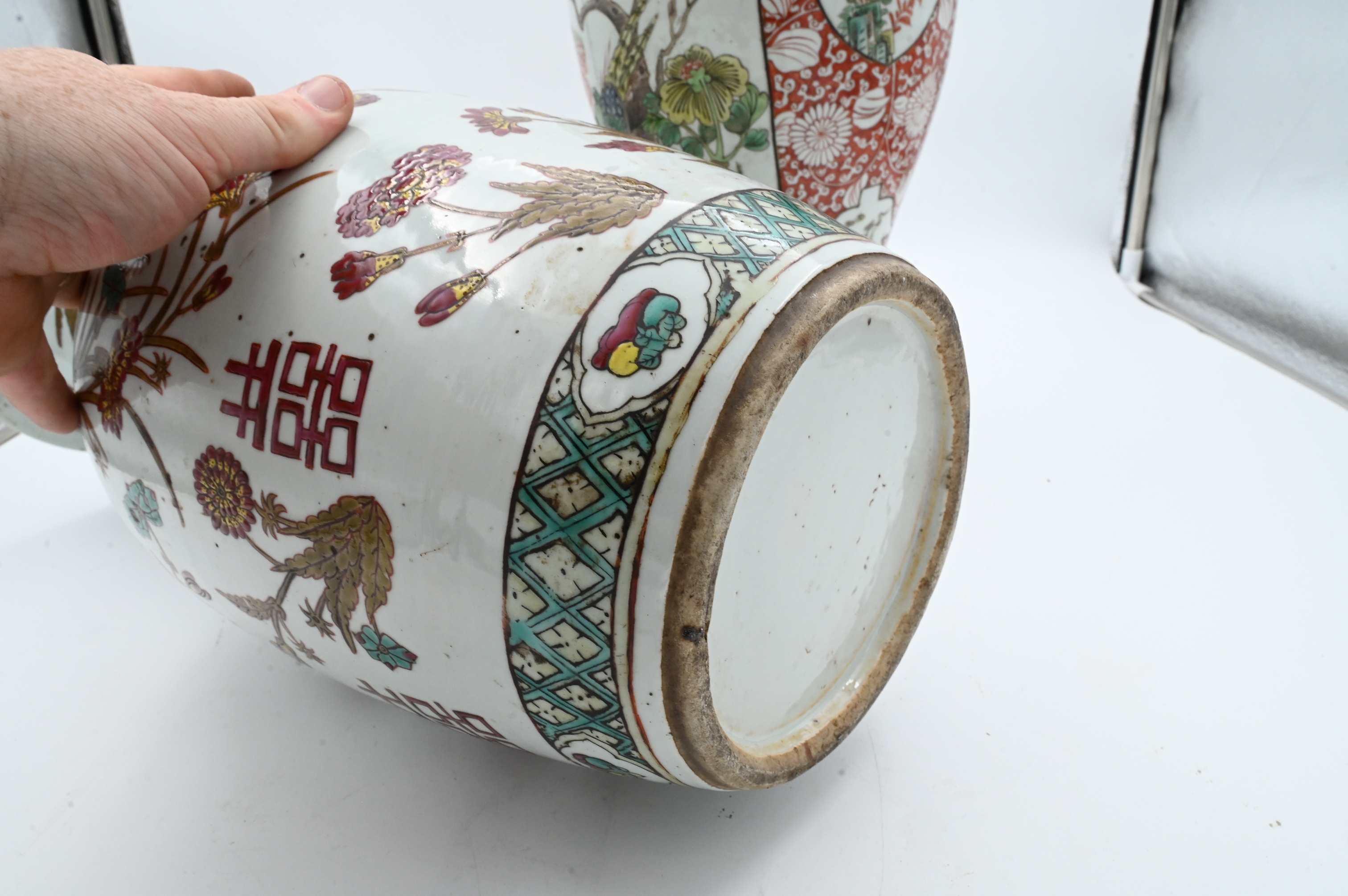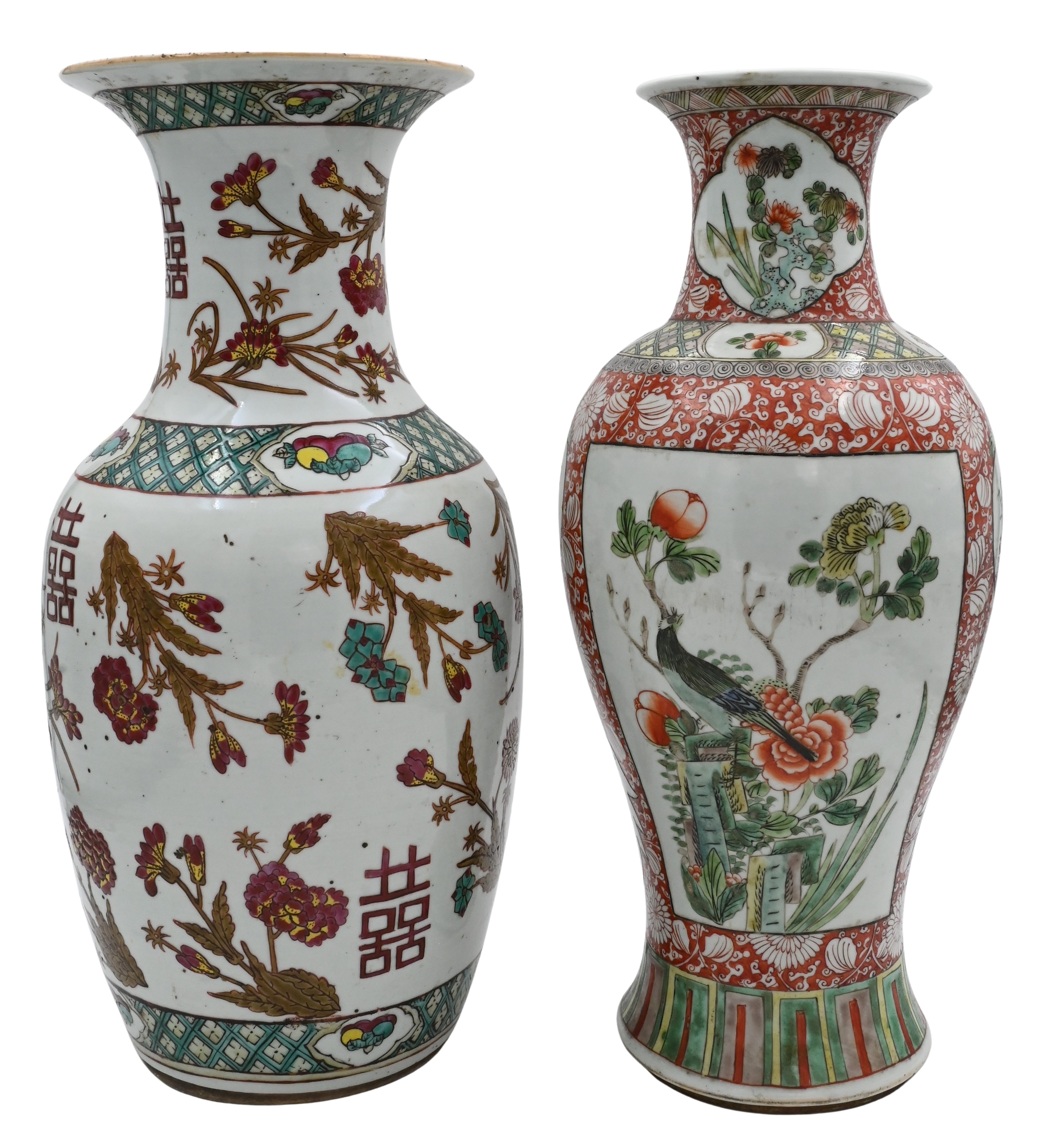 to include one baluster form famille and iron red vase featuring cartouches with birds of paradise and pheasants along with enameled flower vase with flared neck