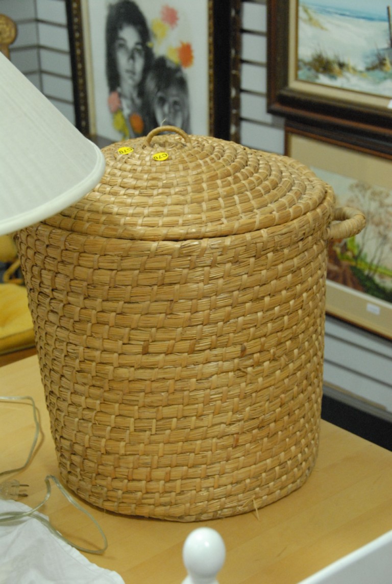 Large brass bucket and a woven basket