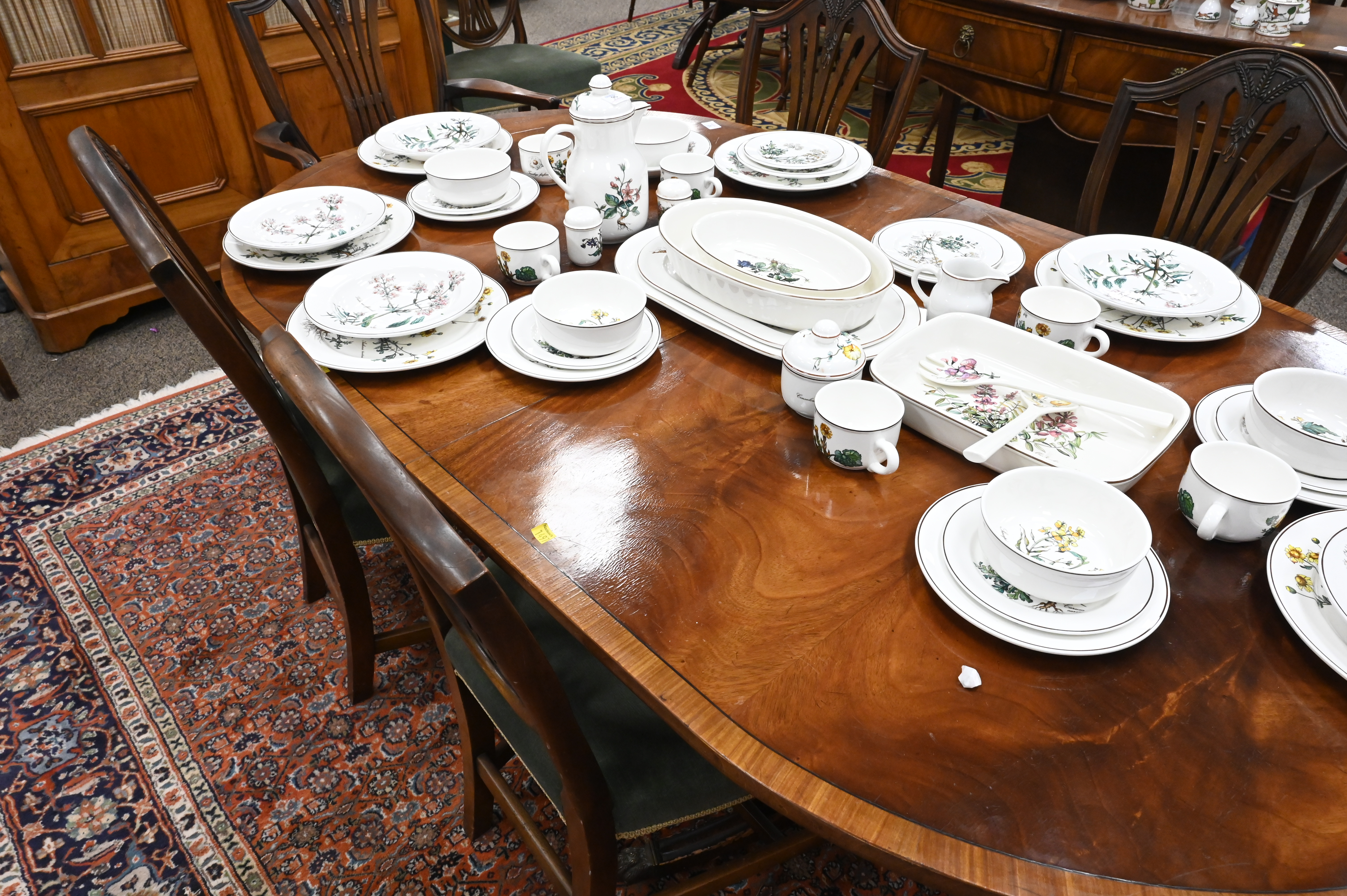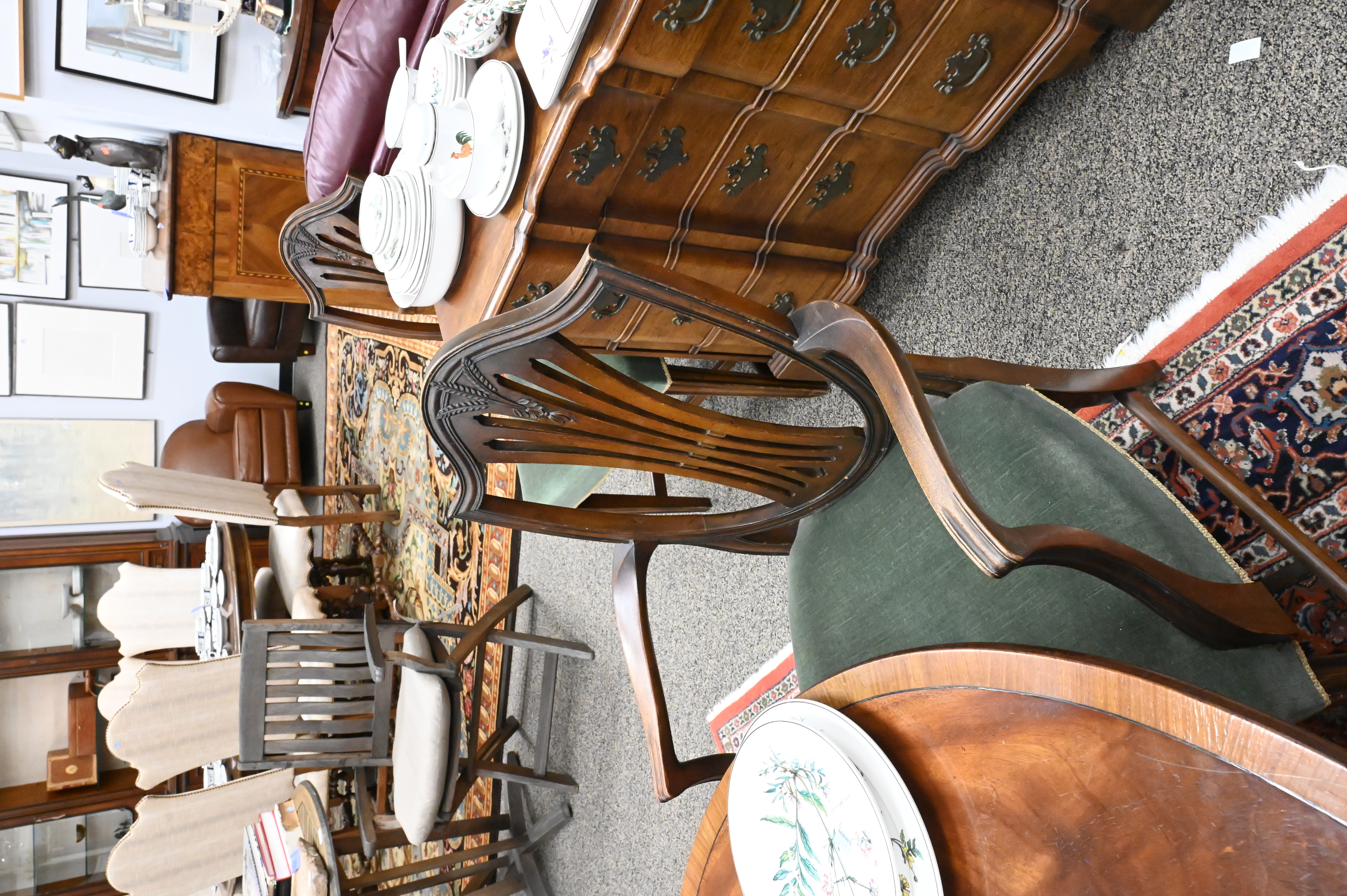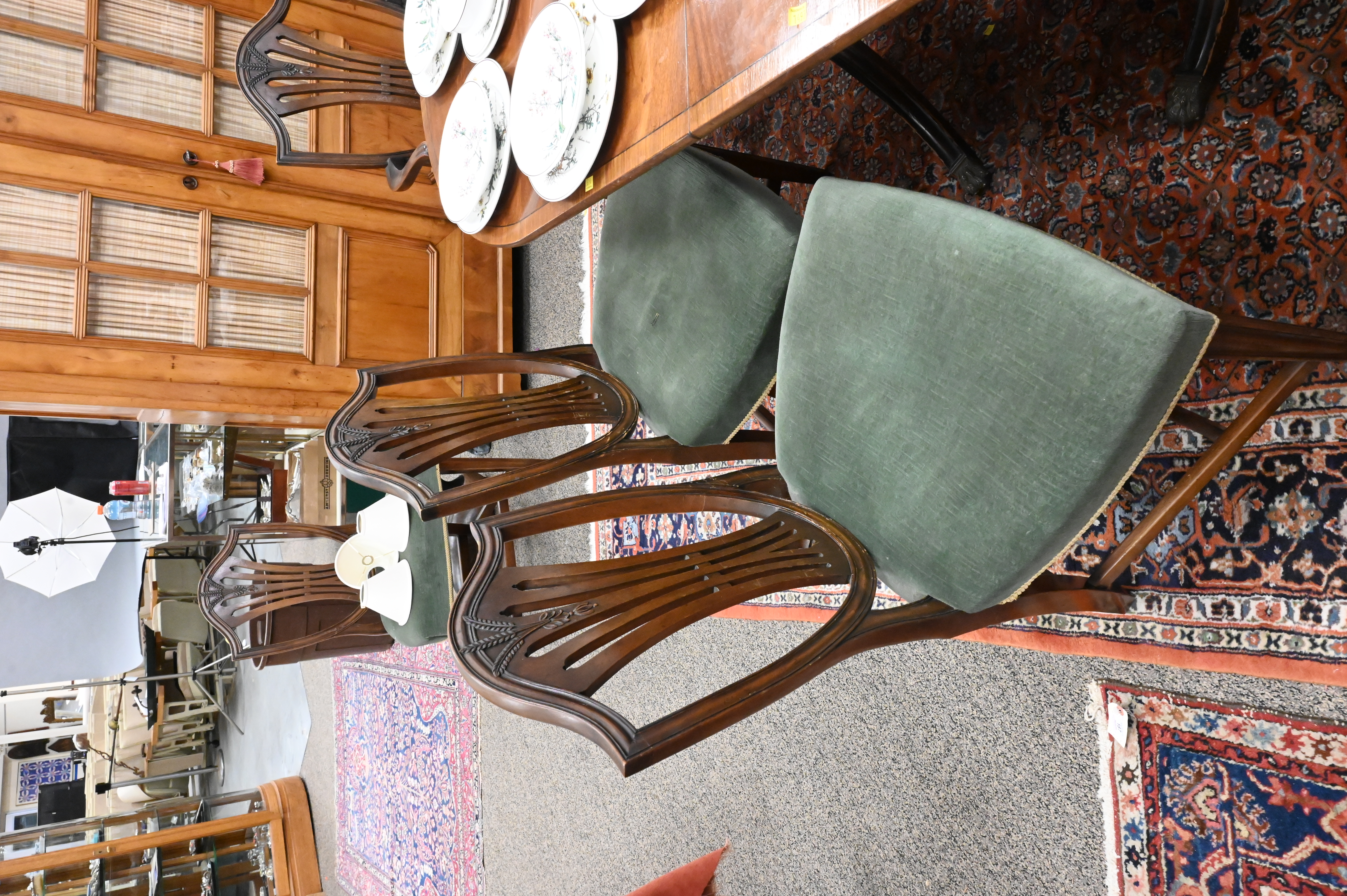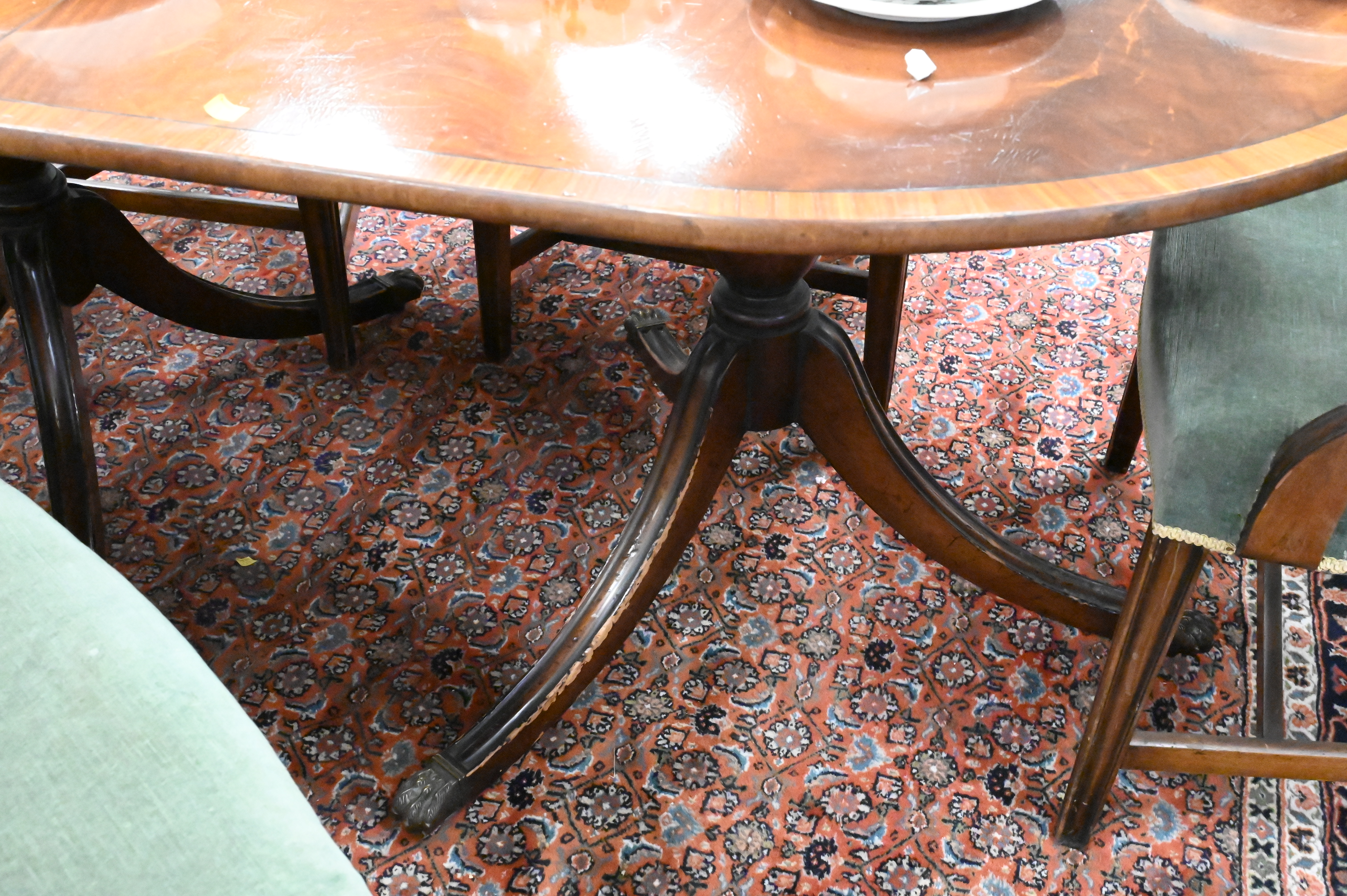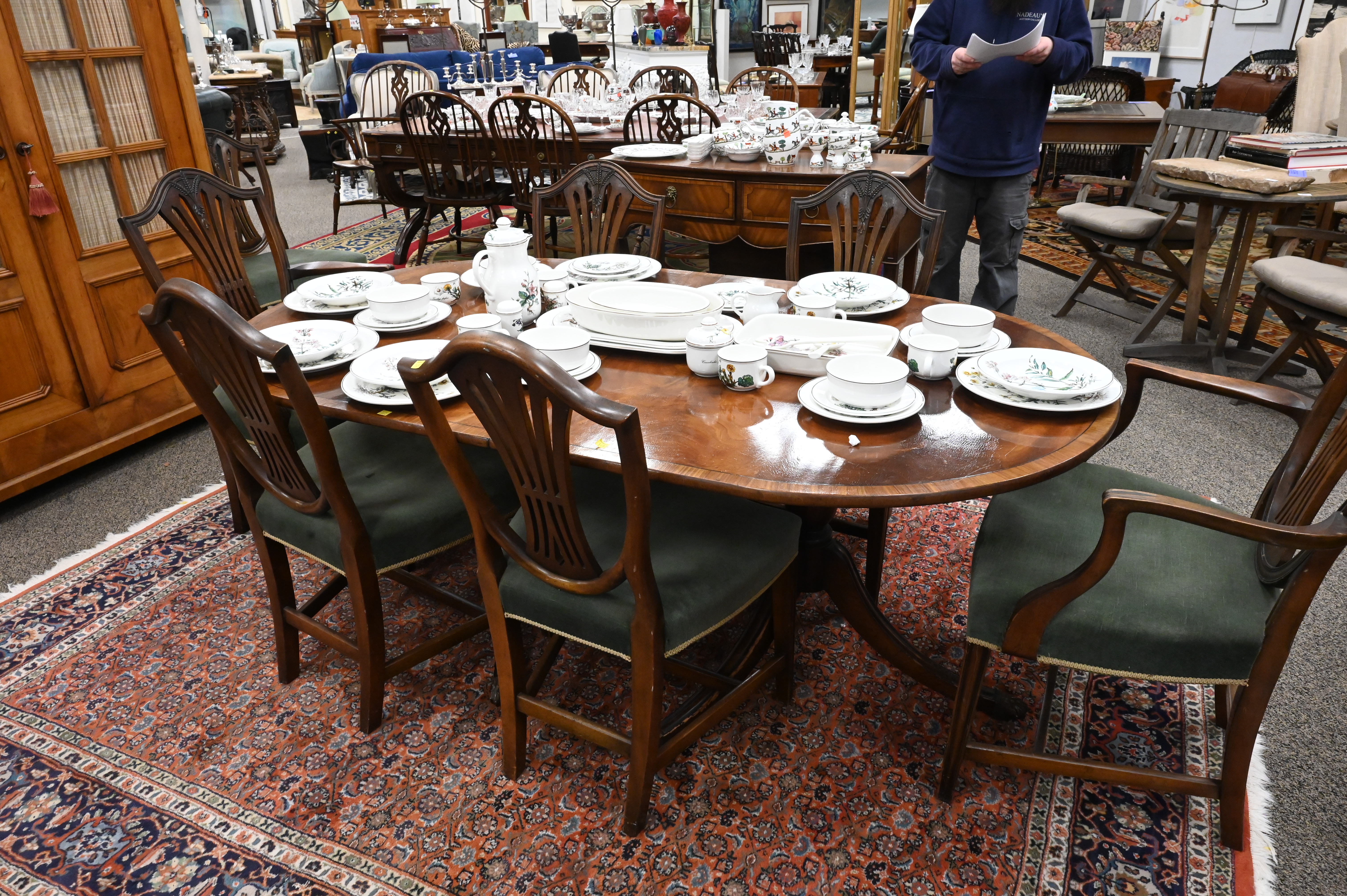 11 Piece Mahogany Dining Set, to include 10 federal style dining chairs, 2 arm, 8 side, along with an oval double pedestal dining table having banded inlaid top and two 18″ leaves, height 29 1/2 inches, top 40″ x 70″, open 40″ x 106″.