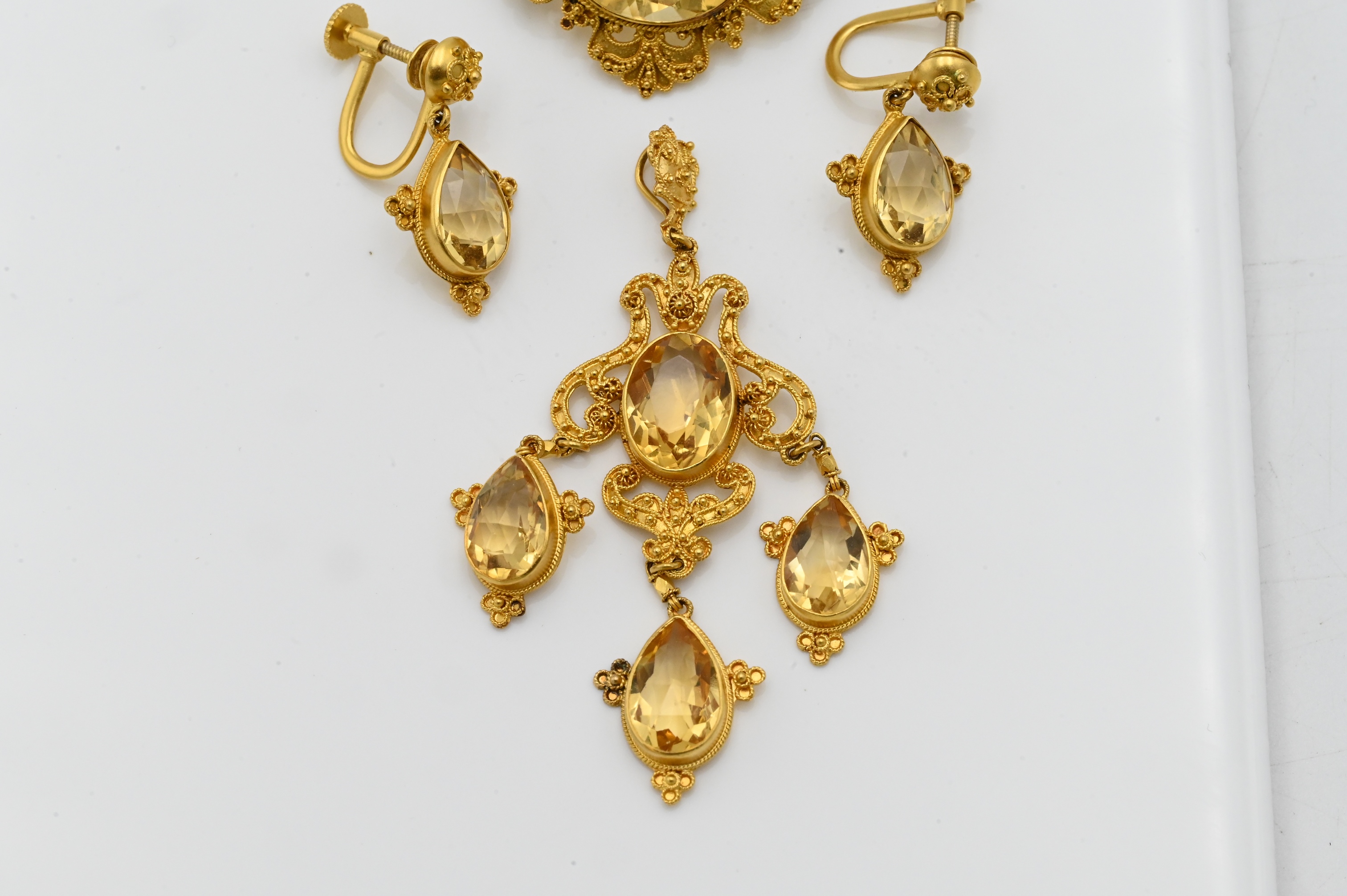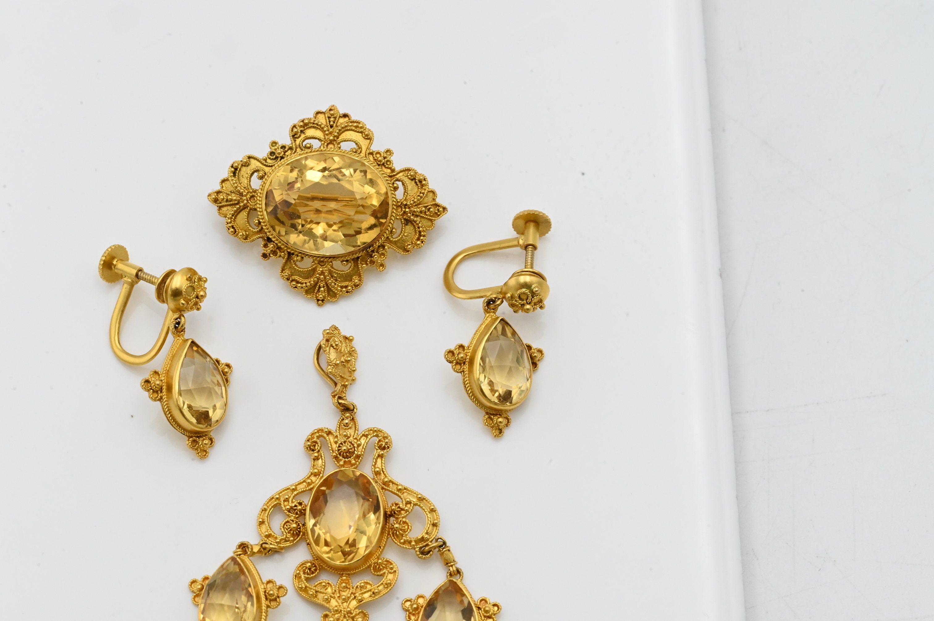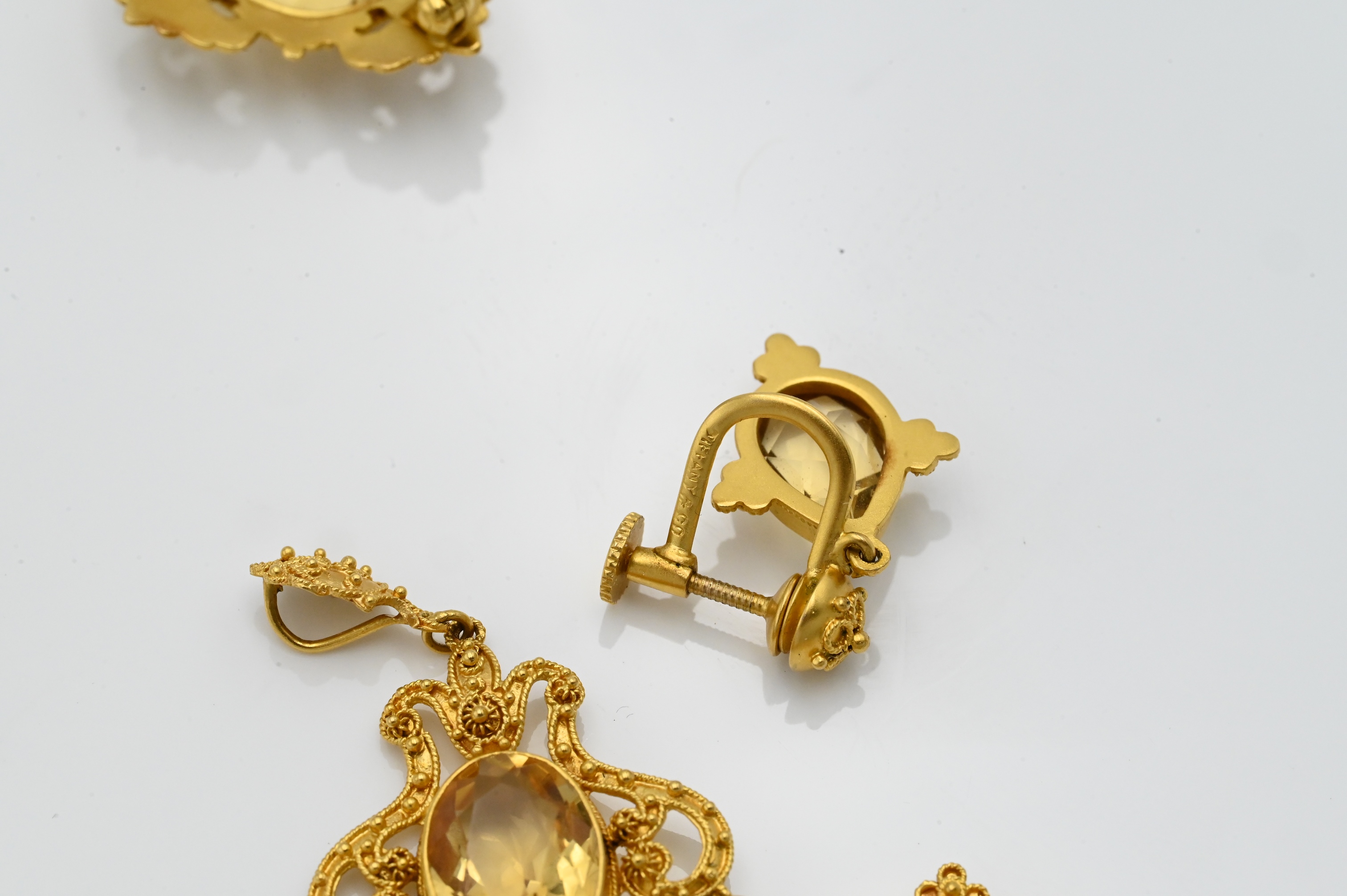 including a pair of screw back earrings having pear shaped drop citrines, pendant having oval and three pear shaped citrines, along with brooch having oval citrine, earrings are marked Tiffany & Co 14K