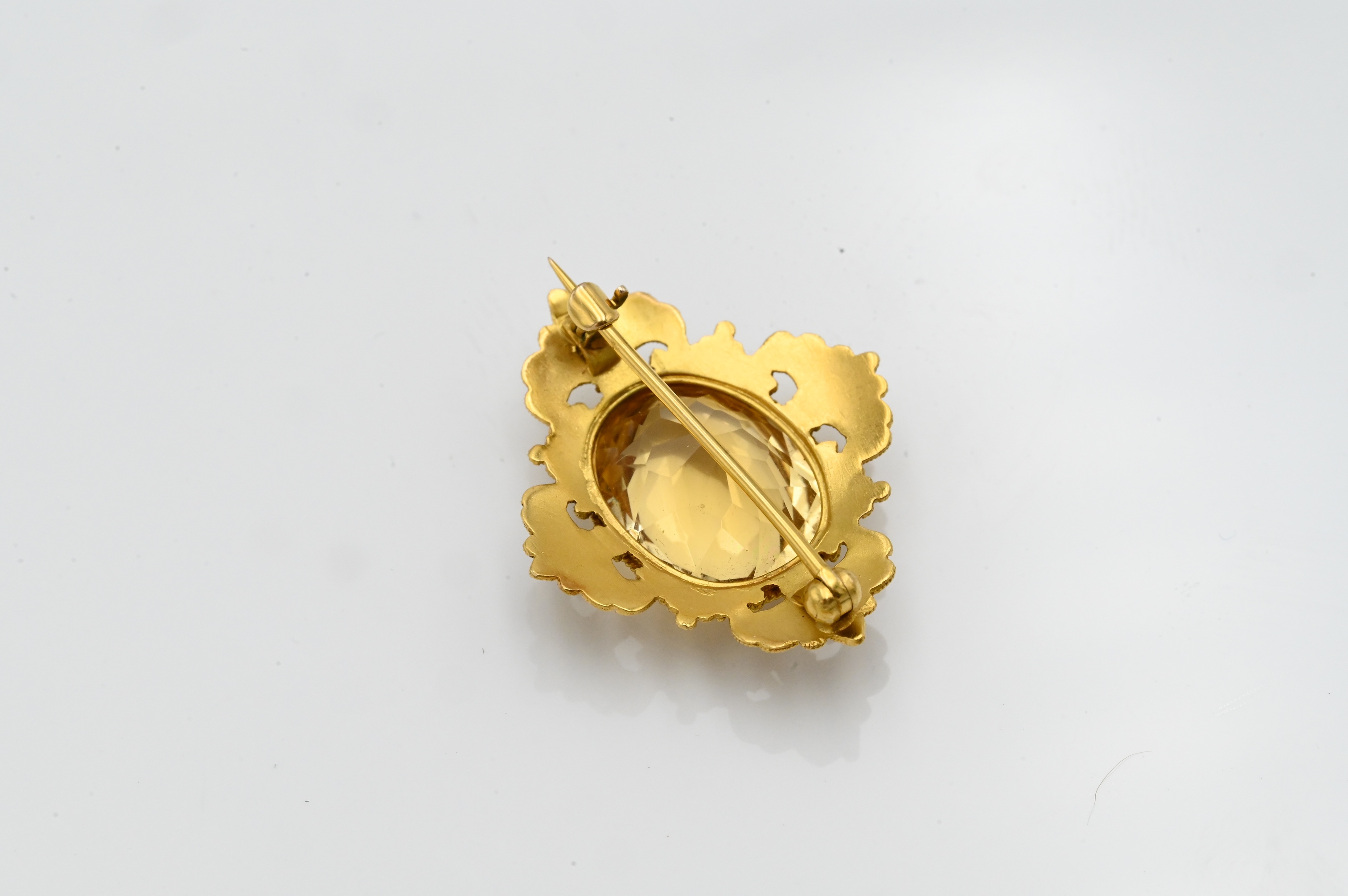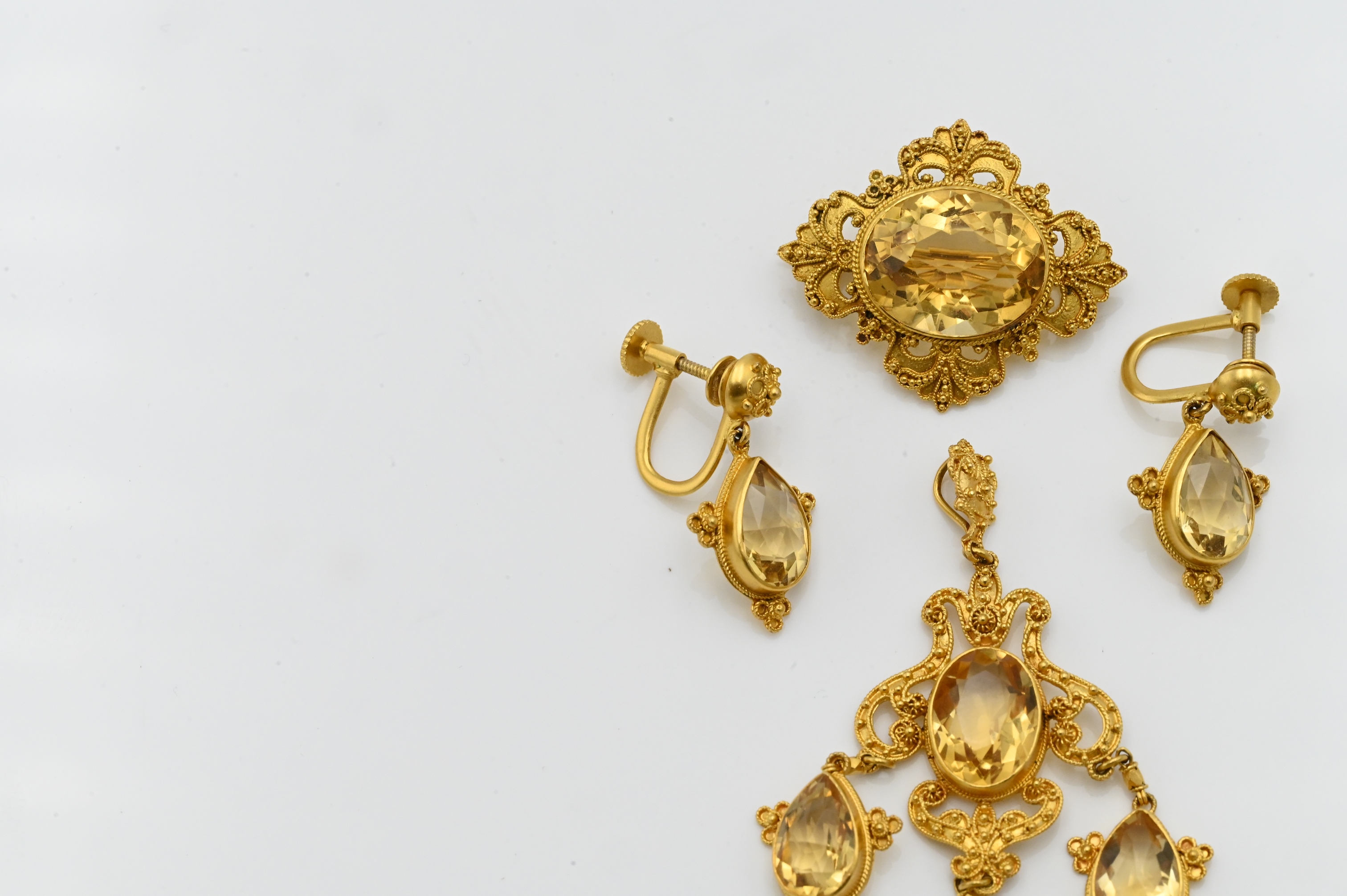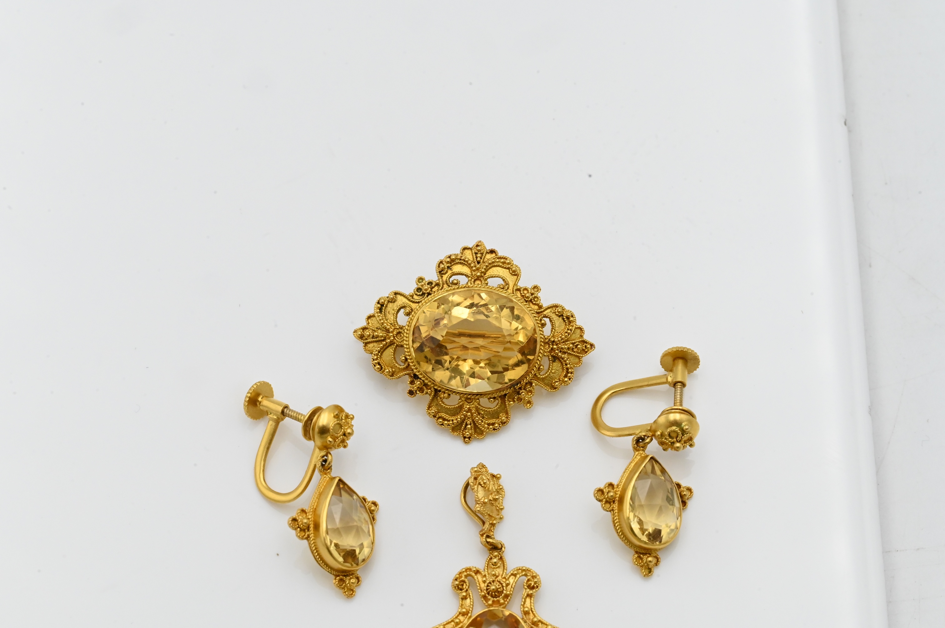 including a pair of screw back earrings having pear shaped drop citrines, pendant having oval and three pear shaped citrines, along with brooch having oval citrine, earrings are marked Tiffany & Co 14K