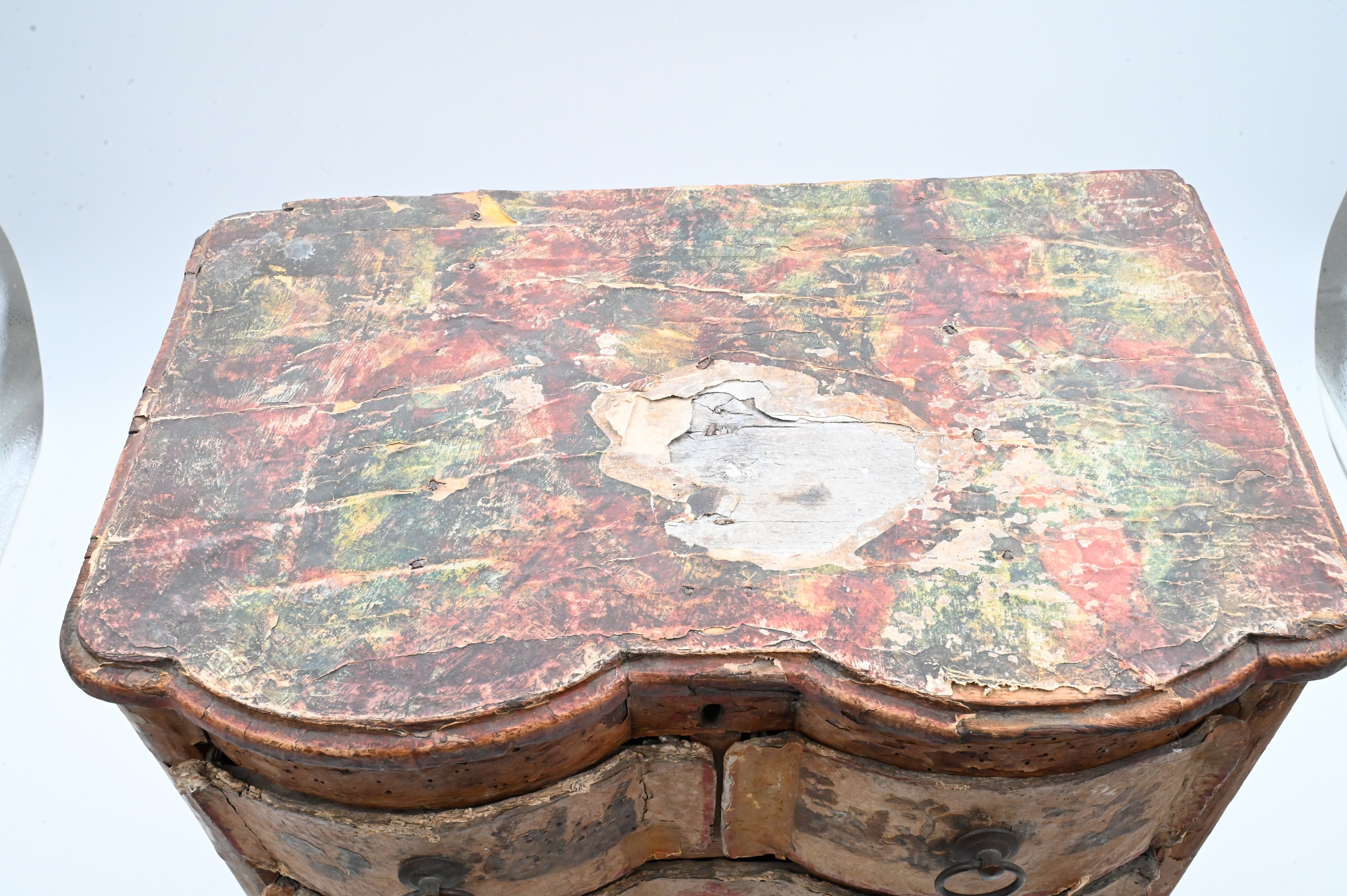 miniature serpentine-front commode, constructed in wood and carton-pierre / papier-mâché, the exterior retaining remnants of original painted decoration with traces of architectural and landscape scenes, the lift-off top reveals early internal construction, and the drawers are lined with fragments of handwritten 18th-century letters used in the papier-mâché layering, fitted with original small ring pulls, the piece displays true 18th-century form with shaped top, serpentine façade, and short bracket feet.