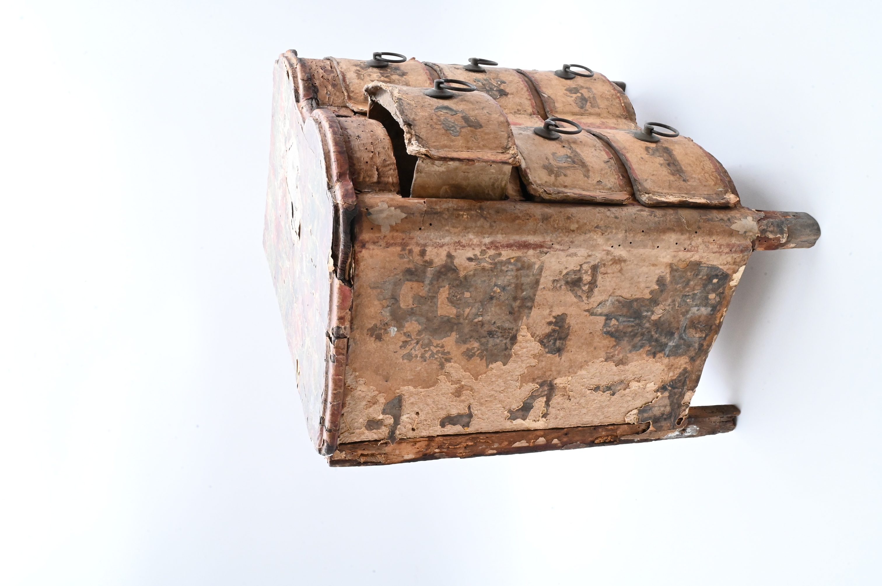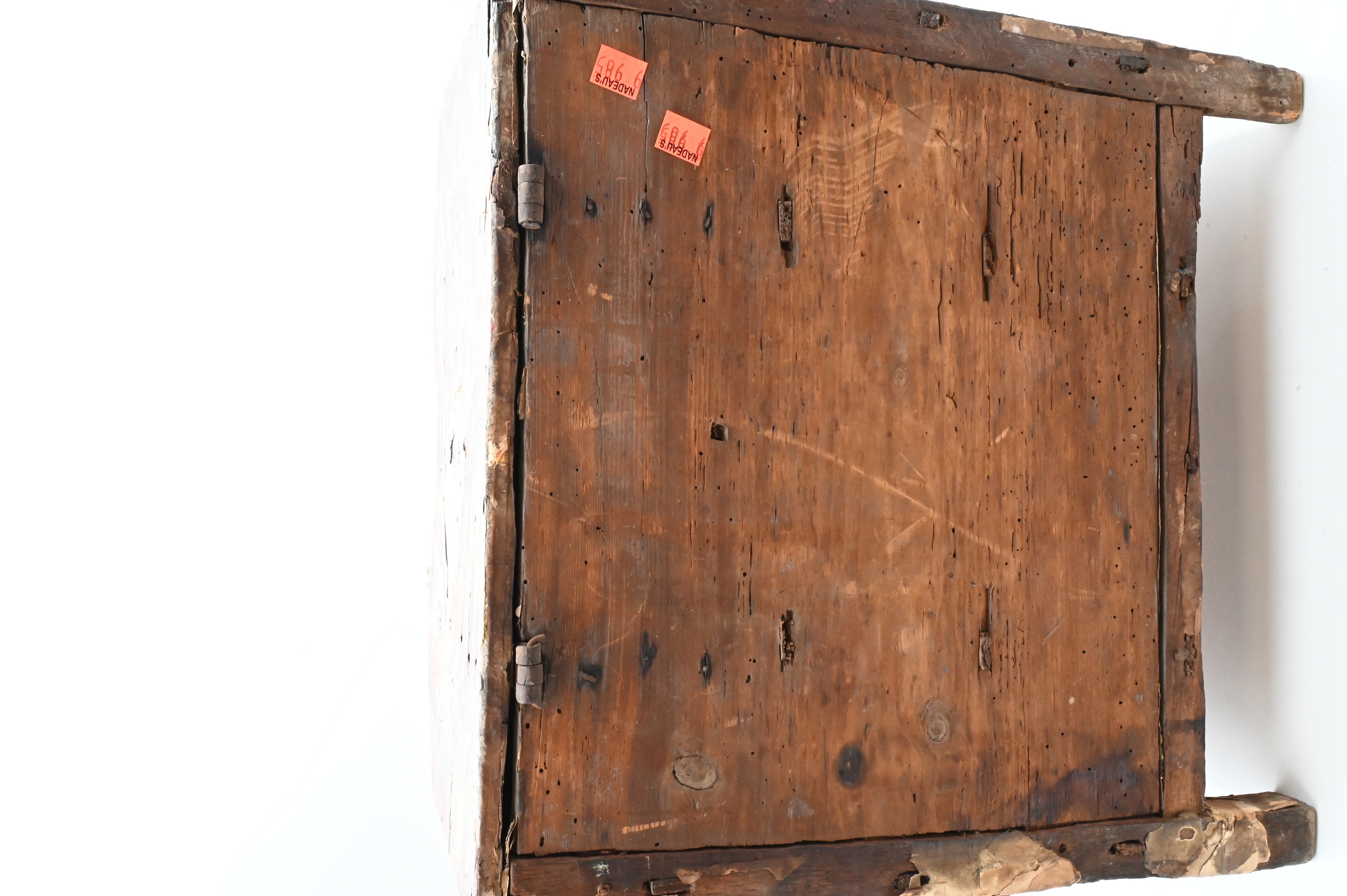 Losses, wear, lifting, and degradation; painted and paper surfaces fragmentary; worming visible; drawers fragile; consistent with age and material