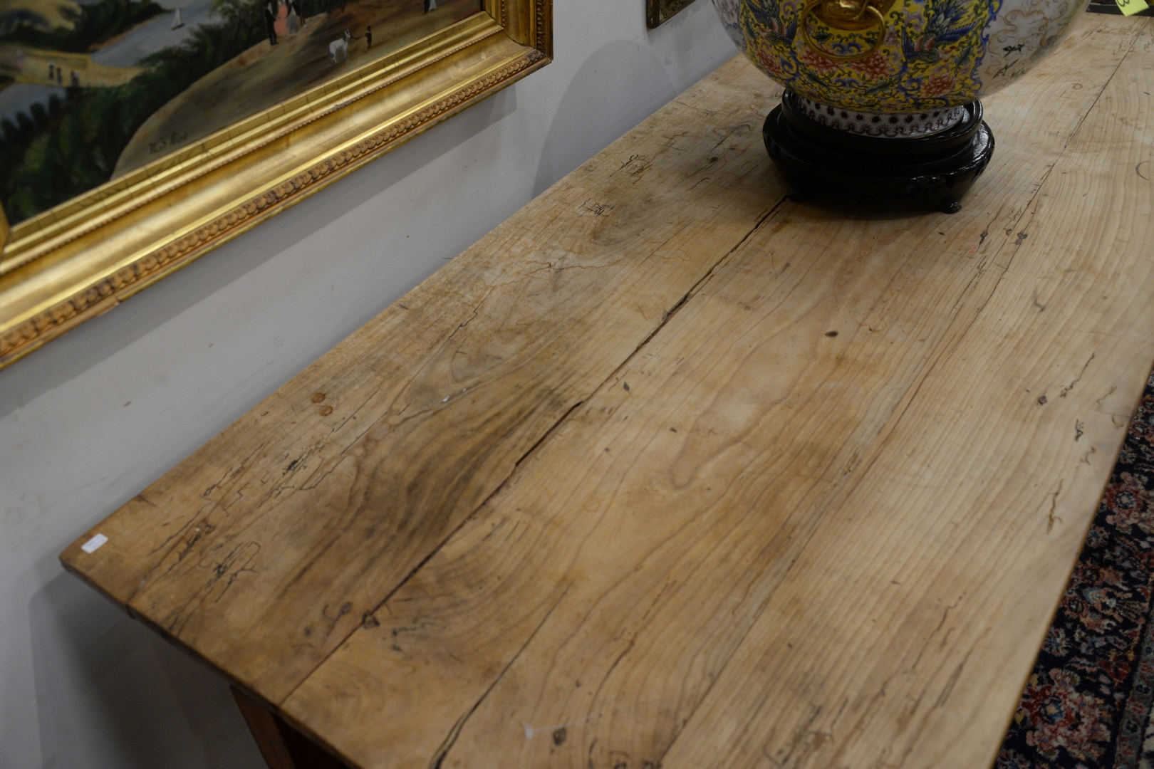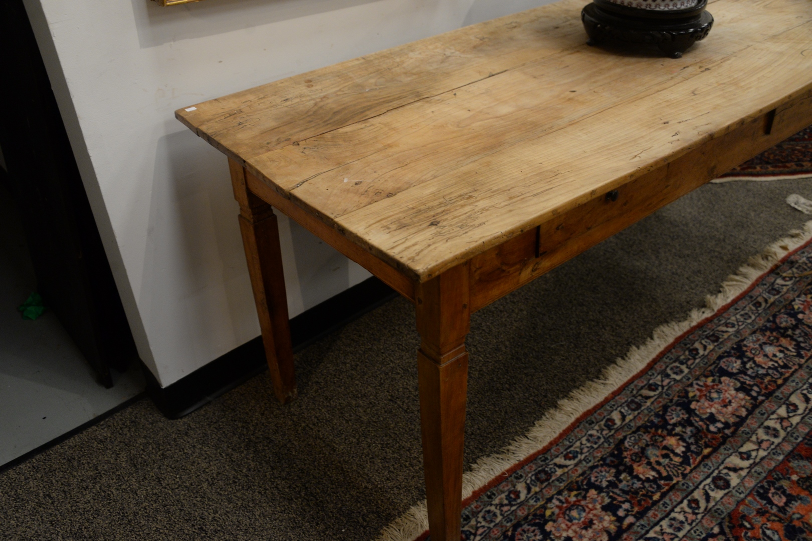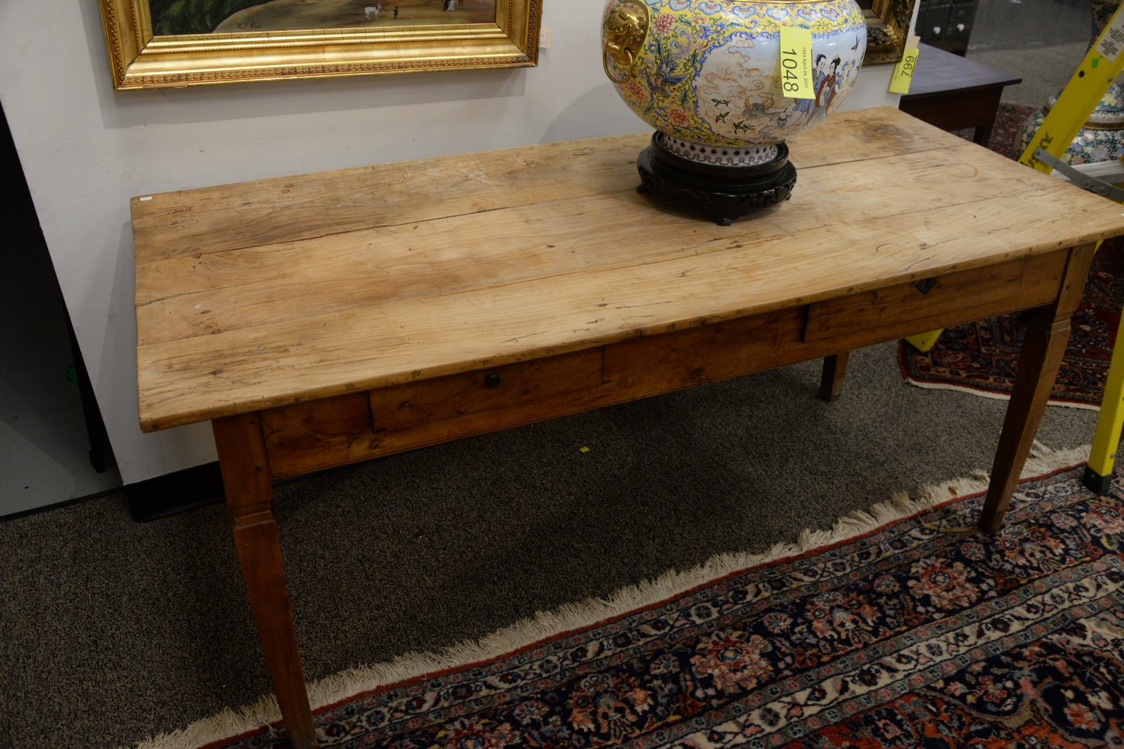 Lot 97: Country French Fruitwood Farm Table having two drawers on tapered legs, height 29 inches, width 28 inches, top 28 x 65. Provenance: The Estate of Diana Atwood Johnson.
