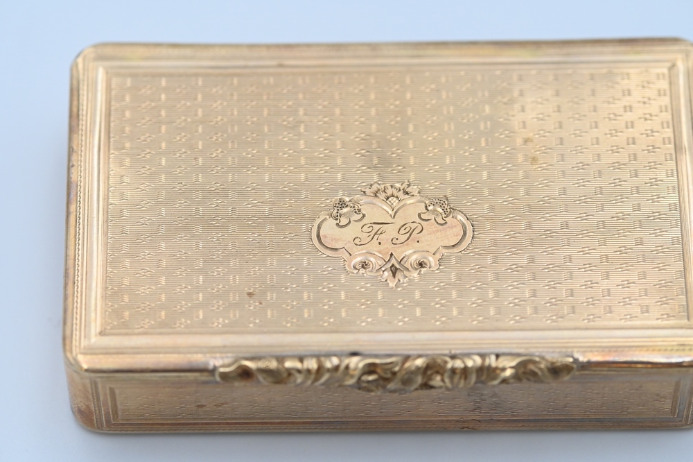 Dutch 14 Karat Gold Box, rectangular in shape with hinged lid, inscribed inside “Herrn Adolf Grimminger”, 1 5/8 x 2 3/4 x 1/2 inches, 39 grams. (small dents). Provenance: Collection of Anton Peek previously from the Hague.