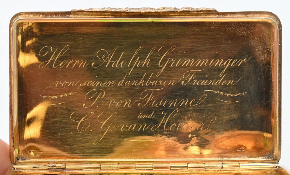 Lot 97: Dutch 14 Karat Gold Box, rectangular in shape with hinged lid, inscribed inside “Herrn Adolf Grimminger”, 1 5/8 x 2 3/4 x 1/2 inches…