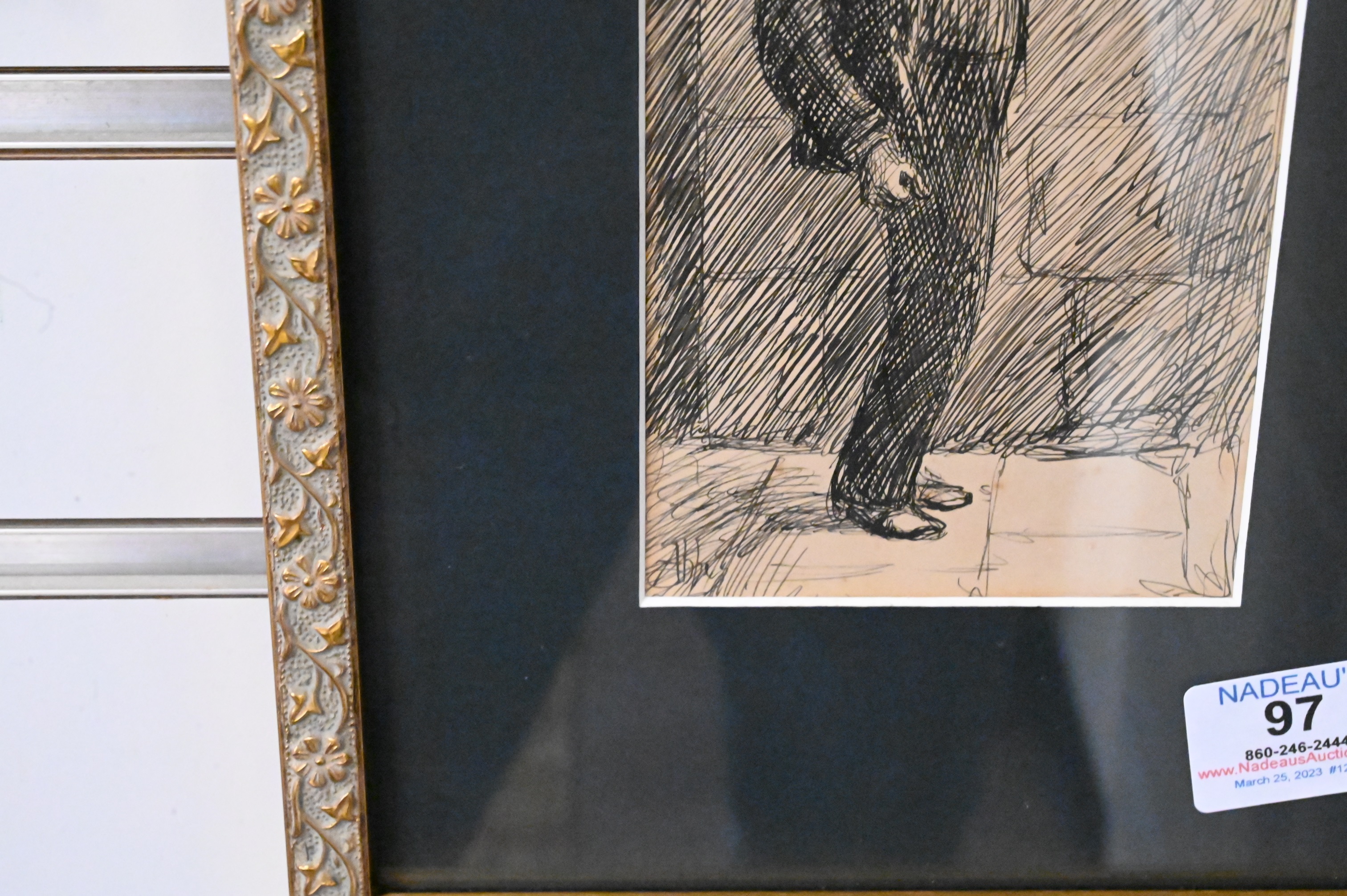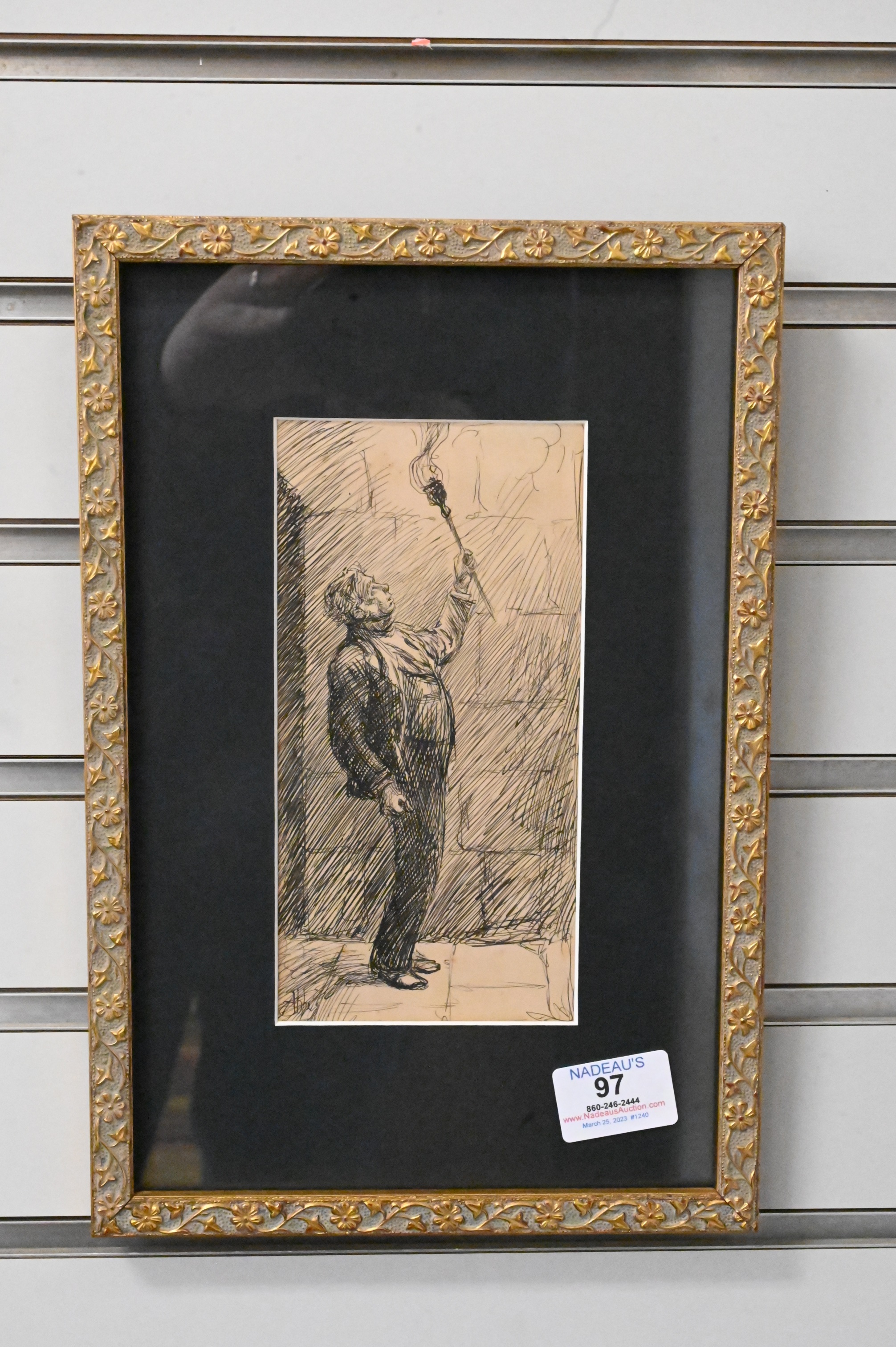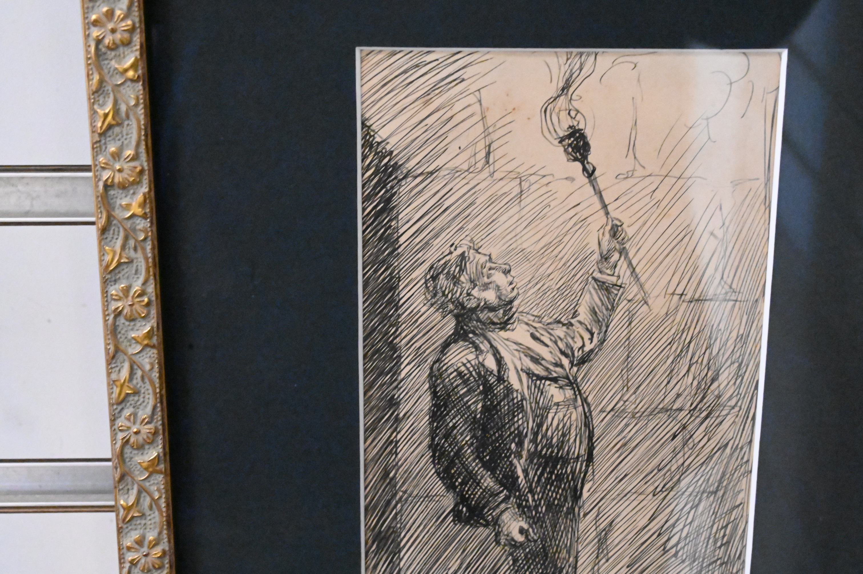 Edwin Austin Abbey (American, 1852 – 1911), pen and ink, man holding torch, signed Abbey lower left, 7 1/2″ x 3 3/4″.
