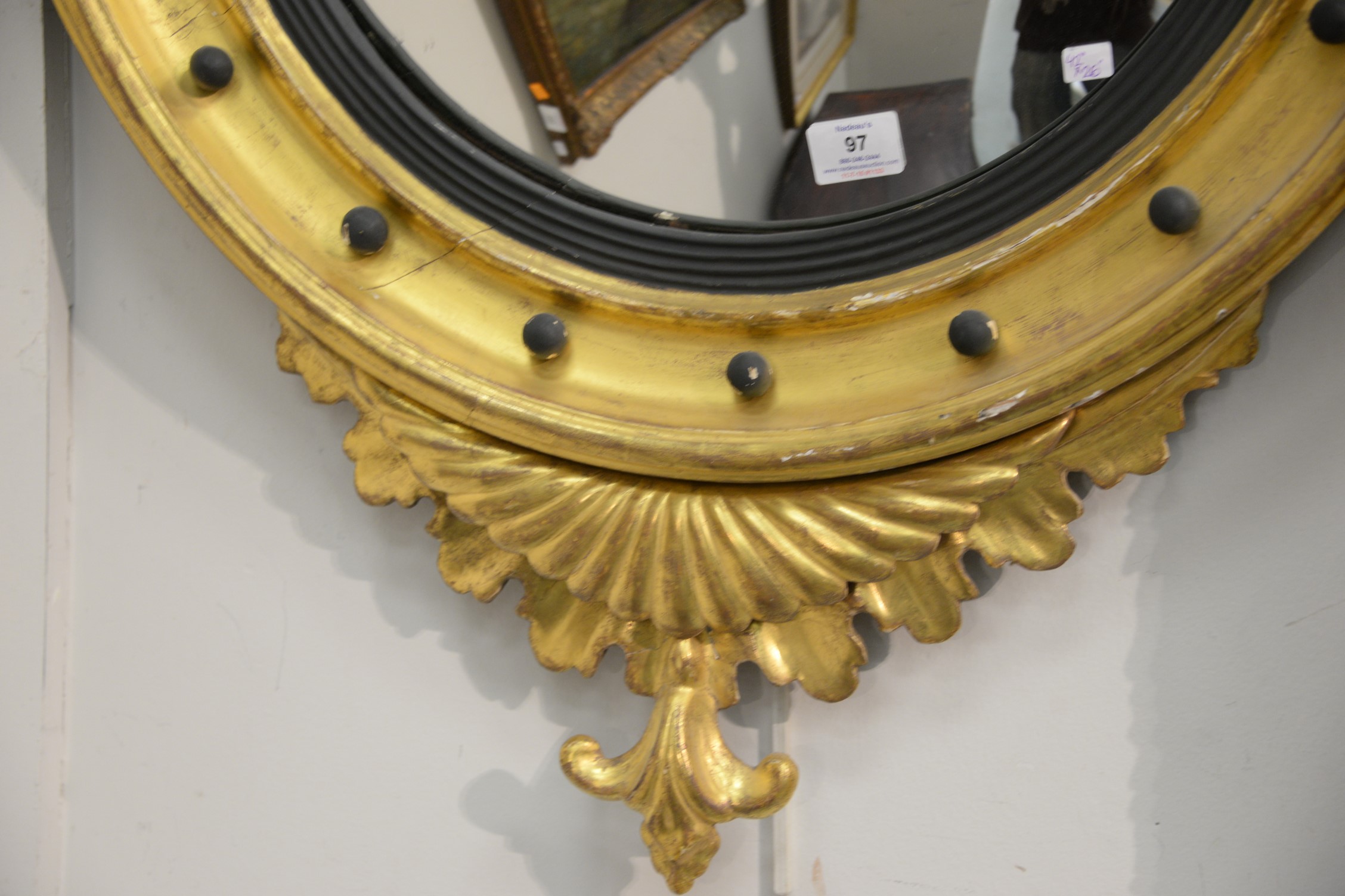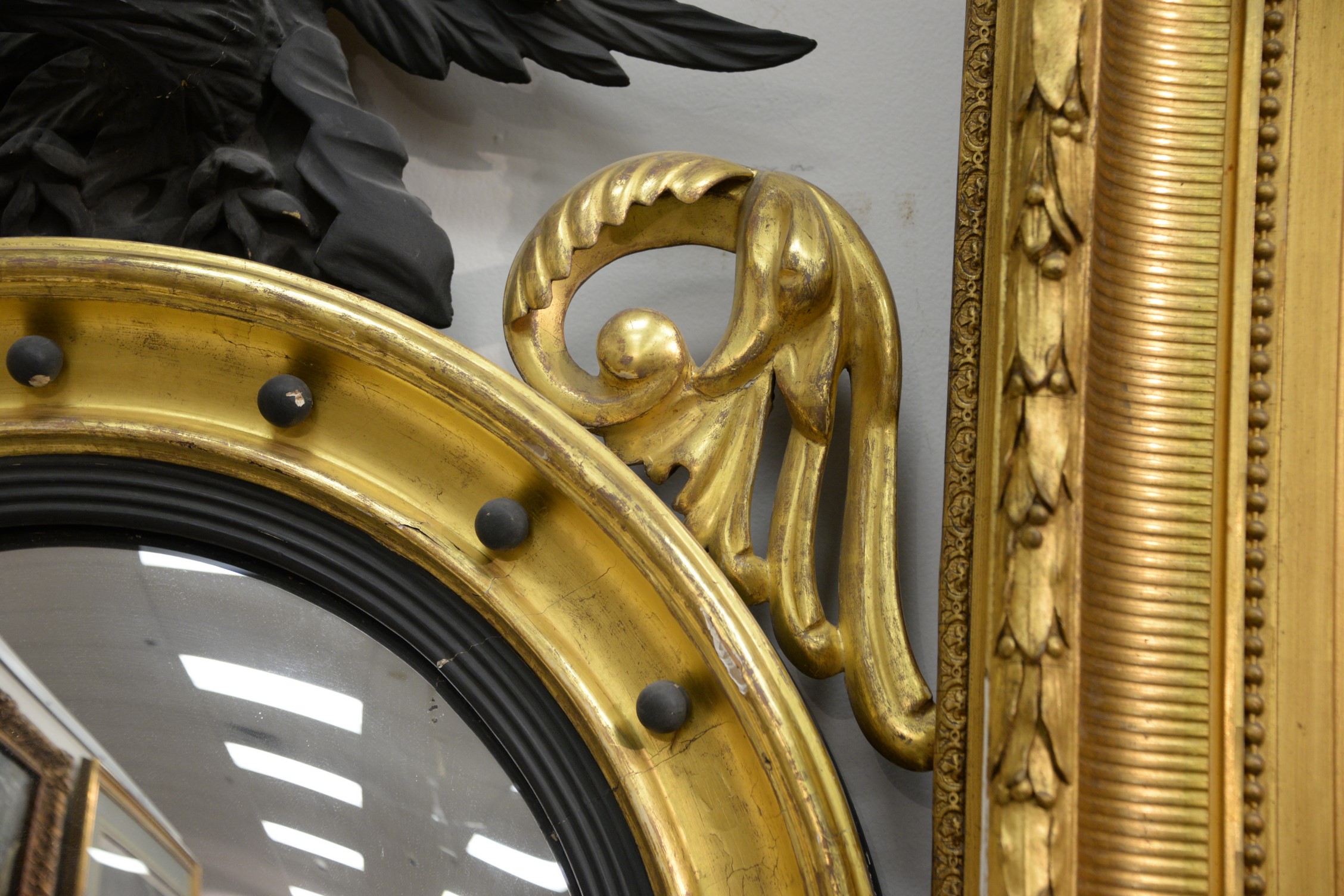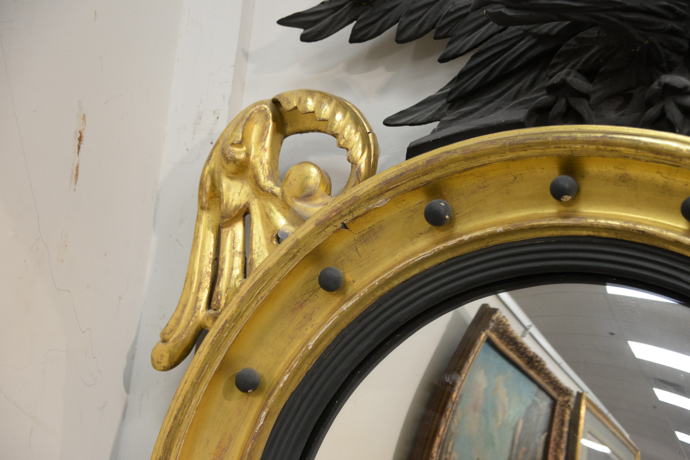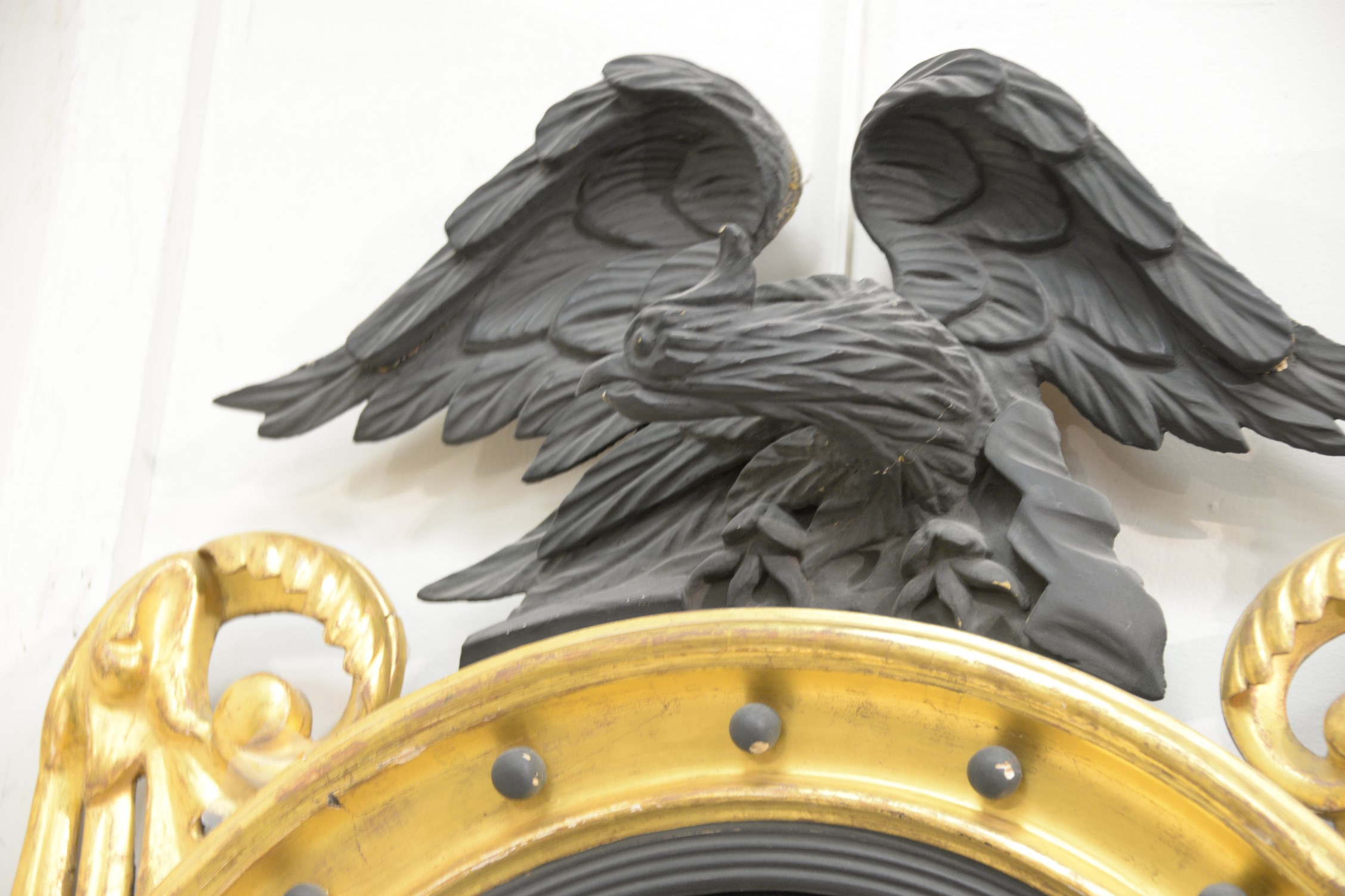 Lot 97: Federal Girandole mirror, top eagle in flat black paint and mirror surround in original gilt, circa 1820. ht. 42 in. dia. 26 in….