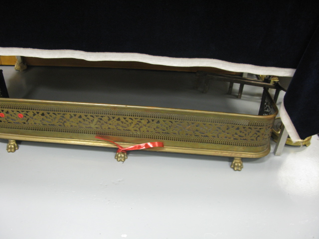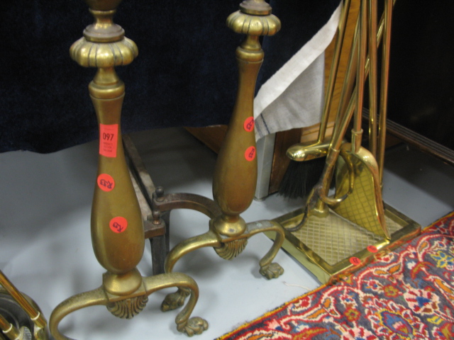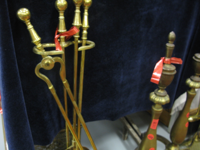Fireplace equipment to include pierced fire fender, two sets of tools and a set of andirons