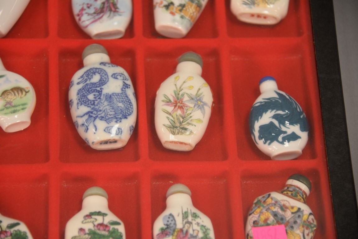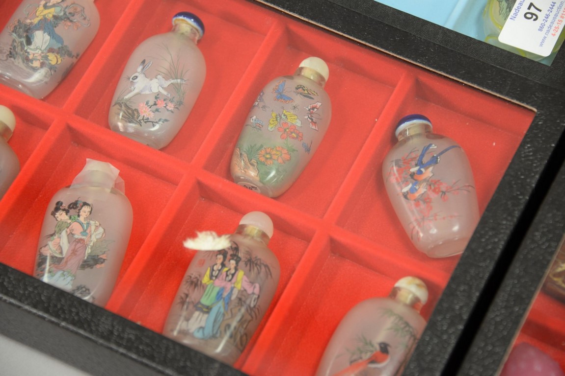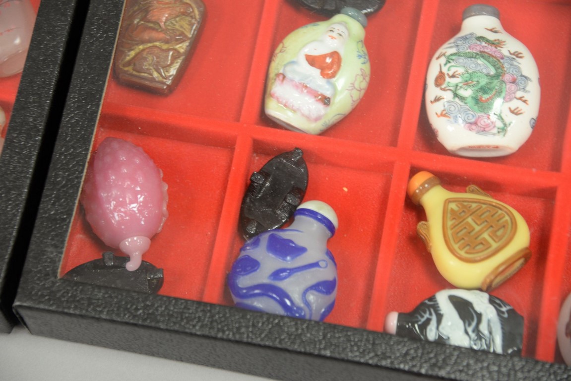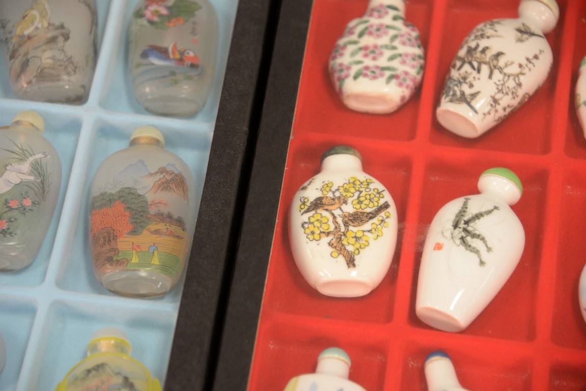 Four trays snuff bottle collection, 61 pieces, porcelain and reverse painted.