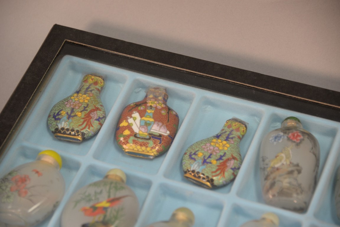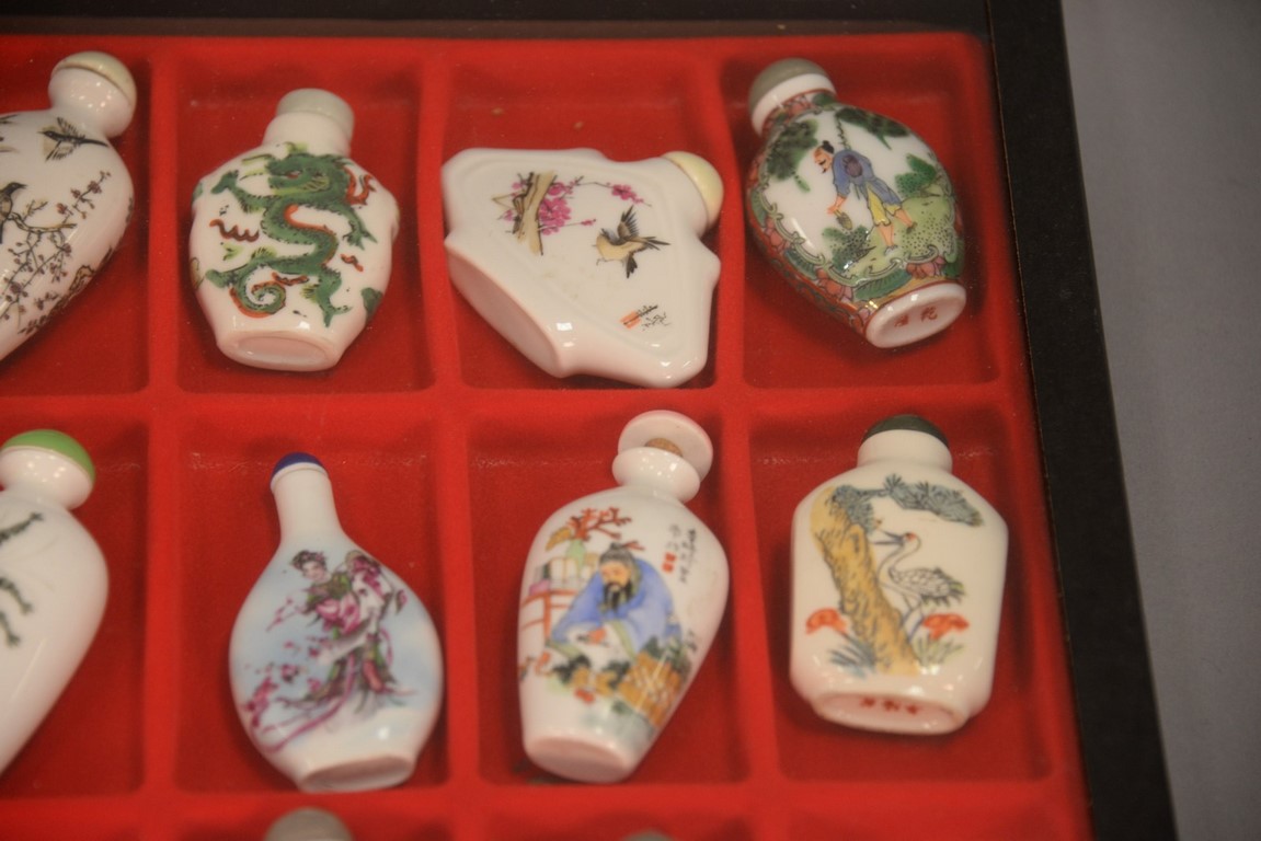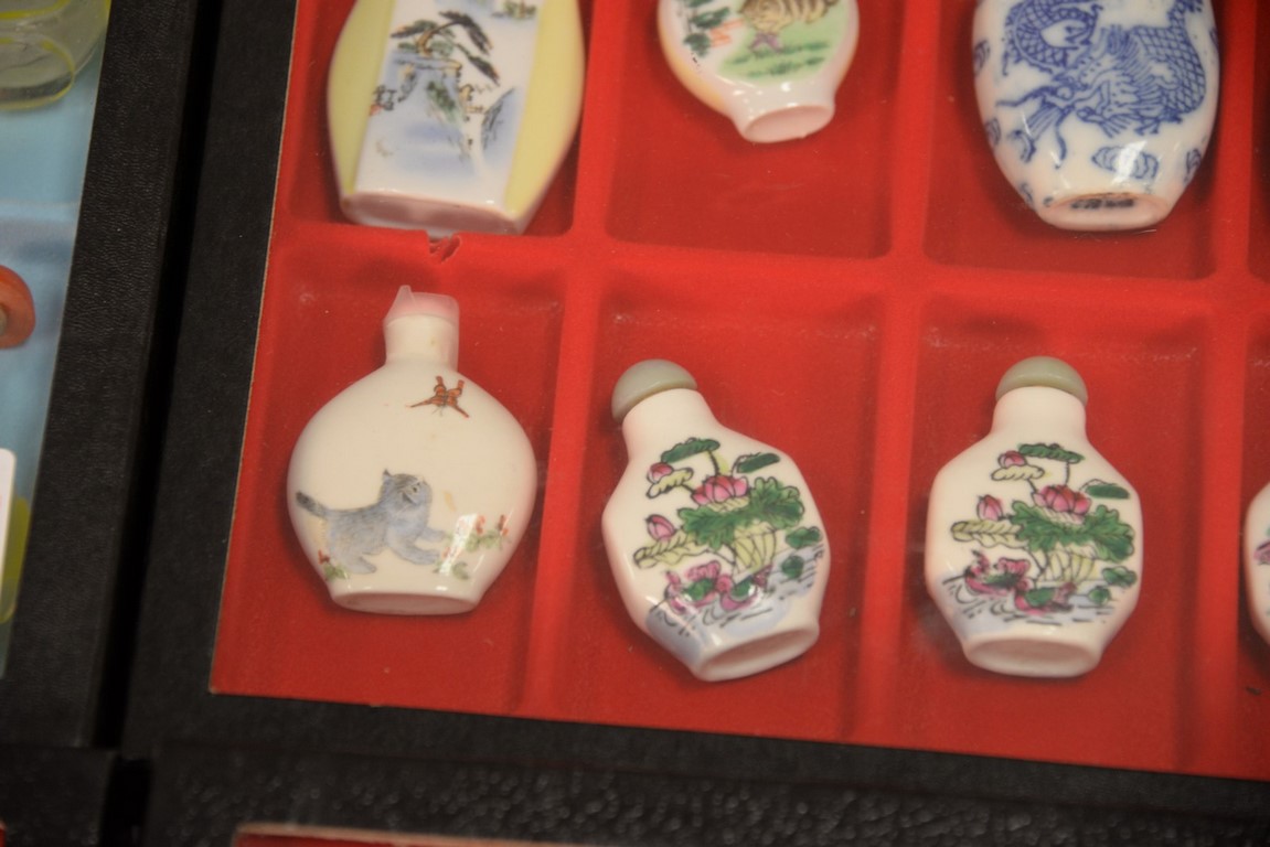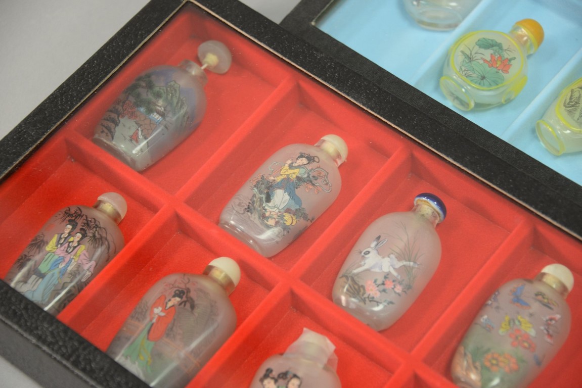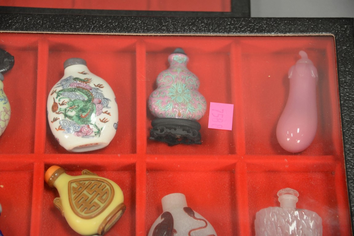 Four trays snuff bottle collection, 61 pieces, porcelain and reverse painted.