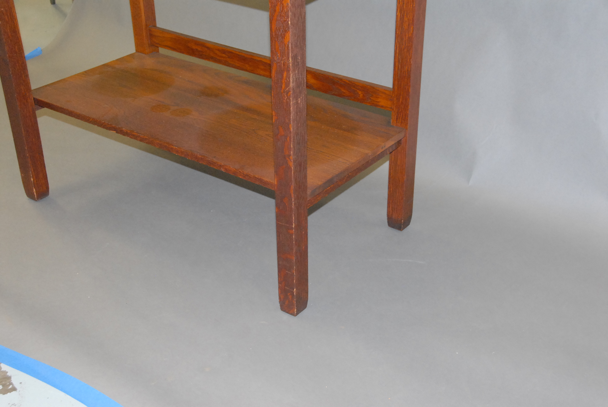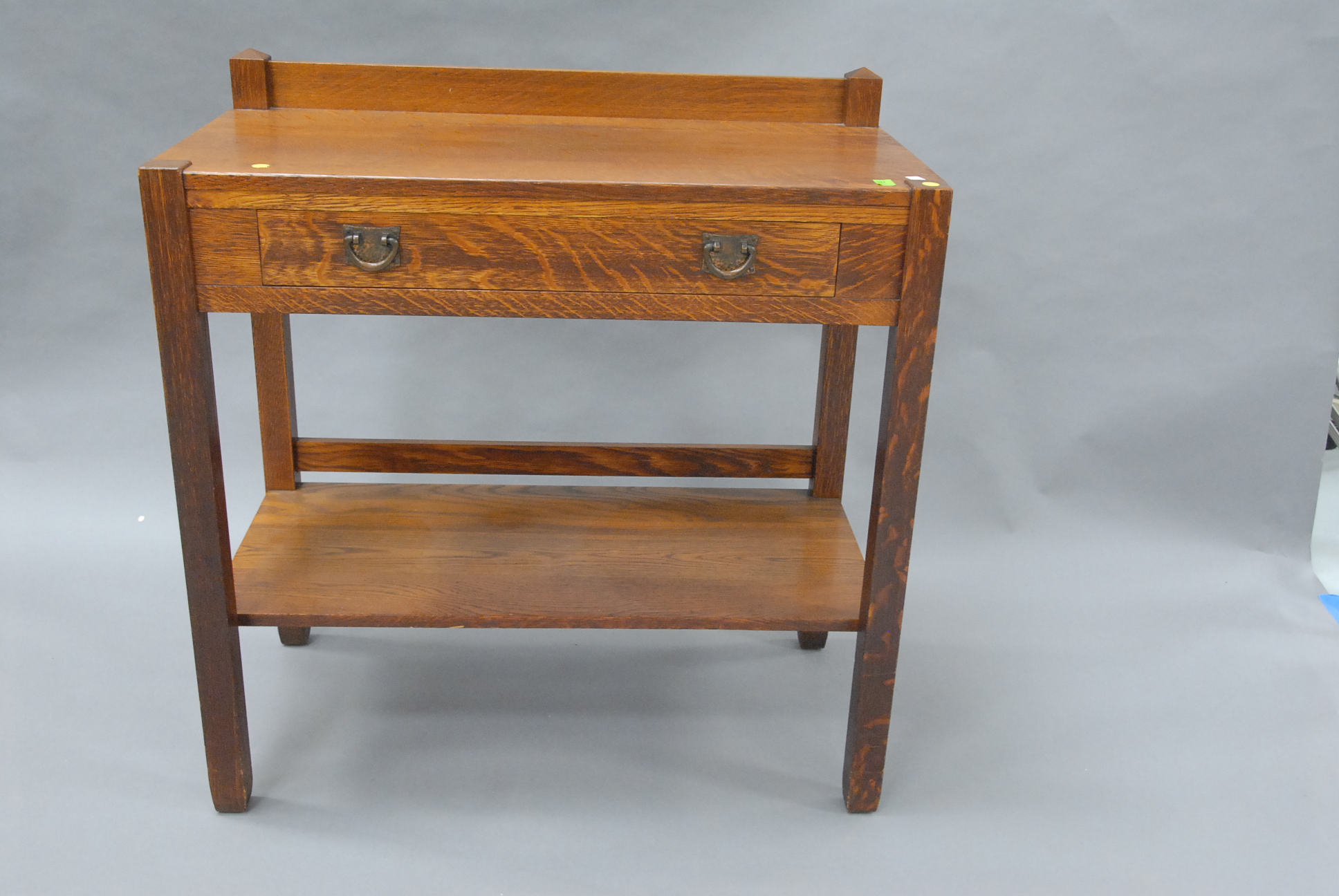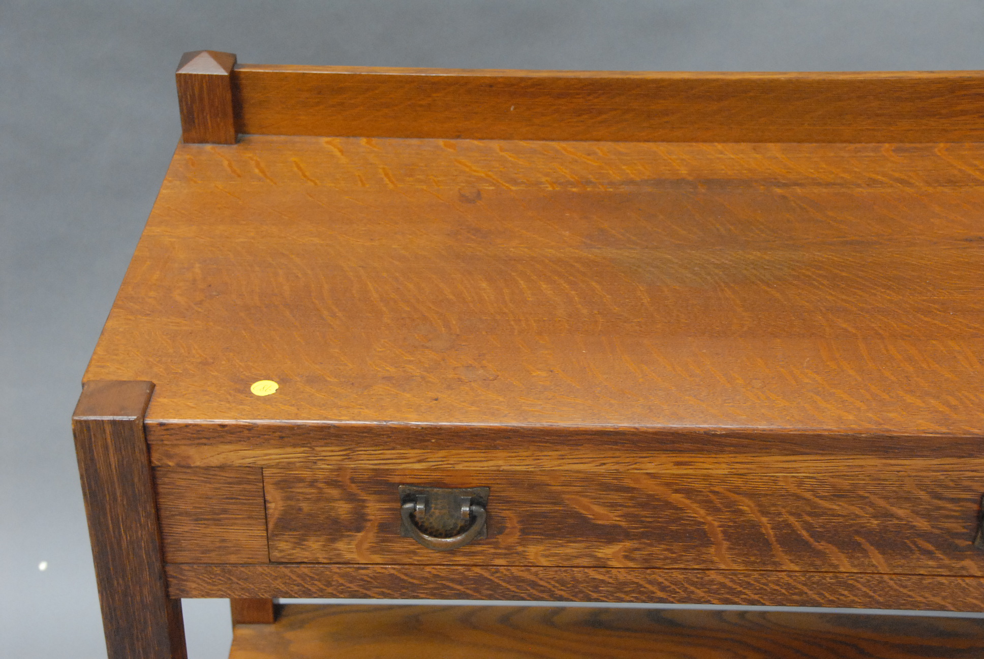 Oak arts and crafts server with drawer and original copper hardware, marked on reverse Quaint Furniture, Stickley Brothers Company, Grand Rapids, Michigan, also stamped Stickley Brothers Grand Rapids, Michigan.