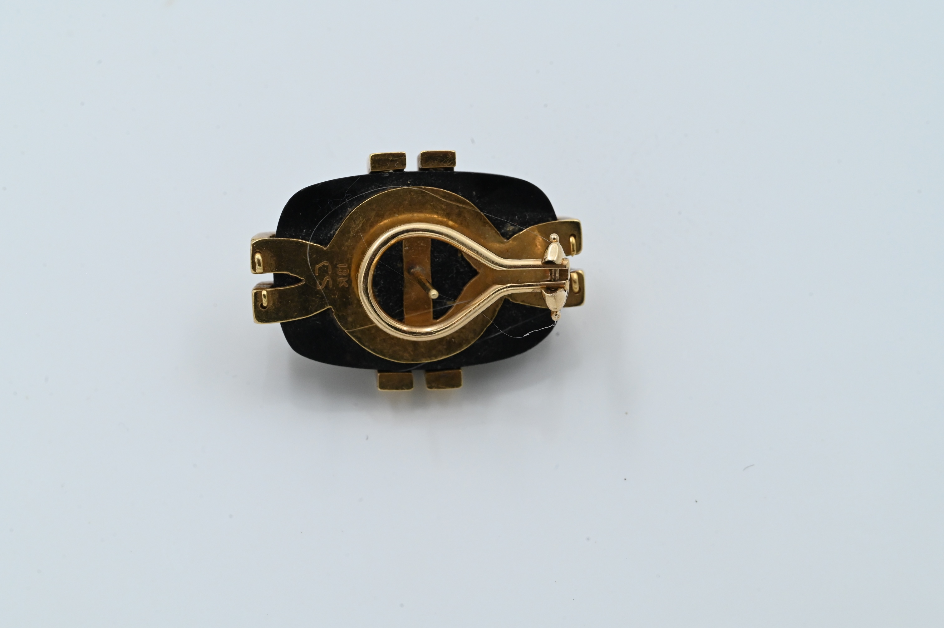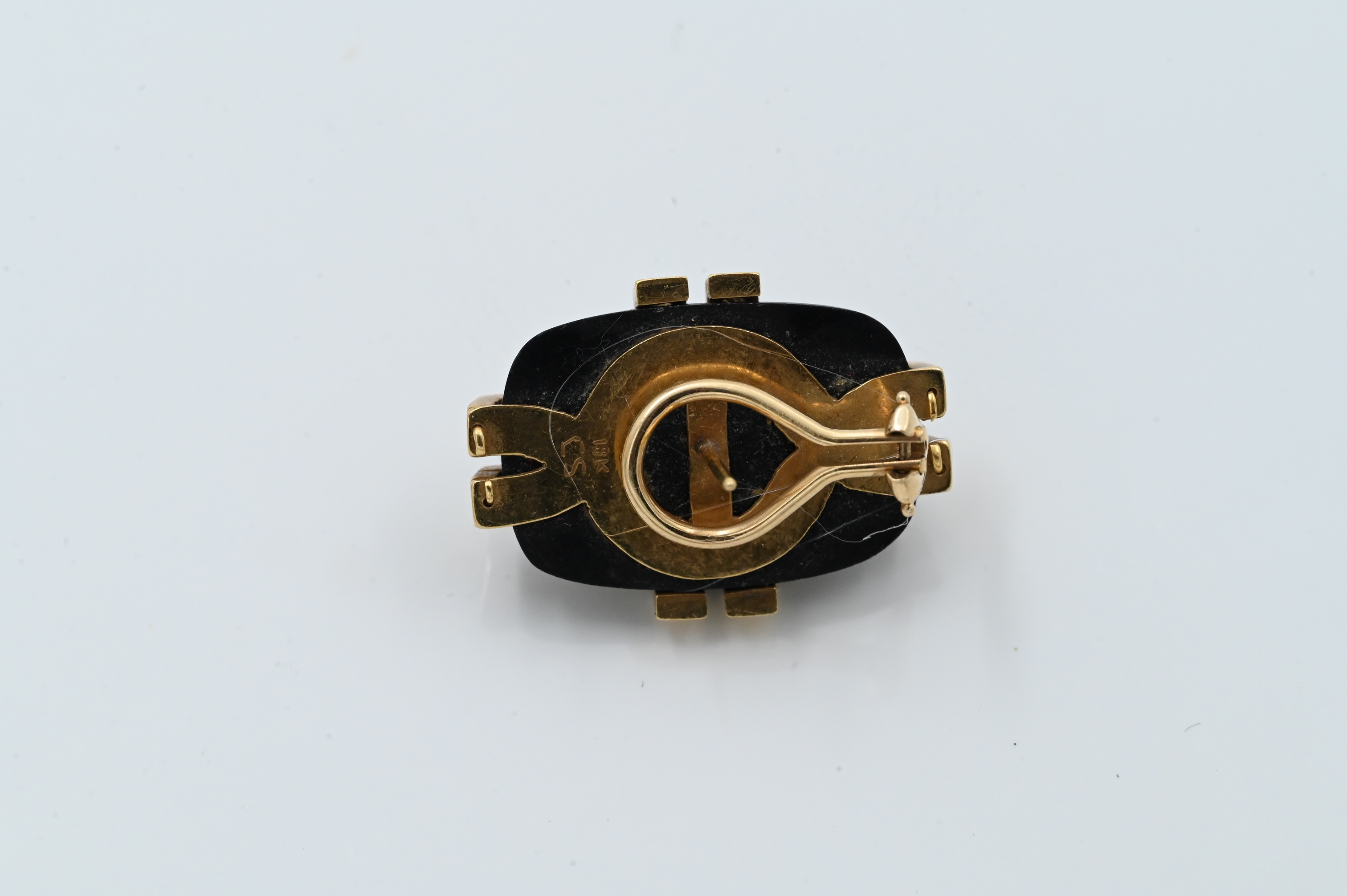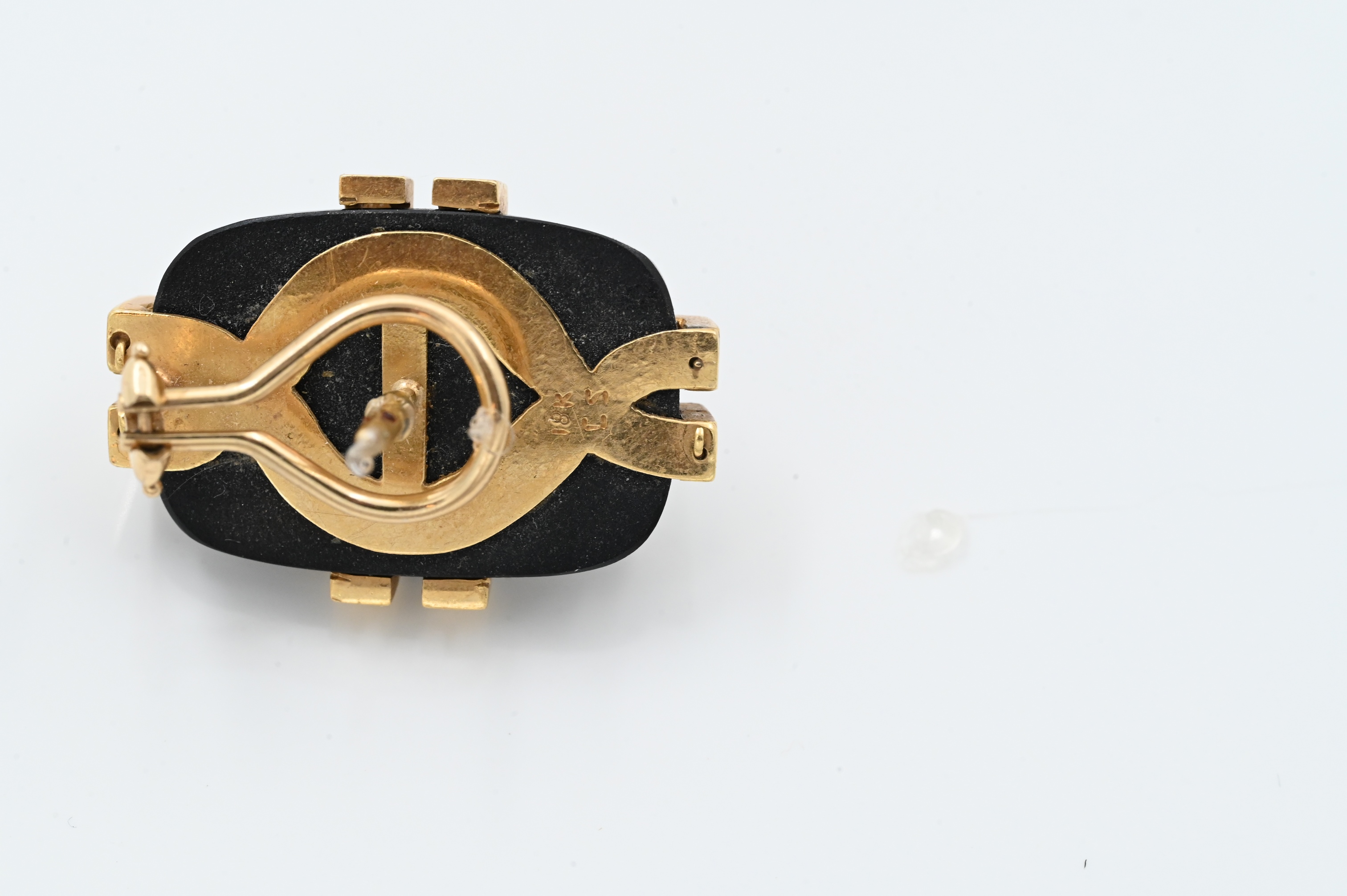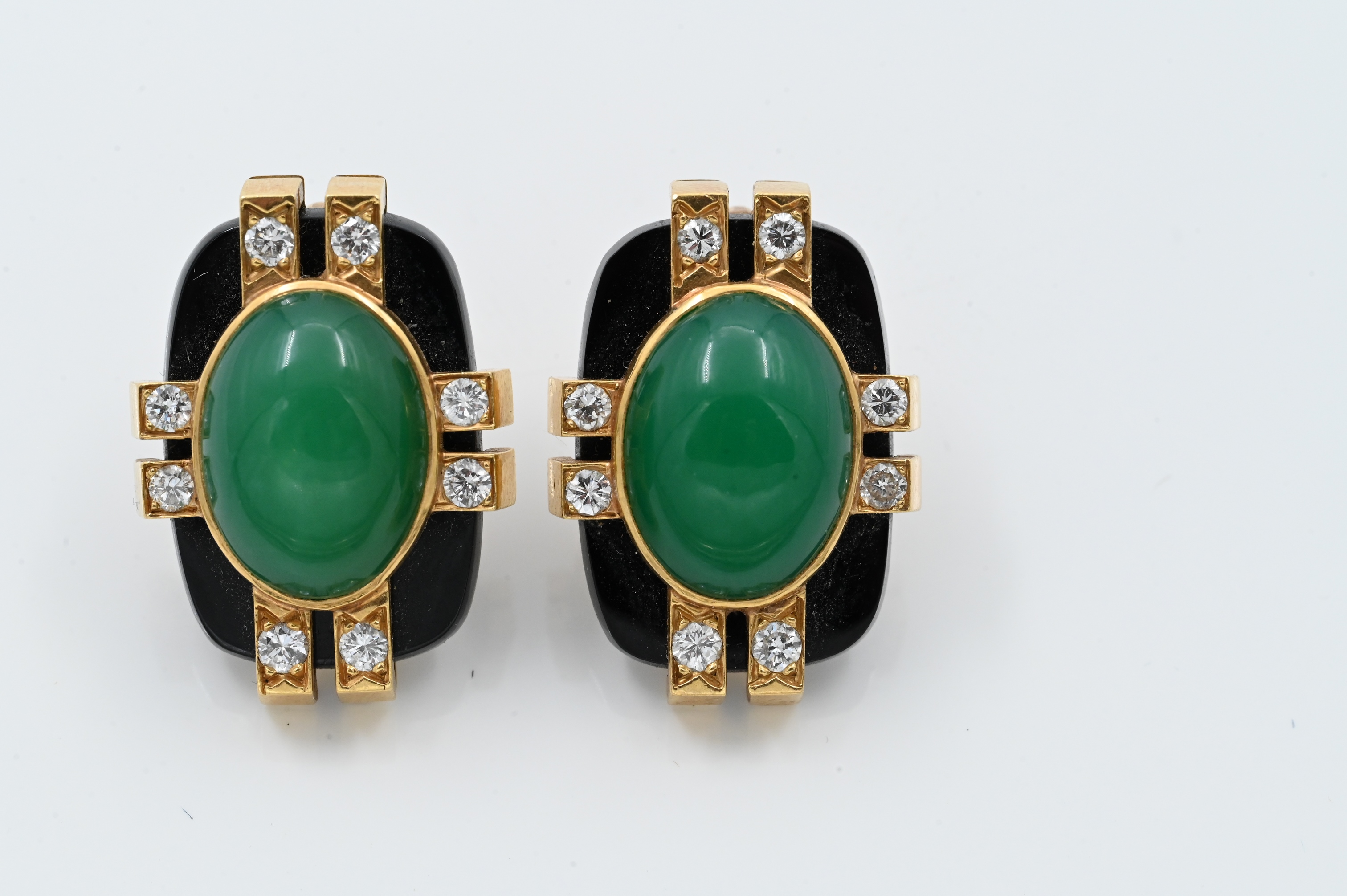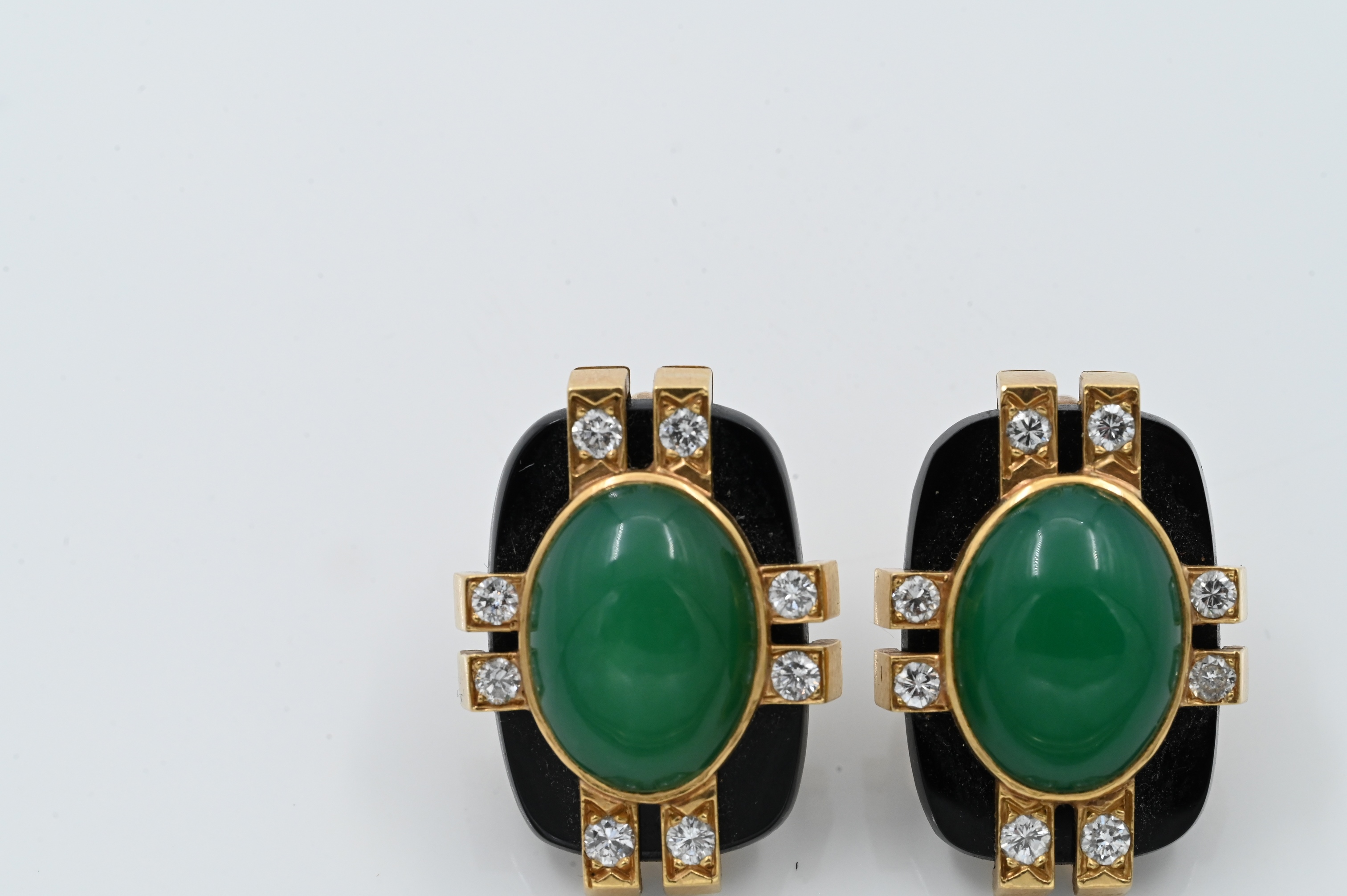 having cushion shaped onyx tablets, center 16 mm x 12 mm oval shaped cabochon cut chrysoprase accented by eight diamonds on each, total approximately 1.10 carats, marked “CS 18K”