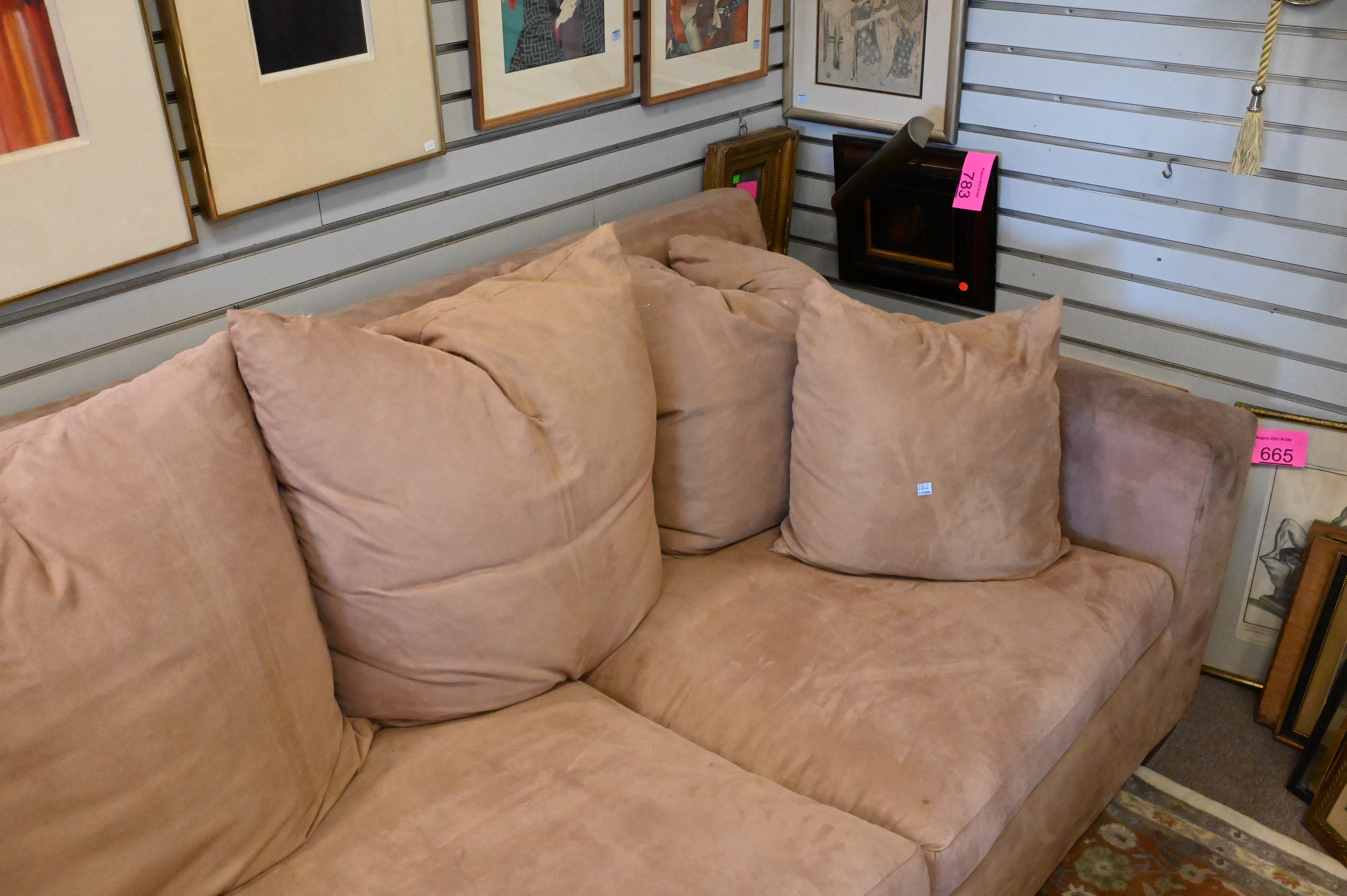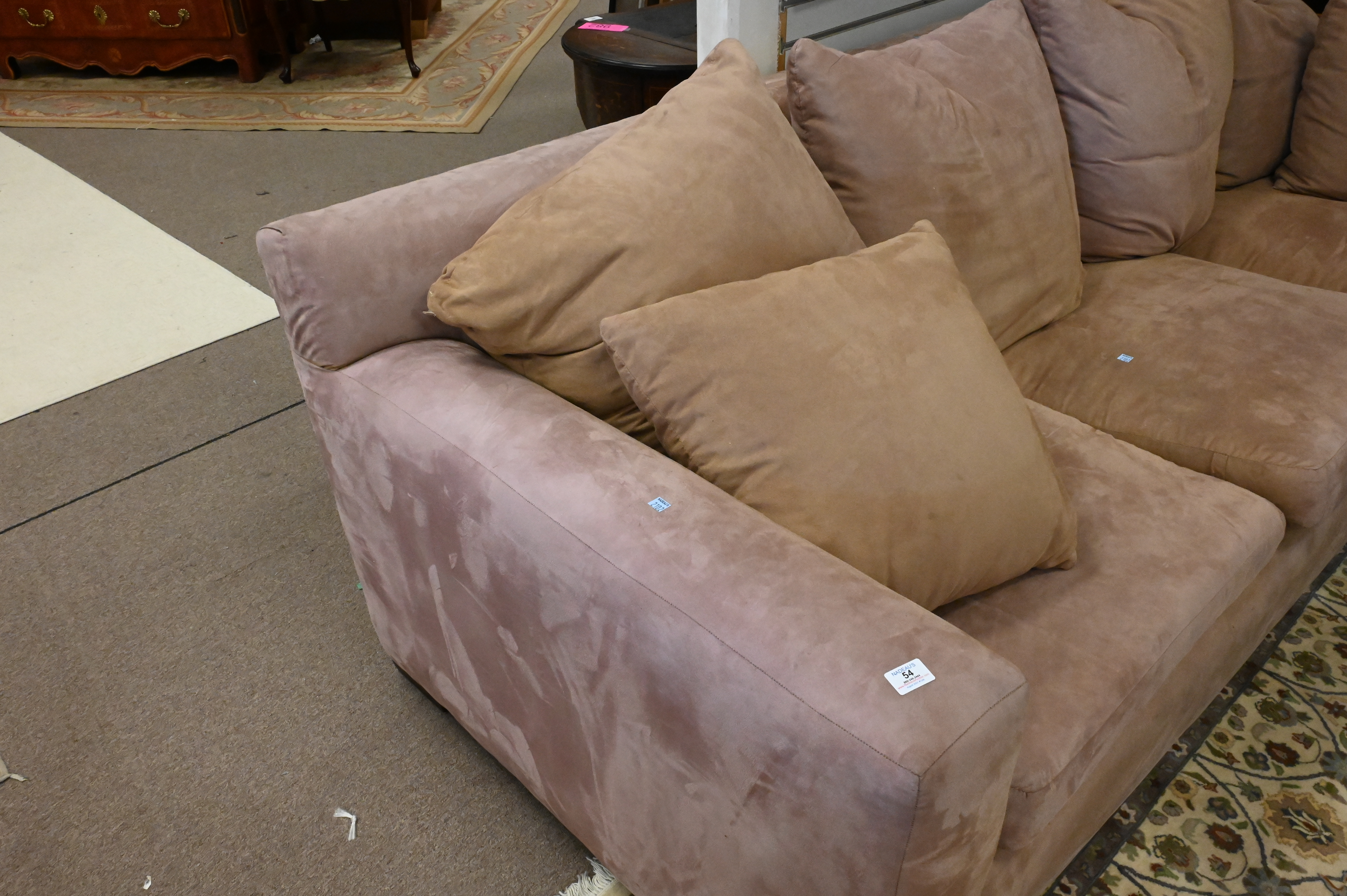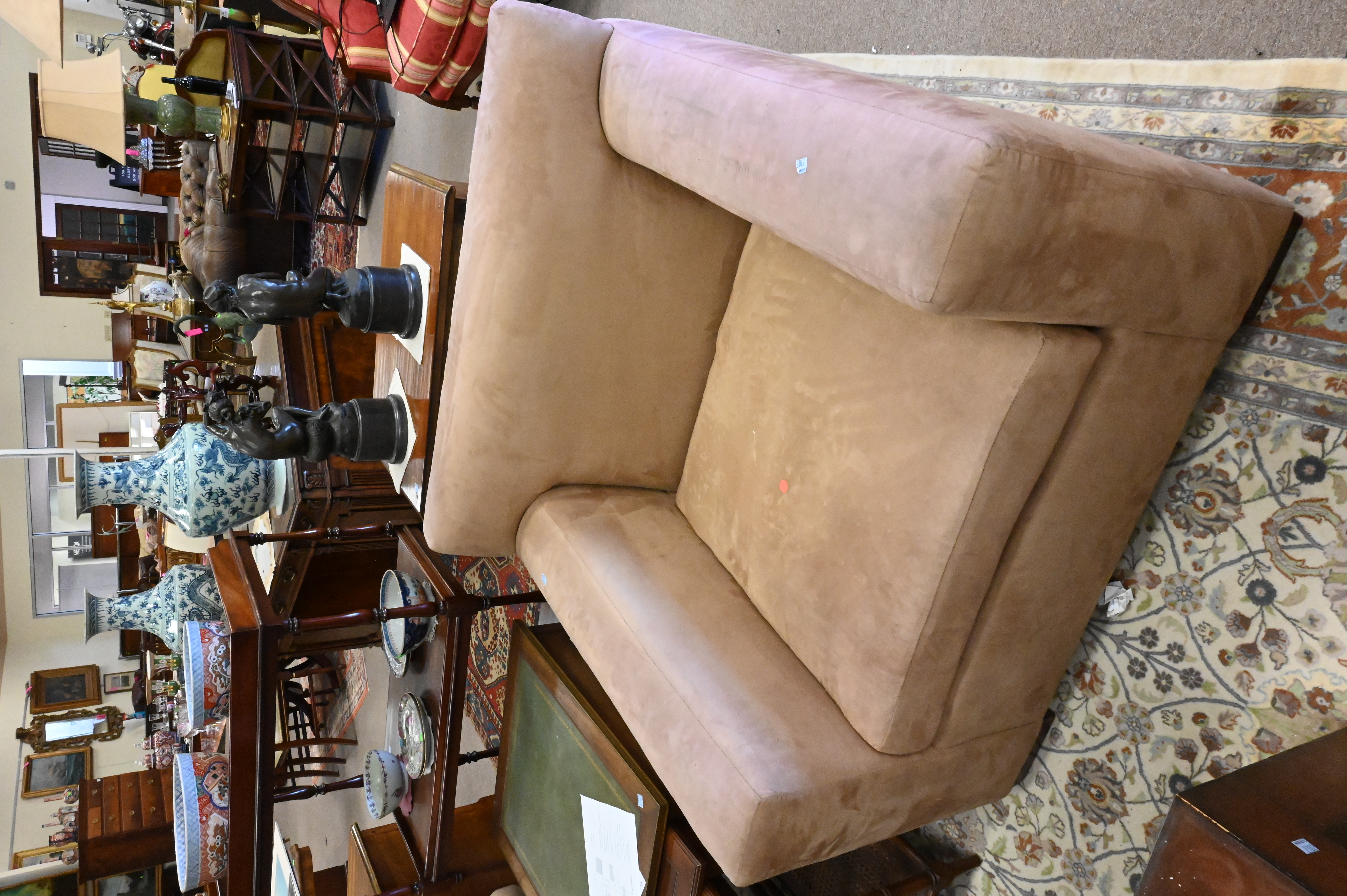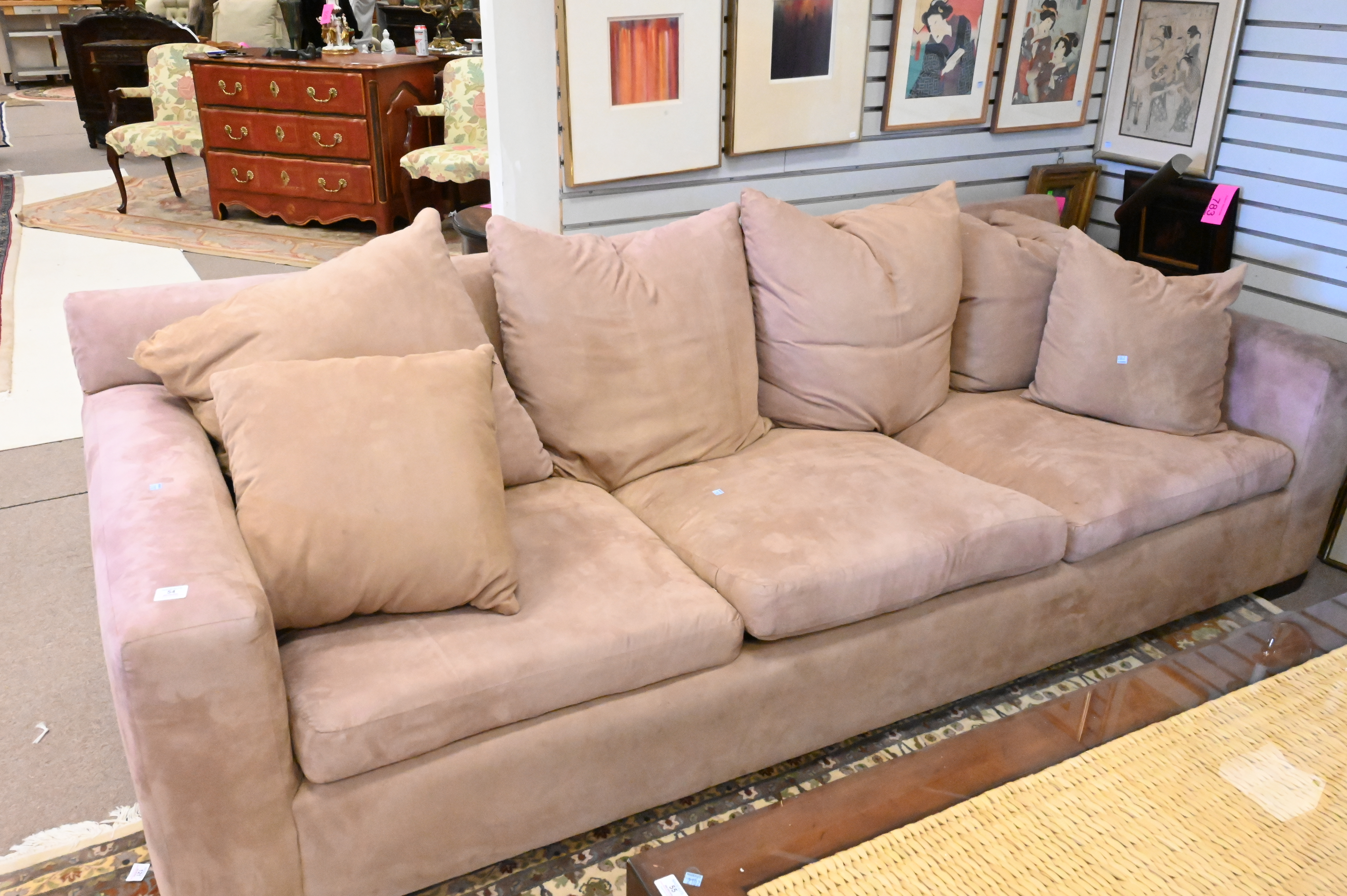 Ralph Lauren Two Piece Set, to include a sofa and armchair with suede style upholstery, soiled and fading, sofa height 32 inches, length 100 inches.