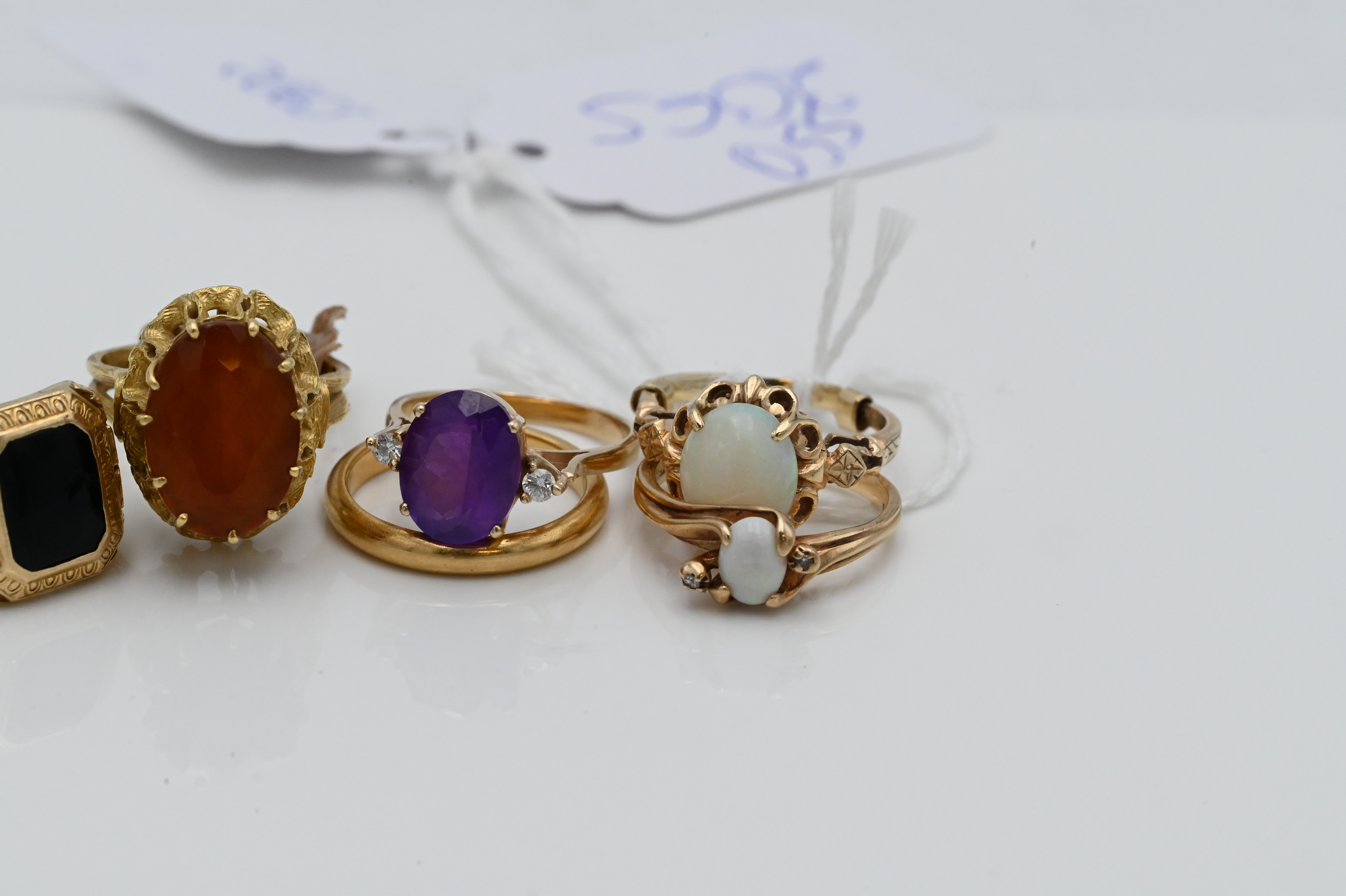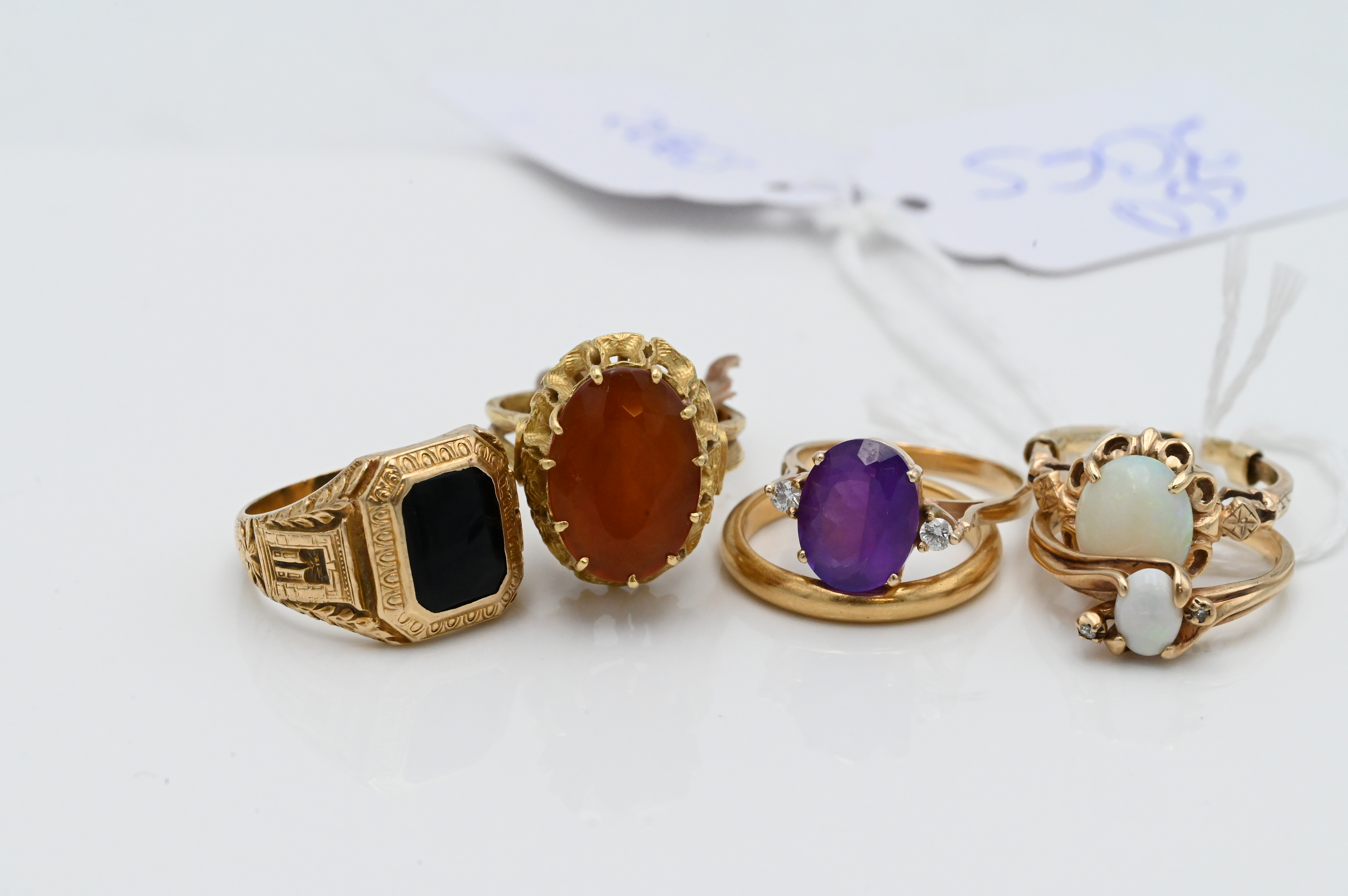 Six Gold Rings, having various stones, to include one Tiffany & Company 18 karat gold band, 7 1/2, 6, 6 3/4, 6, 6 3/4, 5; 27 grams total weight.