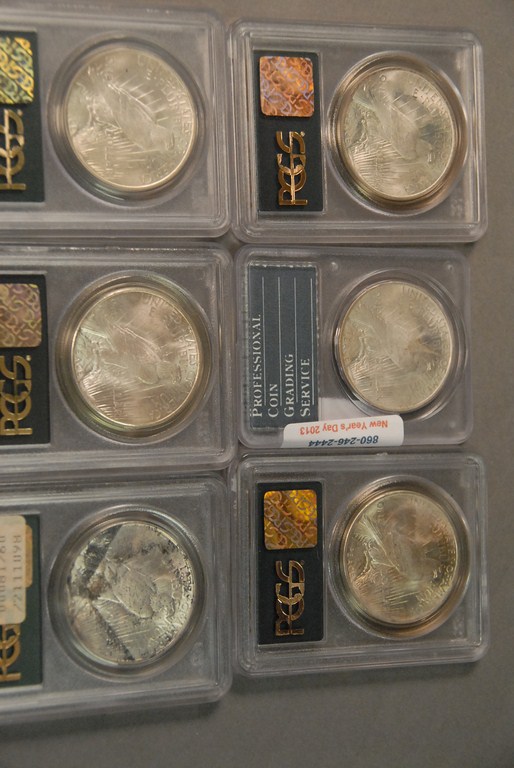 Six silver dollars 1922 PCGS 63, 1922 PCGS 63, 1922 PCGS 63, 1922-D PCGS 63, 1922-S PCGS 62, and 1923 PCGS 63.