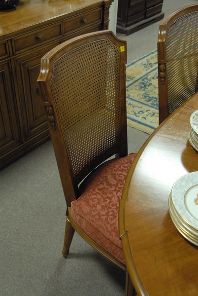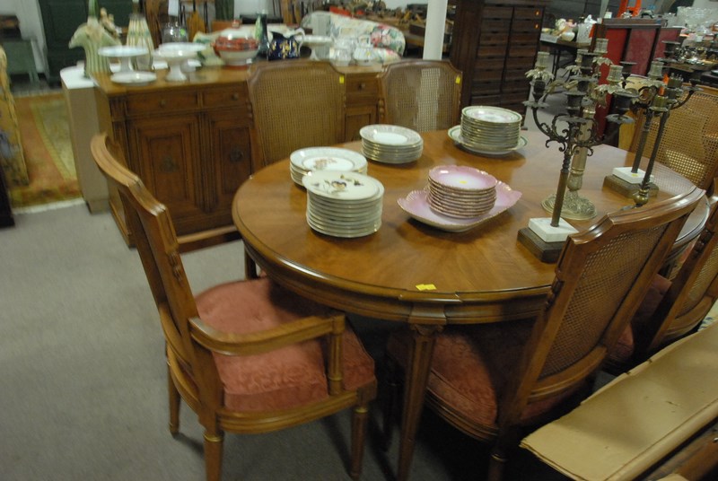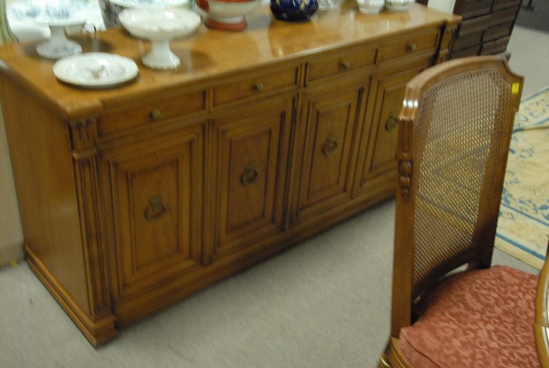 Lot 97: Ten piece lot to include an eight piece Henredon dining set including table with two large leaves, sideboard, and six chairs along w…