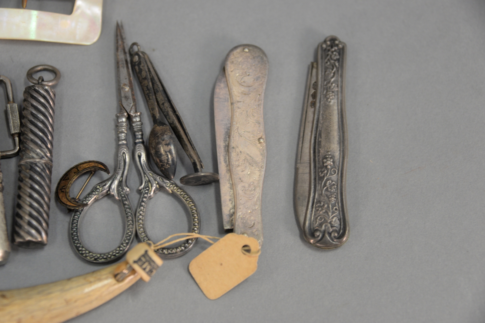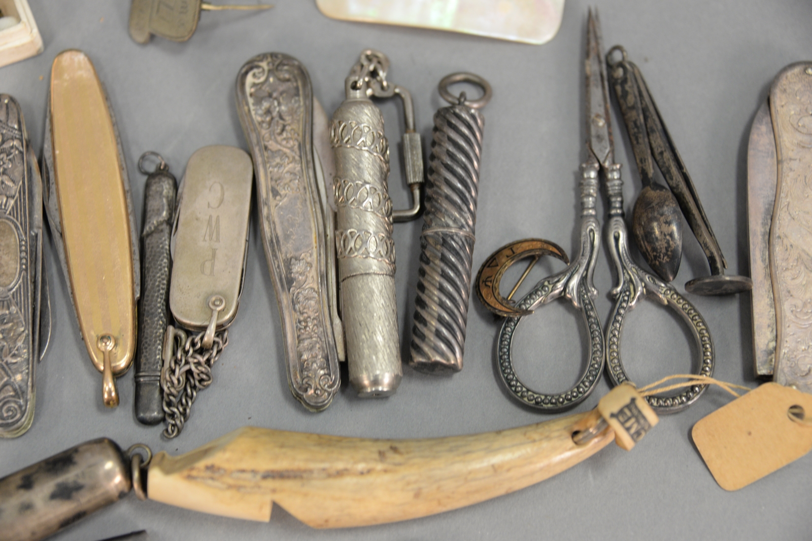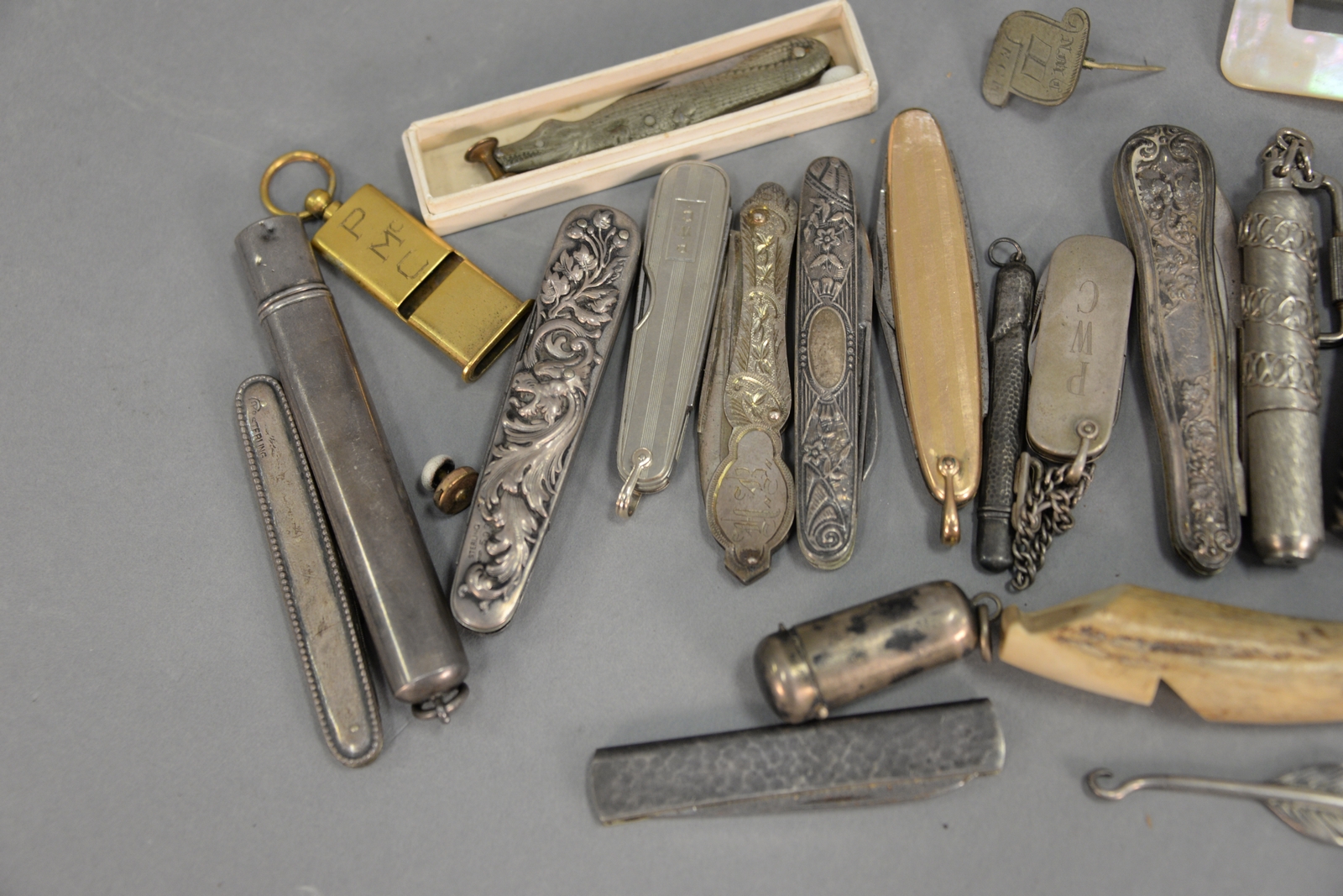 Ten sterling or silver pocket knives retractable pen, sterling feather pick, horn whistle, and gold pocket knife.