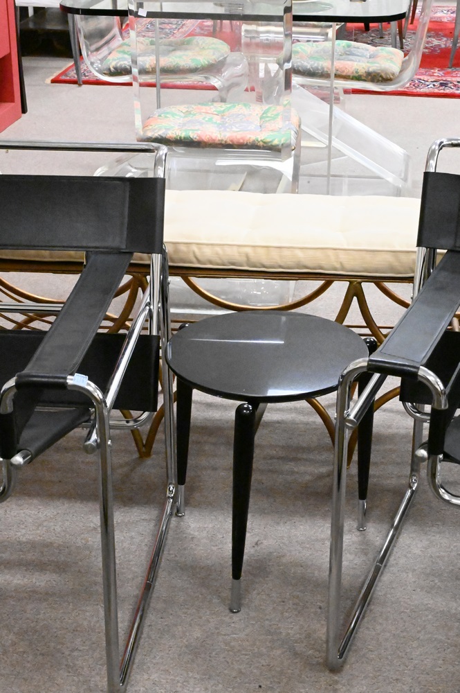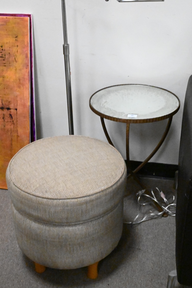 Lot 97: Three Piece Lot, to include a mirrored side table, height 22 1/2 inches, diameter 16 1/2 inches; upholstered stool; along with a contemporary side table having granite top.