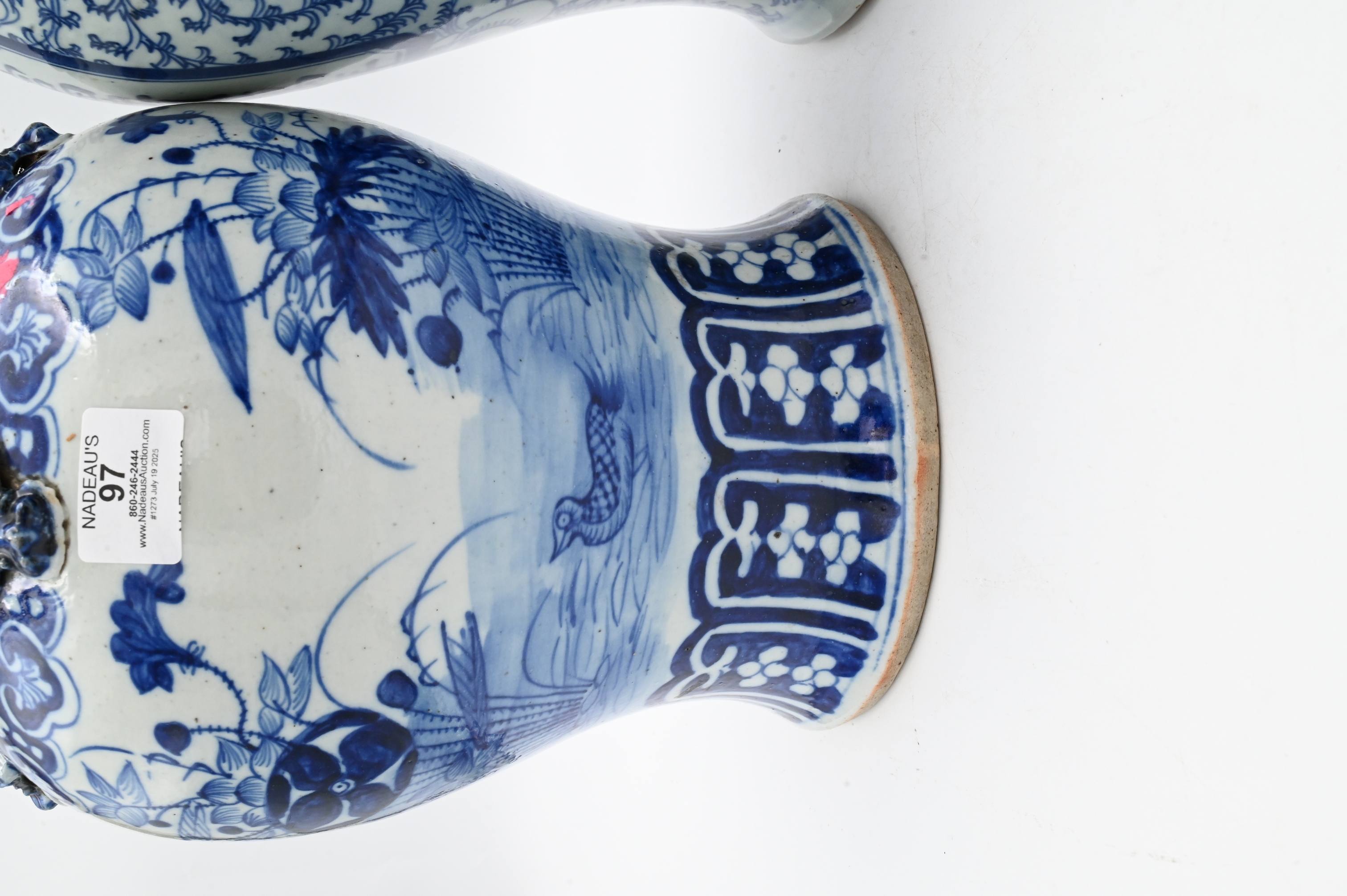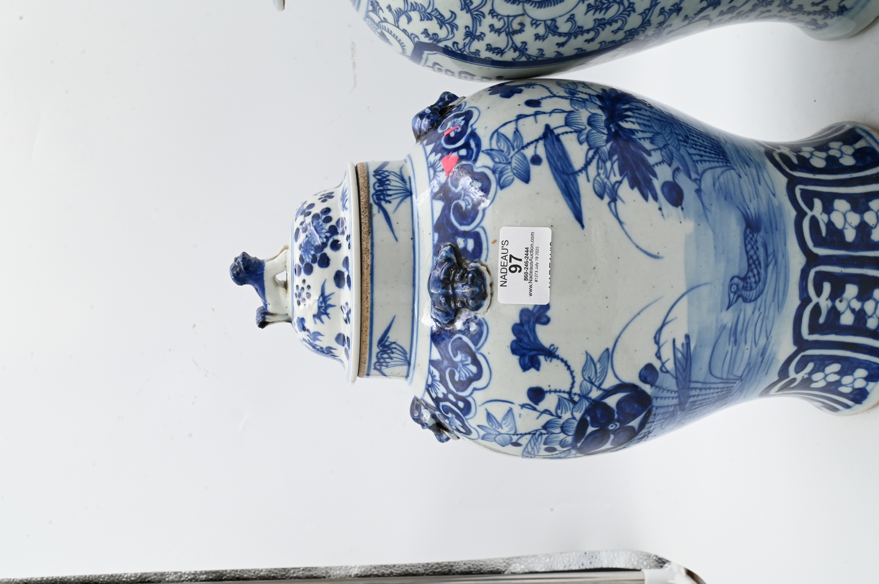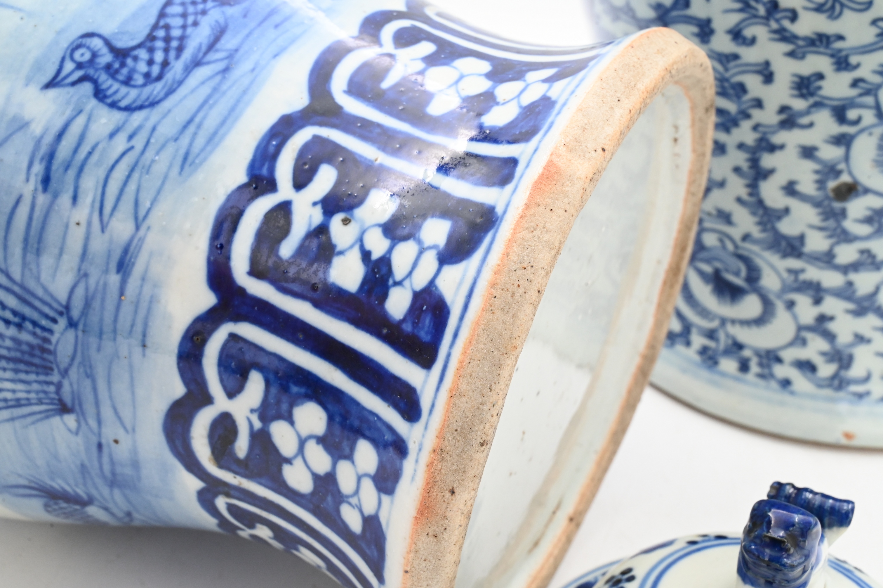 both of baluster form, one having foo dog lid finial and pond scene featuring ducks and lotus flowers, the other having scrolling vine motif