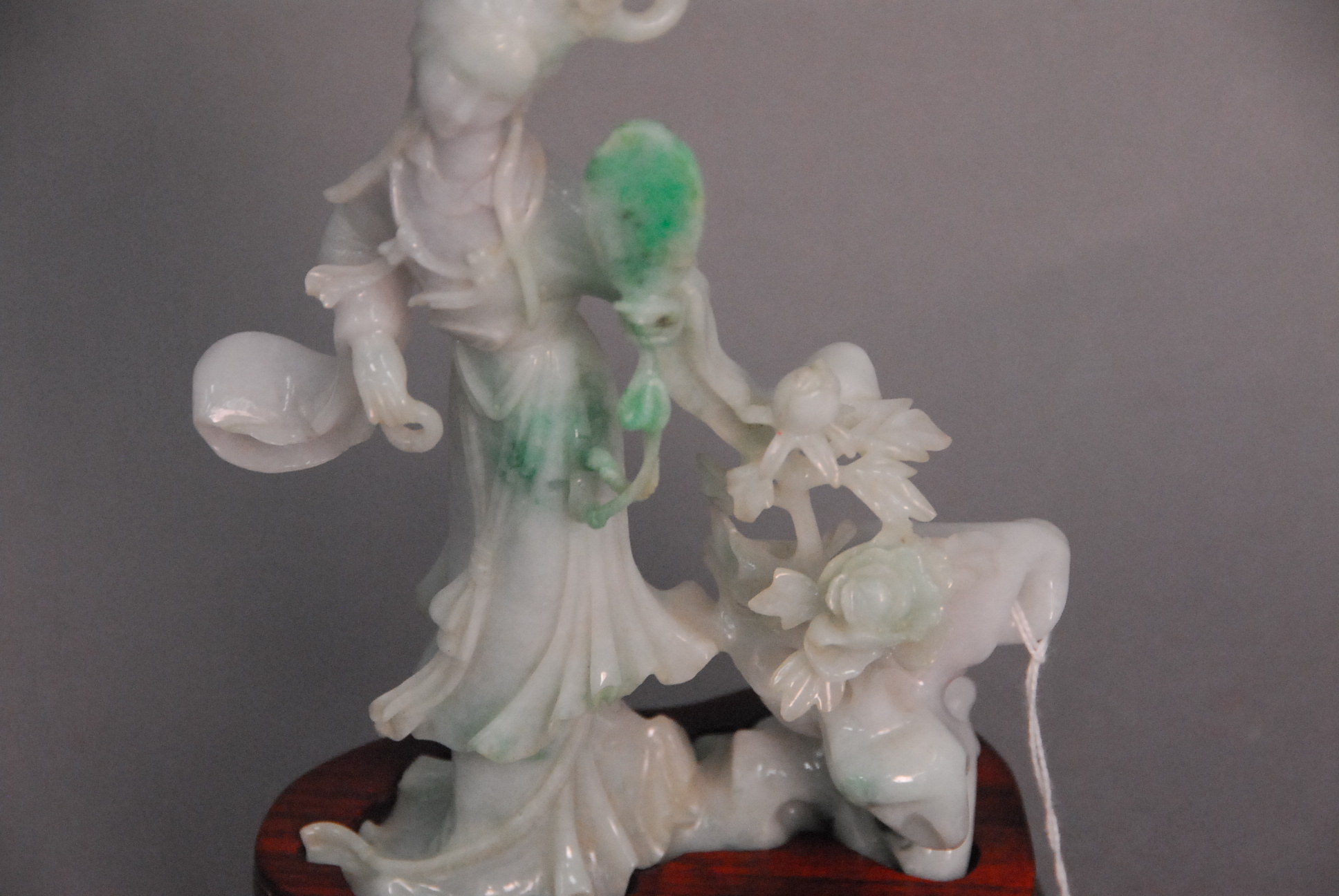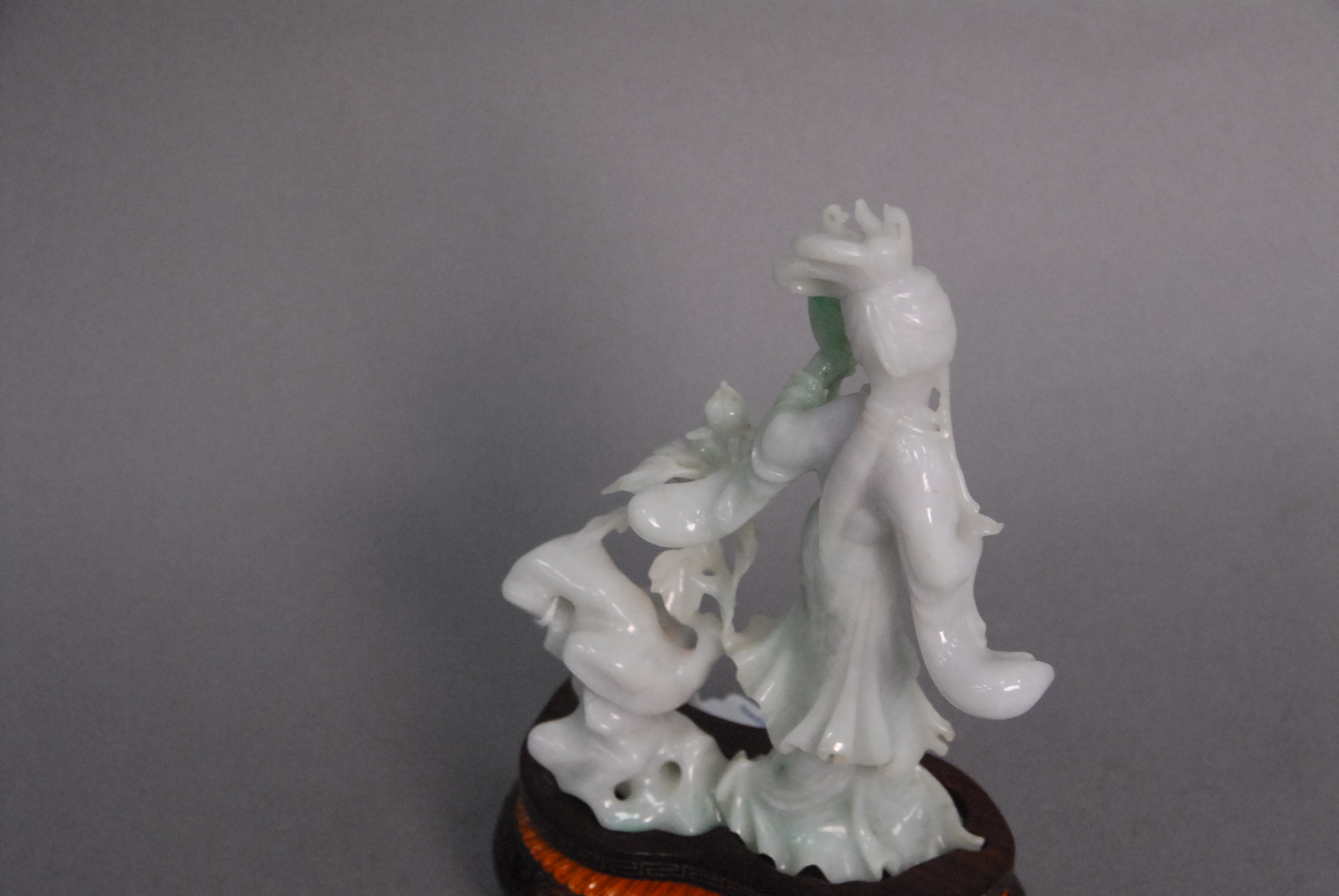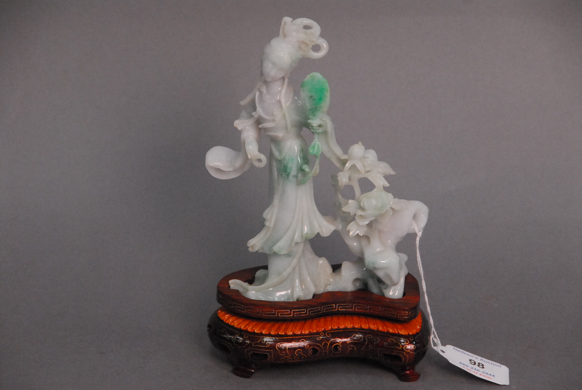 Lot 98: Carved white and green jade guanyin figure holding mirror standing along blossoming flowers, ht. 6 3/4 along with carved wooden base.