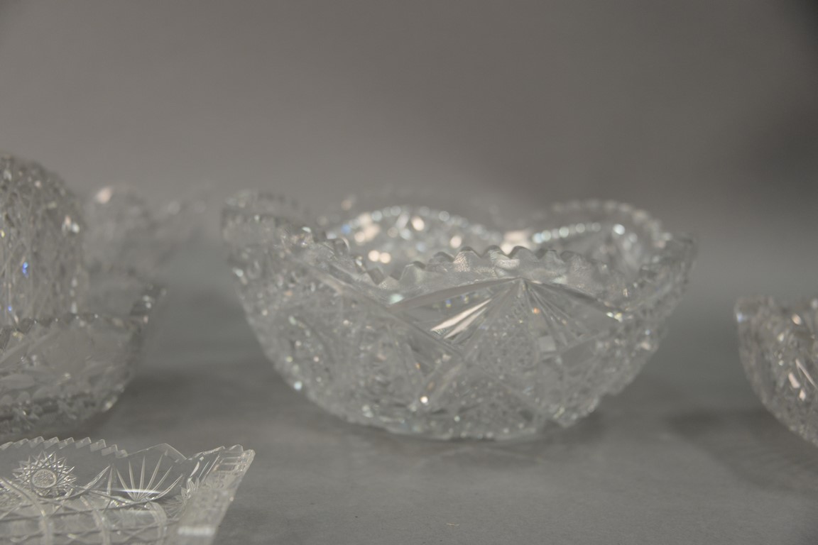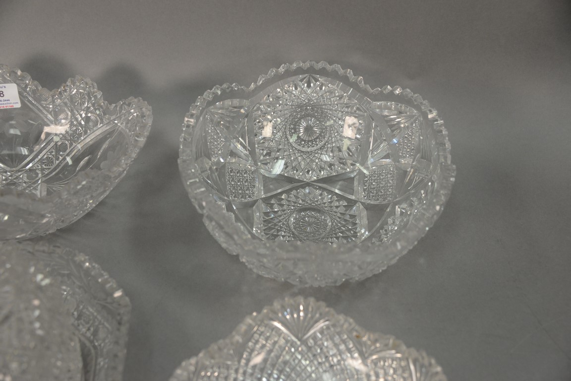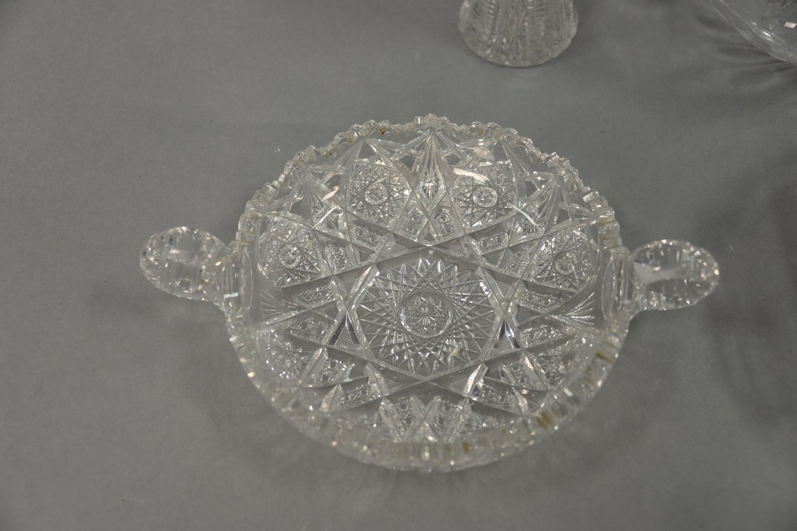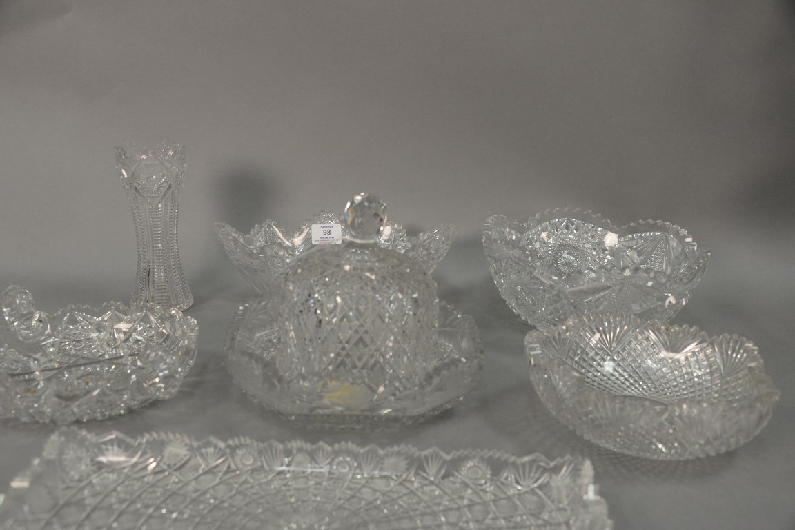 Lot 98: Eight cut glass pieces to include five bowls, tray lg. 15 3/4in.,dome, and vase ht. 7 1/2in..