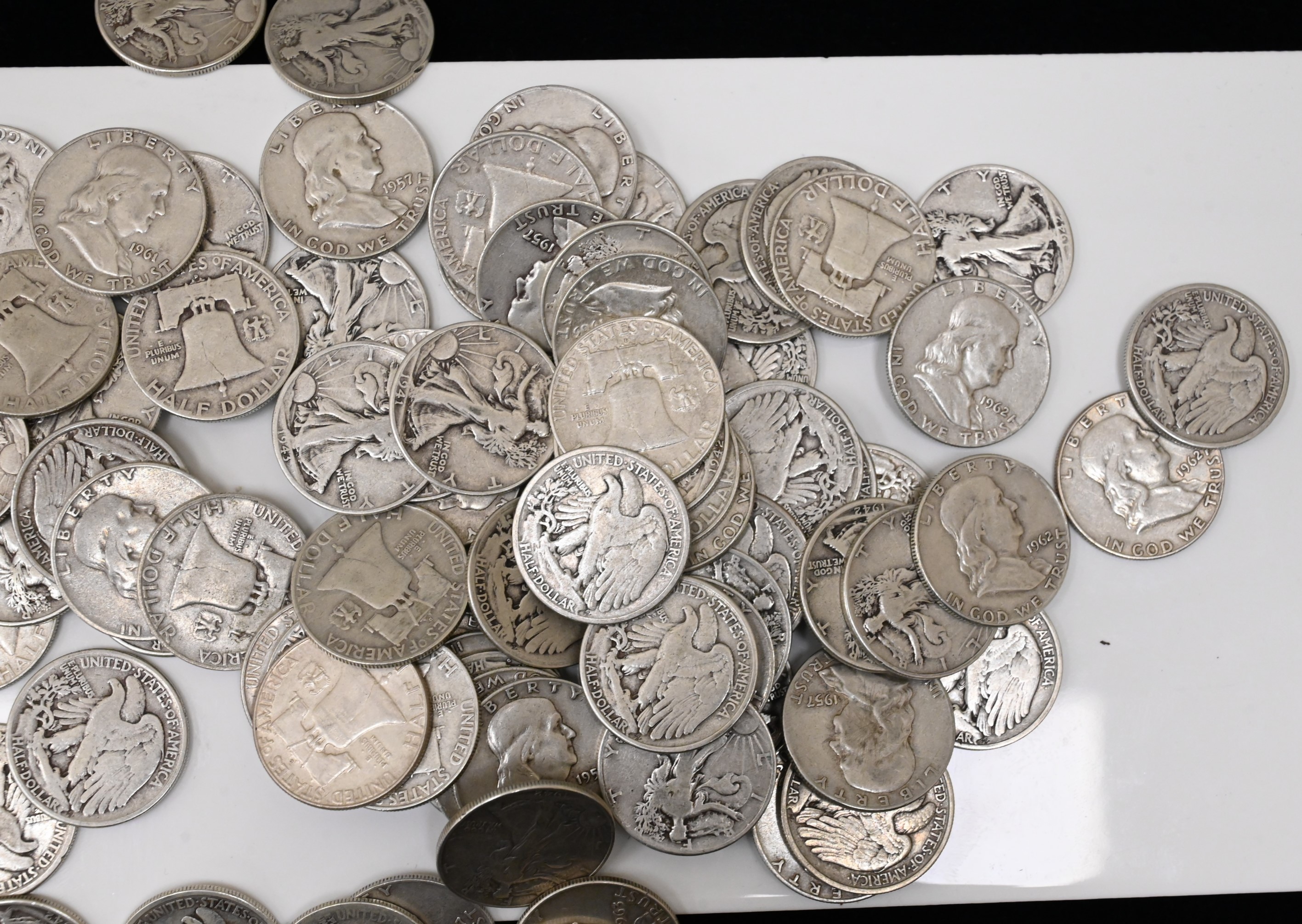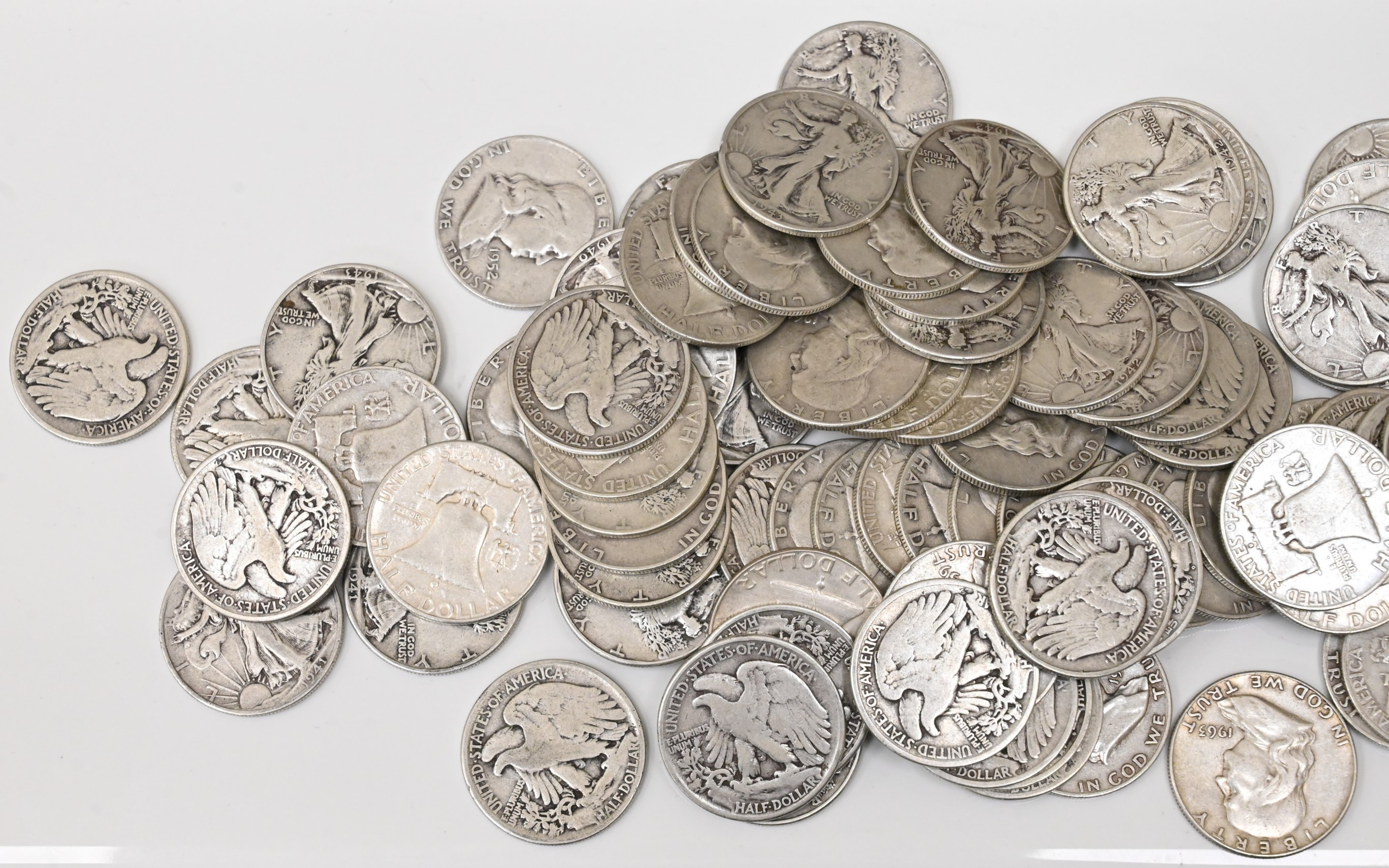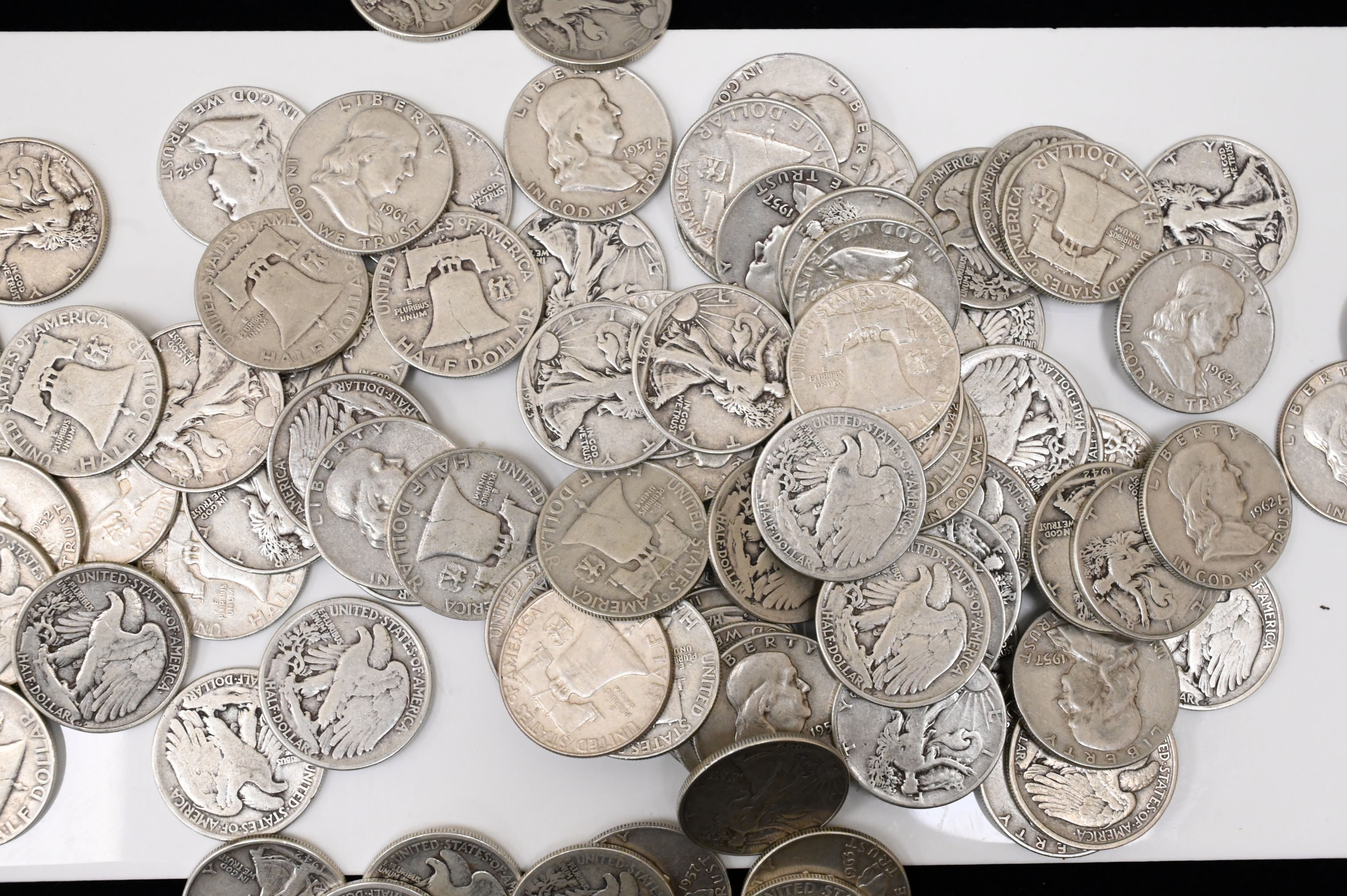 Fifty Dollars face value of 90% Silver Walking Liberty and Franklin Half Dollars.