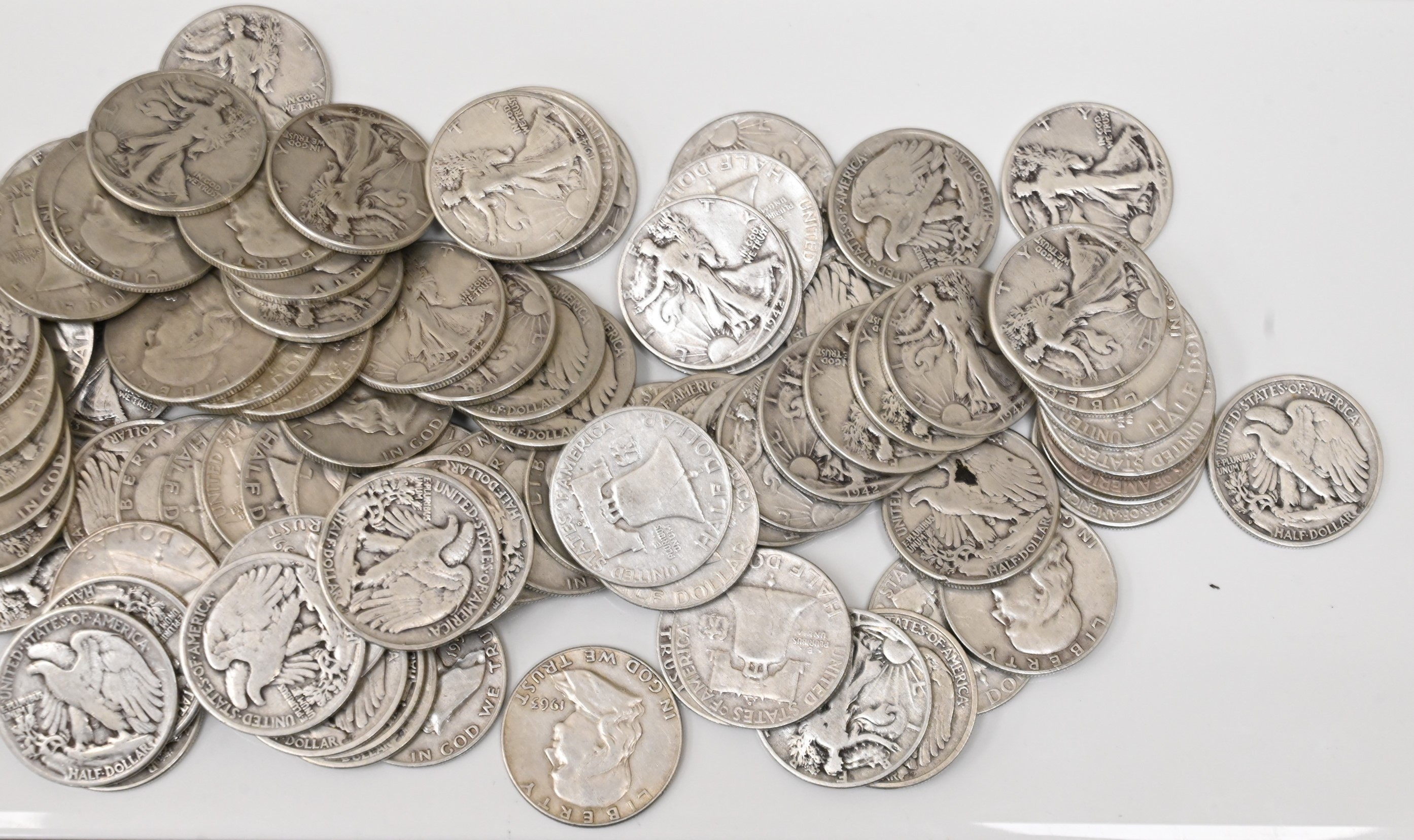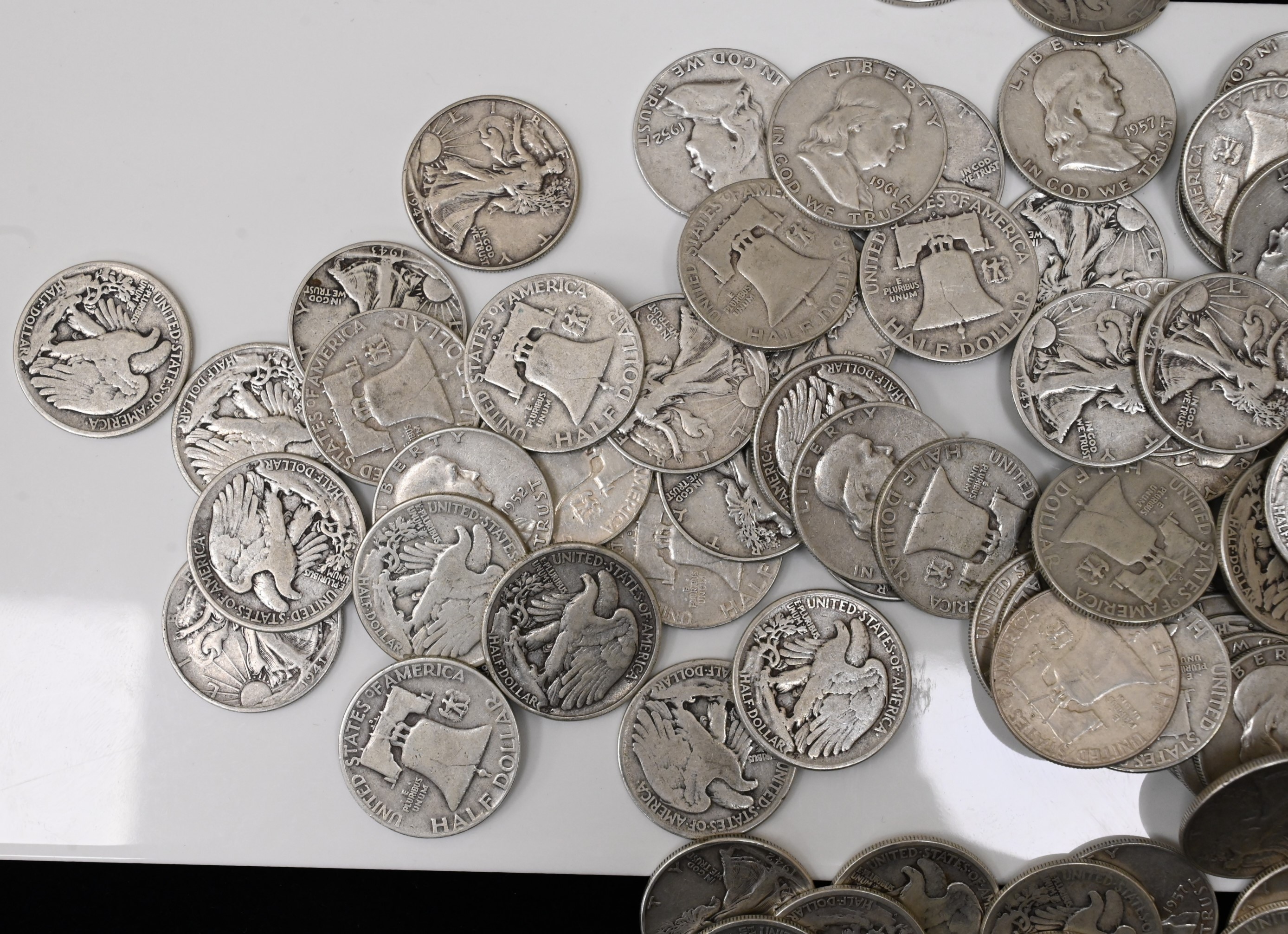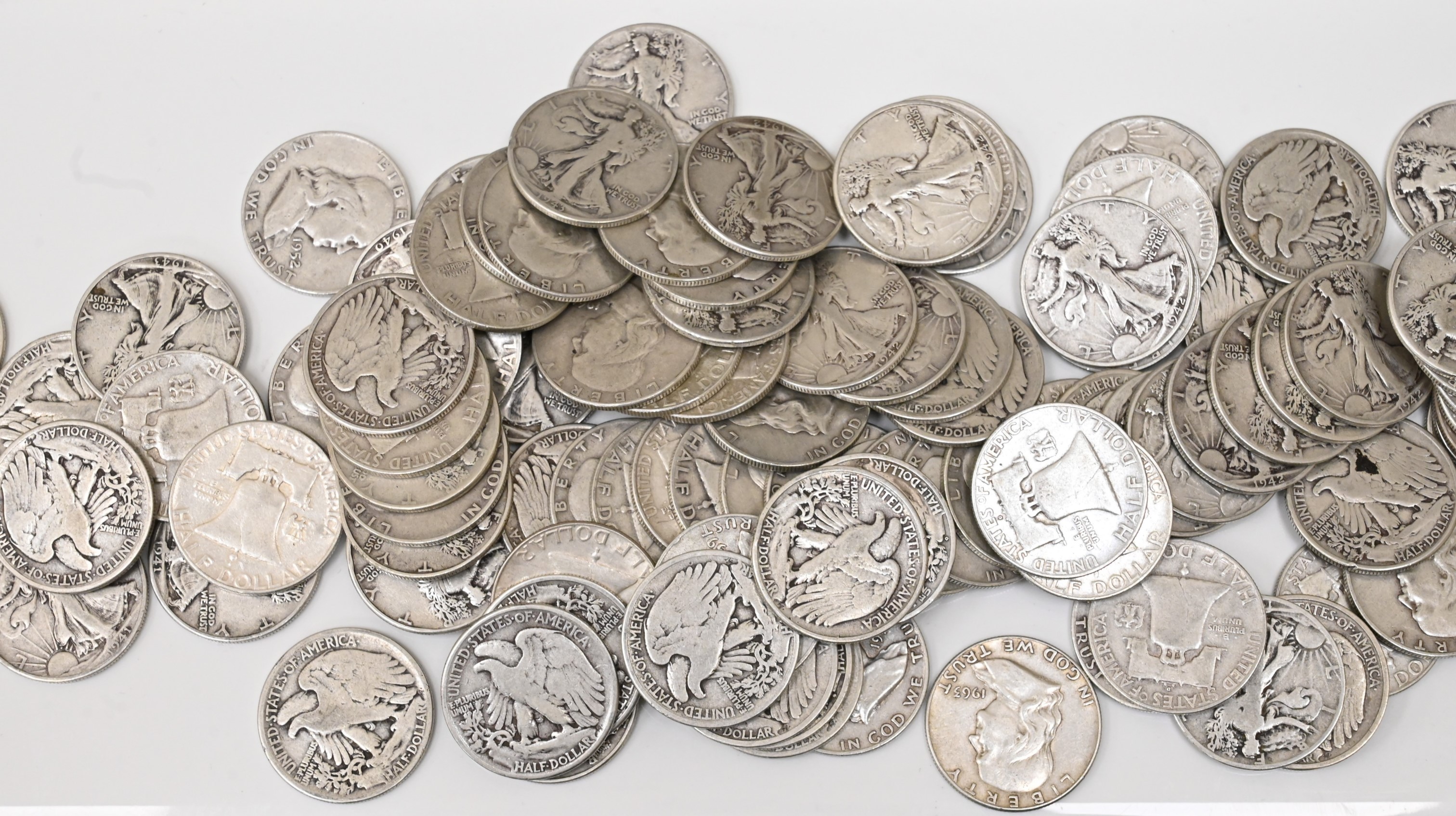 Fifty Dollars face value of 90% Silver Walking Liberty and Franklin Half Dollars.