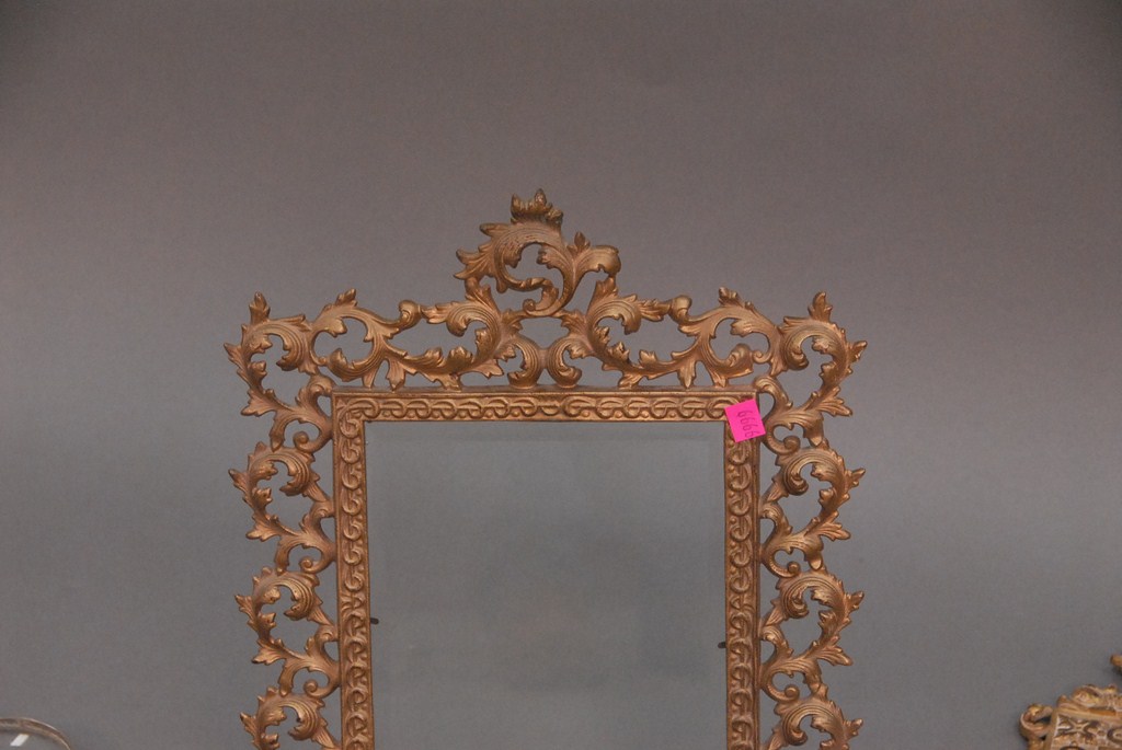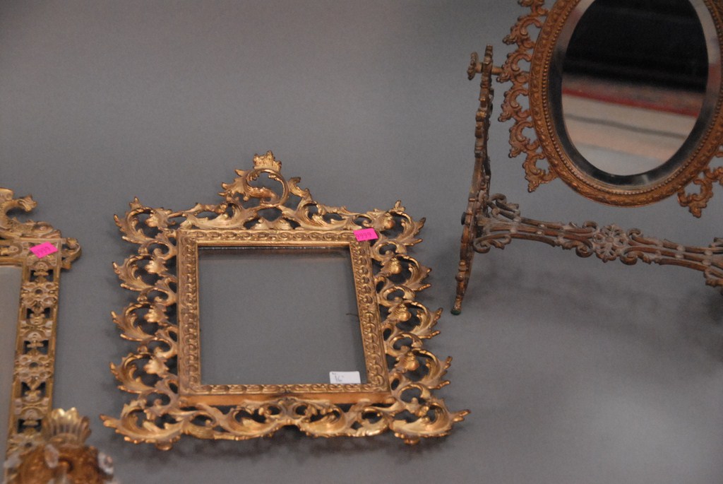 Lot 98: Four piece lot Victorian metal mirror on stand, two Victorian metal frames and brass mirrored candle sconce with dolphins.