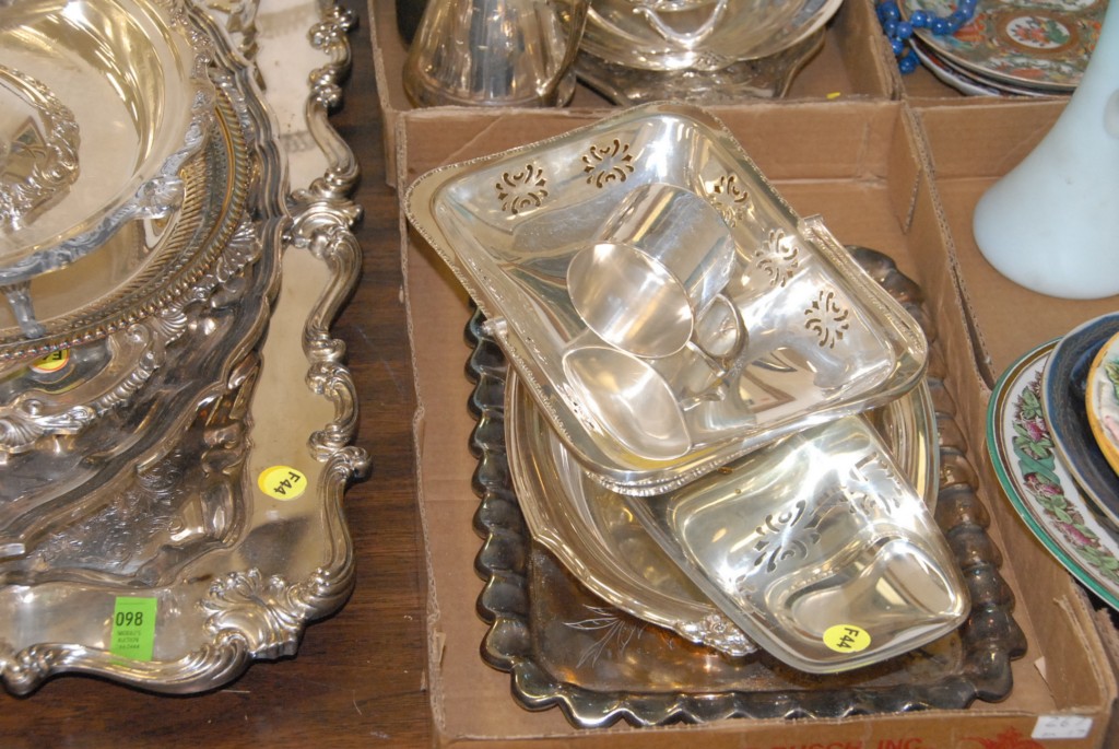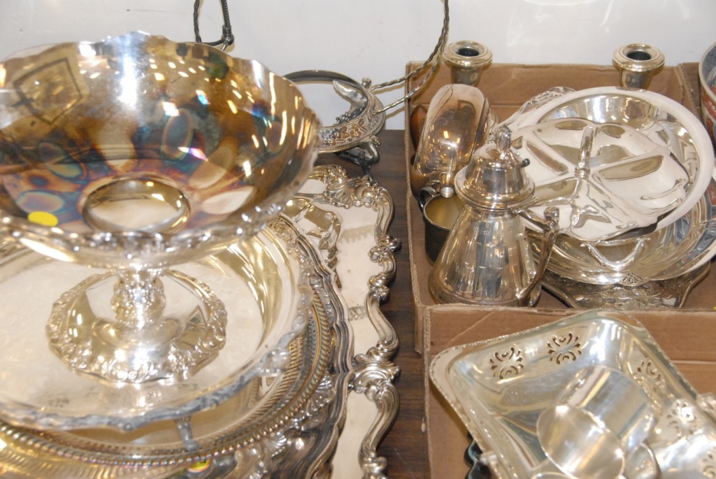 Group lot of silverplate large trays, bowls, dishes, containers, pair of sterling candlesticks.