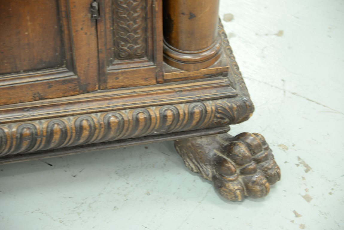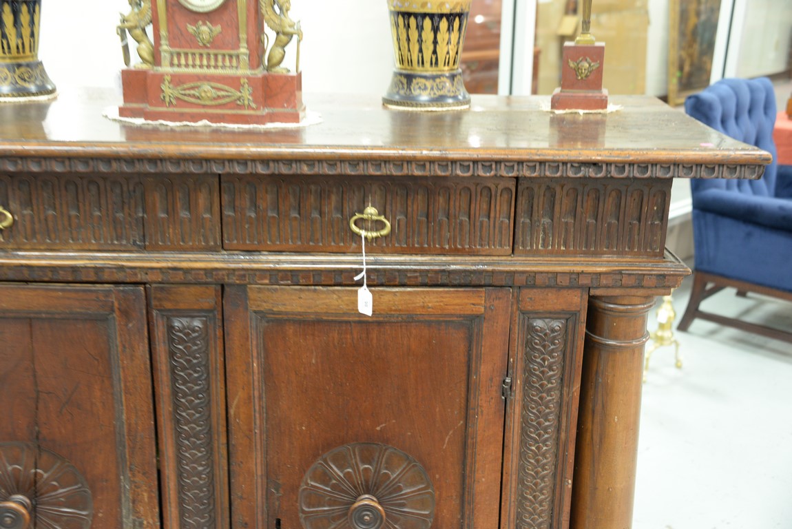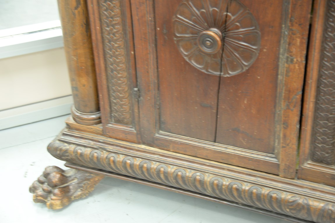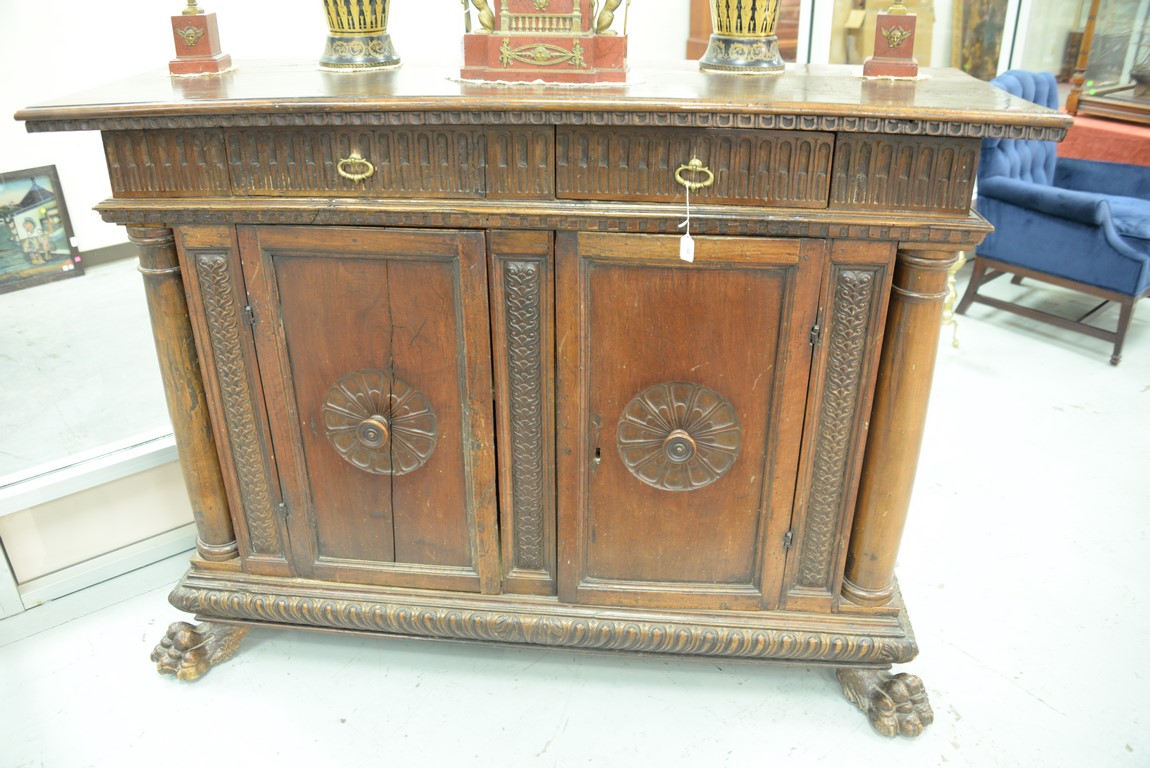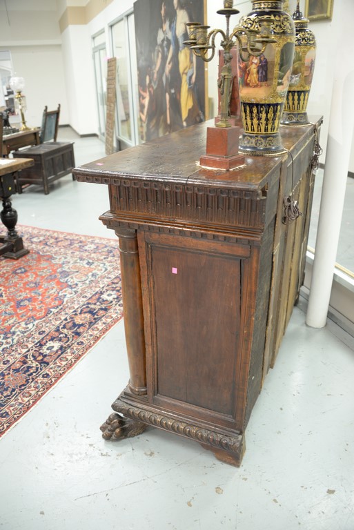 Lot 98: Italian walnut sideboard having rectangular top over conforming case with carved frieze having two drawers over carved doors flanked by large turned columns with carved skirt all on large paw feet, Italy probably 17th century. ht. 49 in. wd.