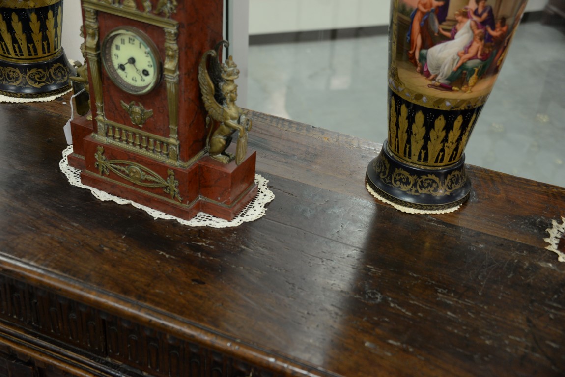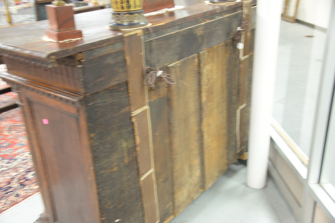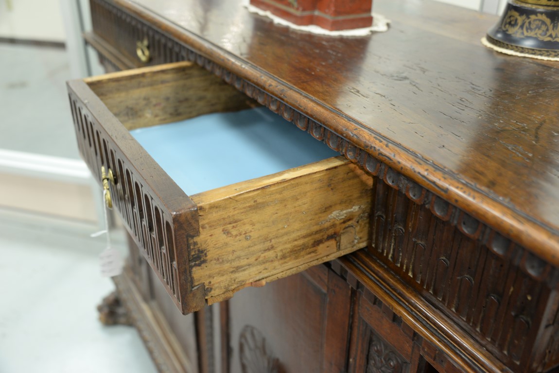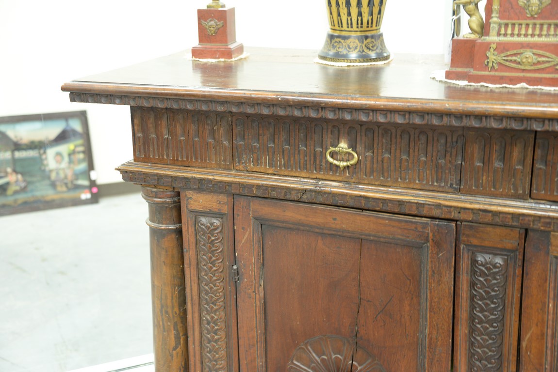 Lot 98: Italian walnut sideboard having rectangular top over conforming case with carved frieze having two drawers over carved doors flanked by large turned columns with carved skirt all on large paw feet, Italy probably 17th century. ht. 49 in. wd.