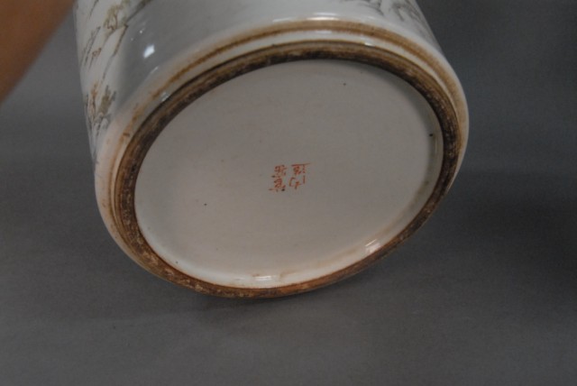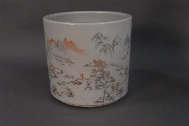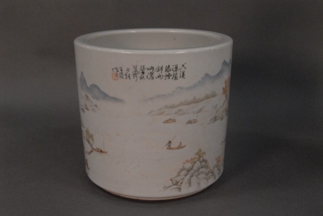 Late Qing Dynasty landscape scene brush pot with GuanYaoneiZao imperial mark.