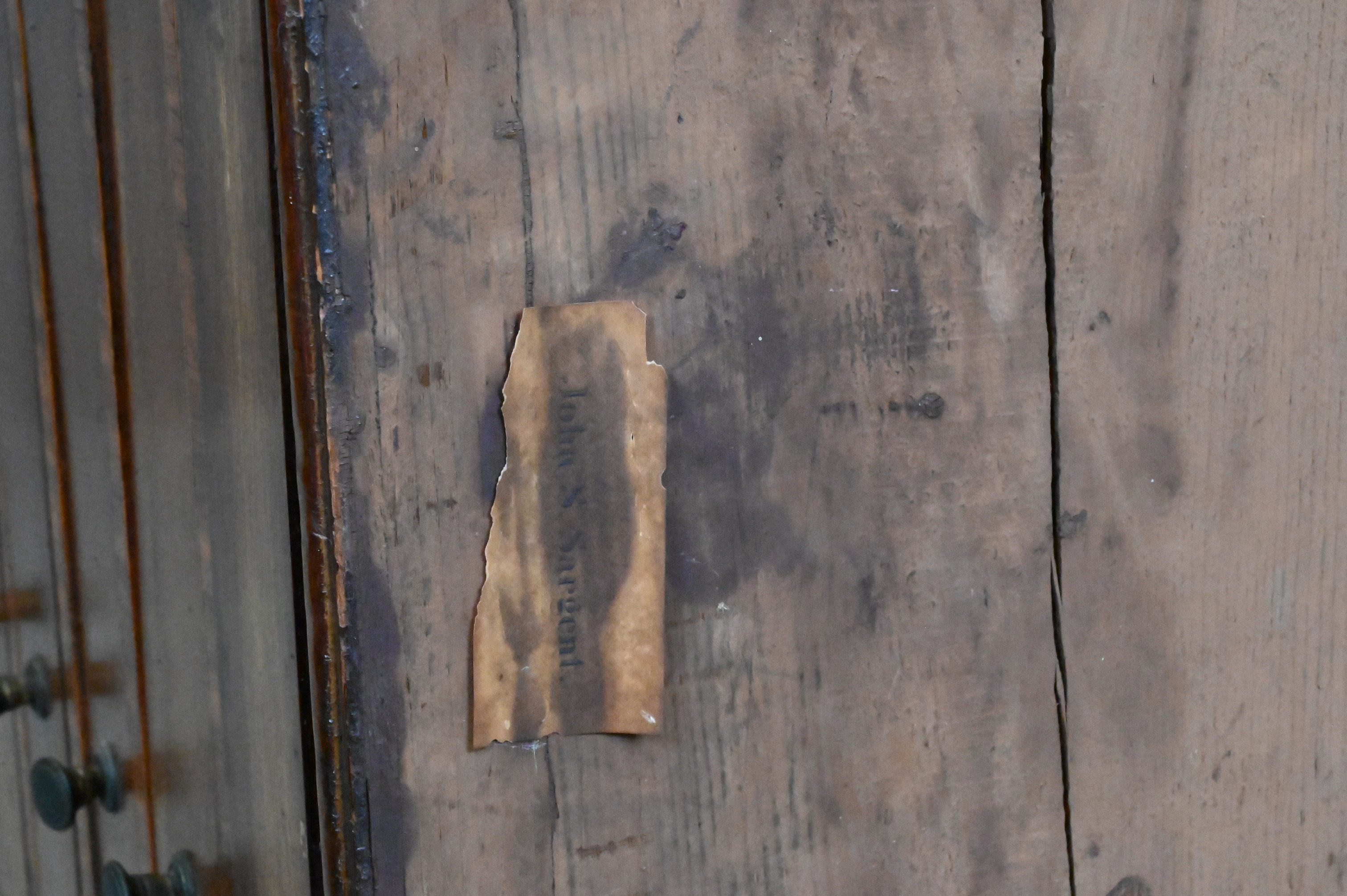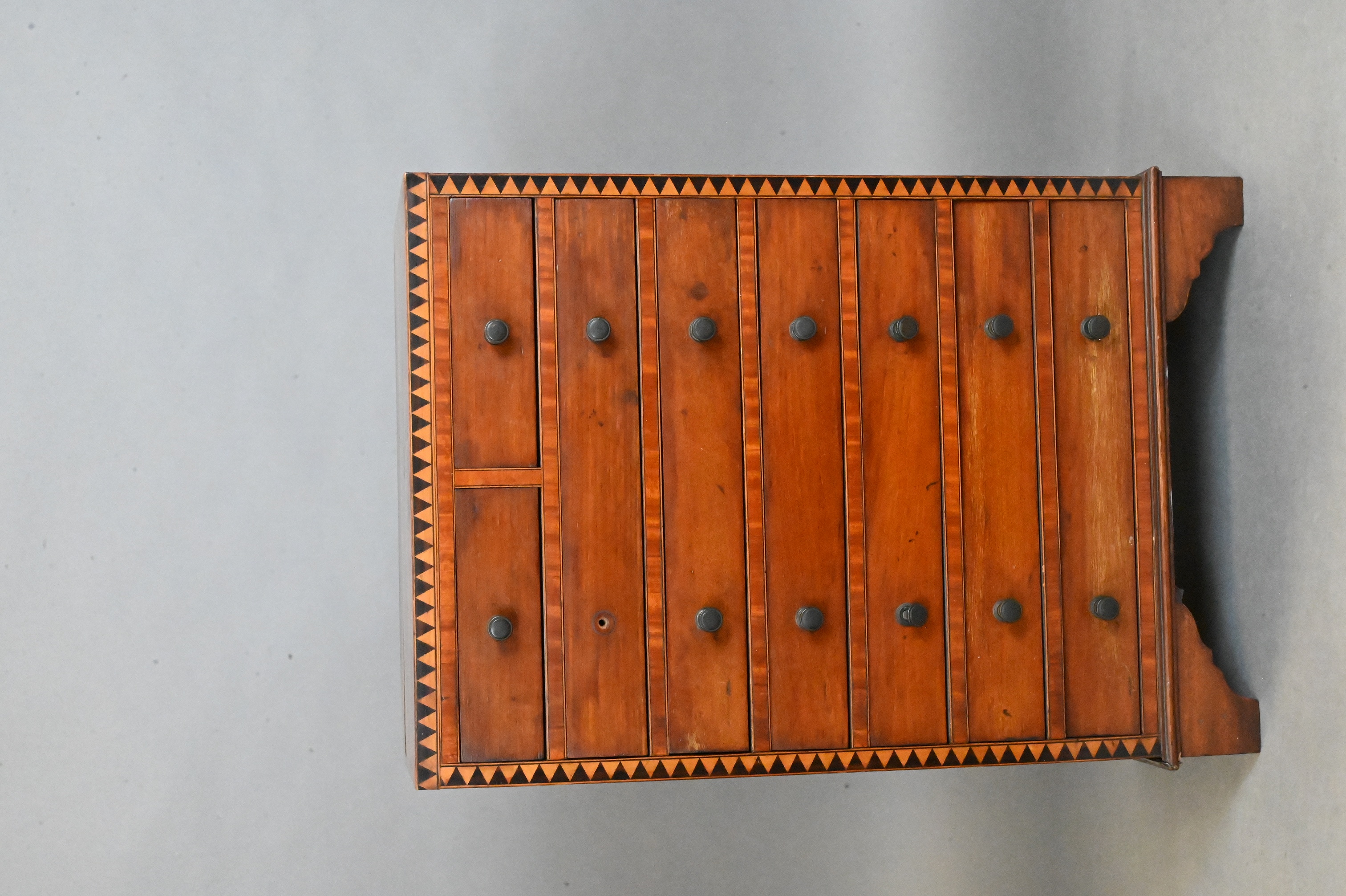 finely made miniature chest with two short drawers over five graduated long drawers, flanked by inlaid chevron and diamond banding and fitted with round brass pulls, retains an old paper label on the underside reading “John S. Sargent”