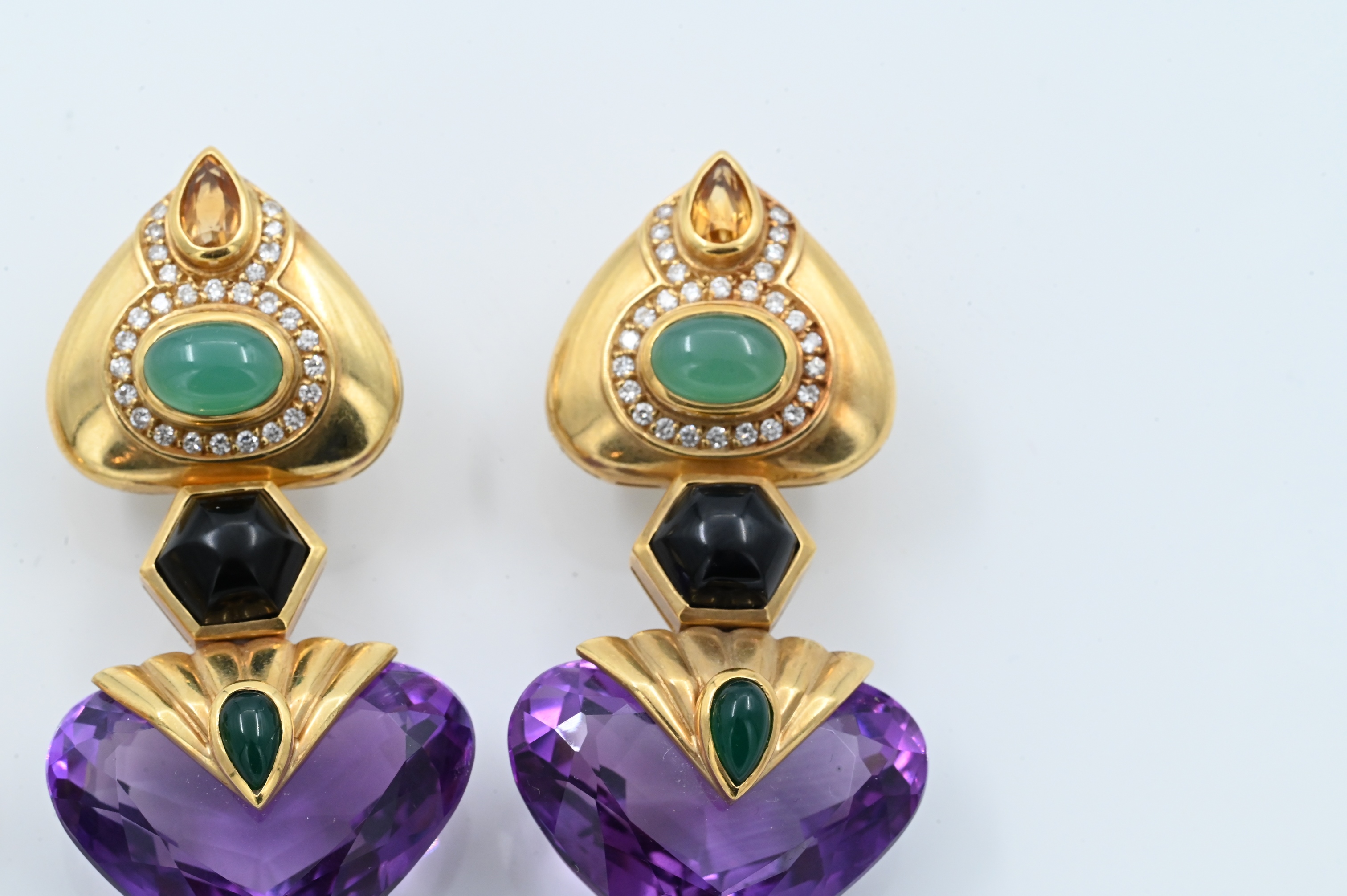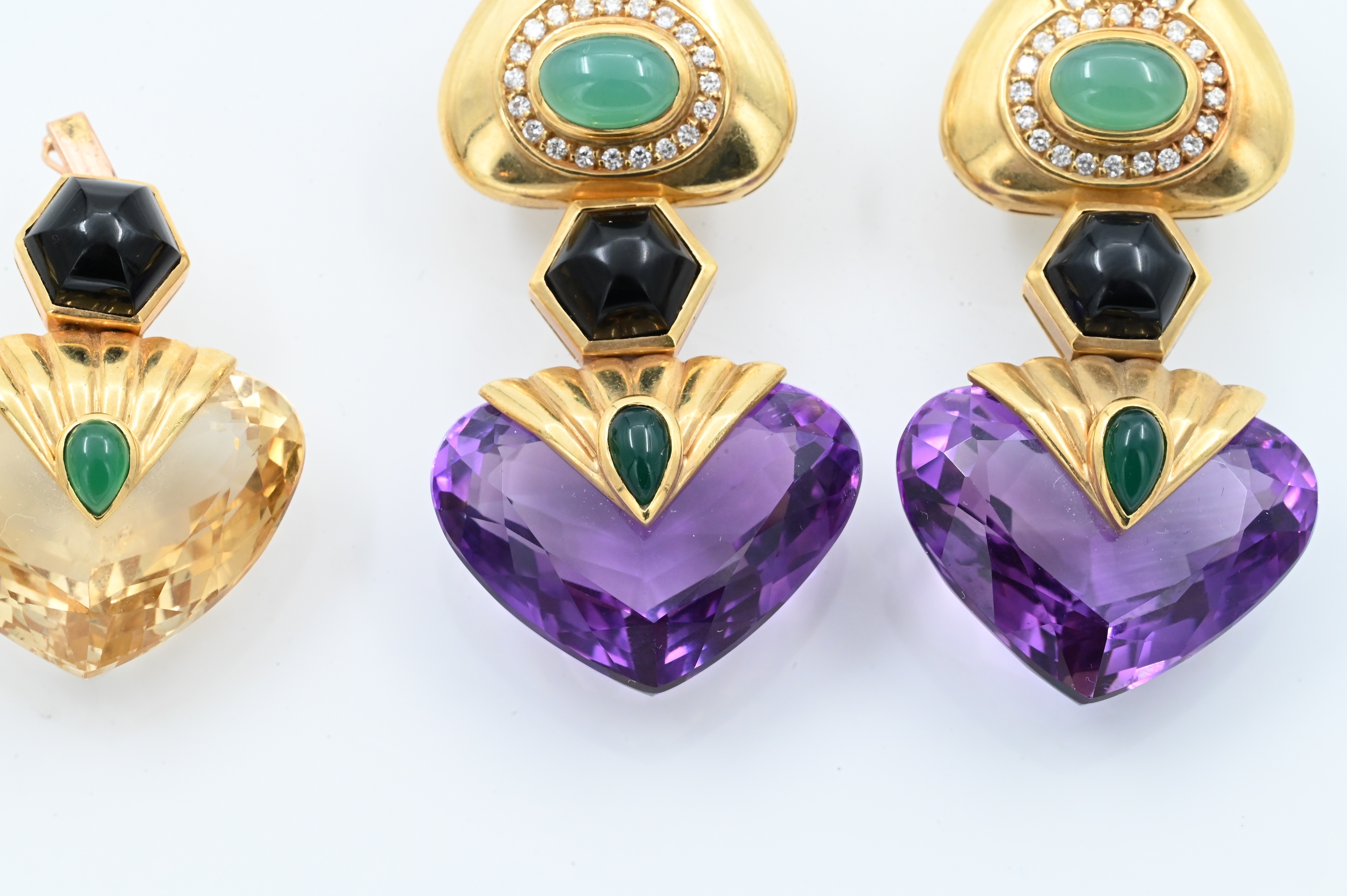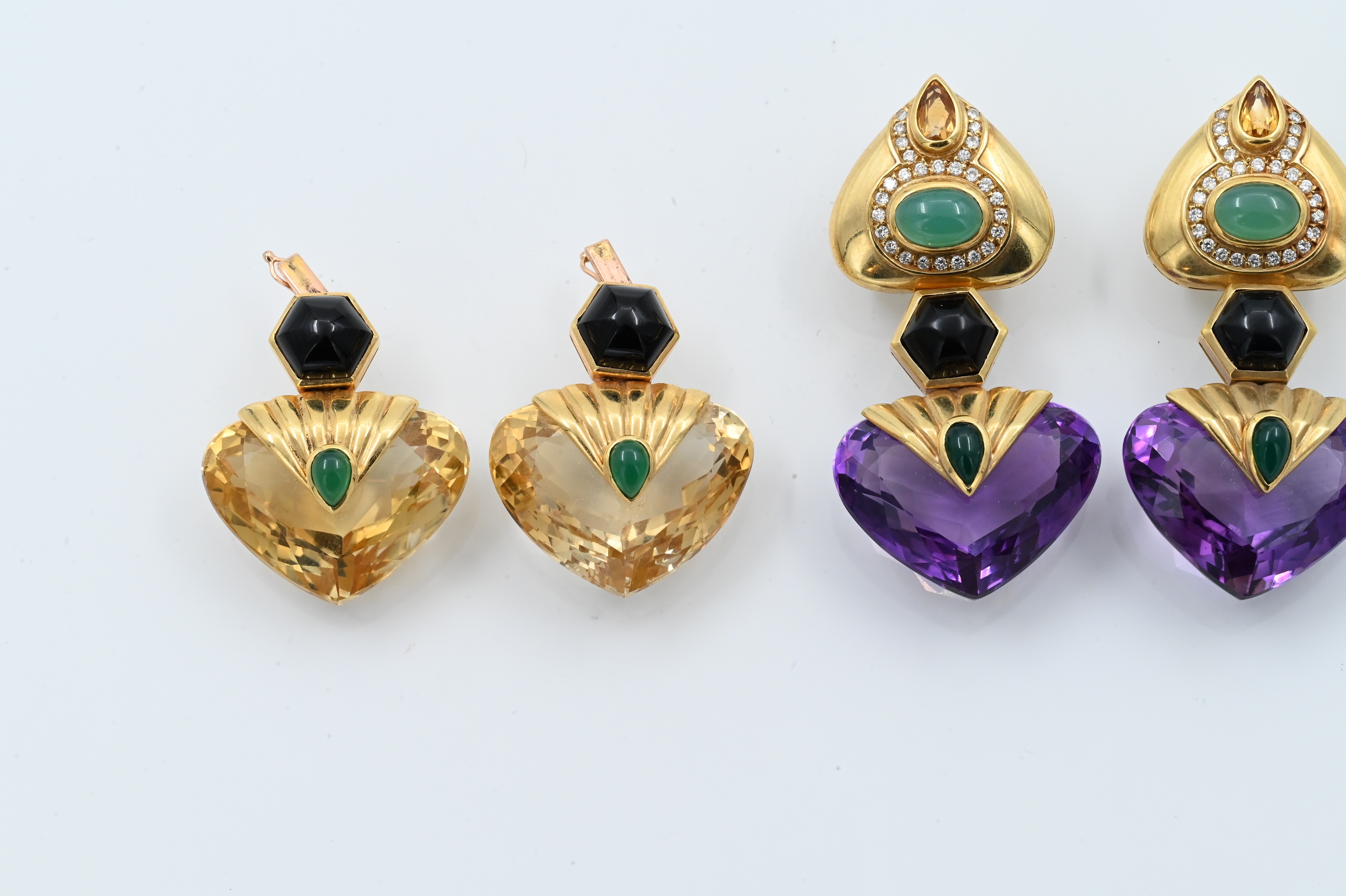 having interchangeable bottoms, 2 inches long, 45.5 grams for a full pair and 27.6 grams for the removable bottom pair, tops have two 9.5 mm x 7 mm oval cabochon chrysoprase, two 7.5 mm x 5 mm pear shaped cabochon citrines, and 56 diamonds, total weight approximately 1.12 carats, bottoms have either two 27 mm x 22 mm heart shape double cabochon amethysts or citrines, four 9 mm hexagon cabochon onyxes, and four 7 mm x 4 mm pear shaped cabochon chrysoprase, total weight 73.3 grams, 2 1/4″ long