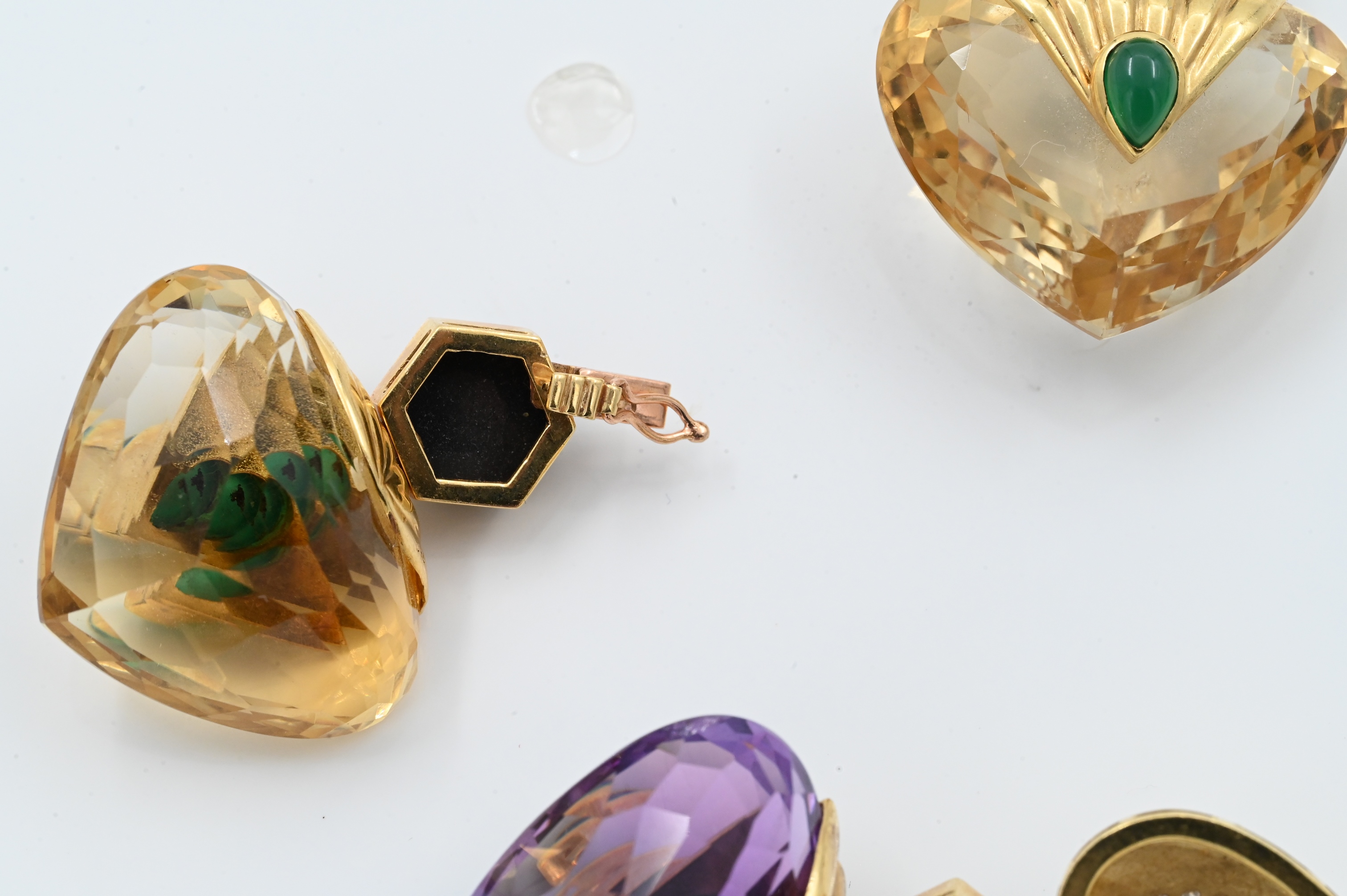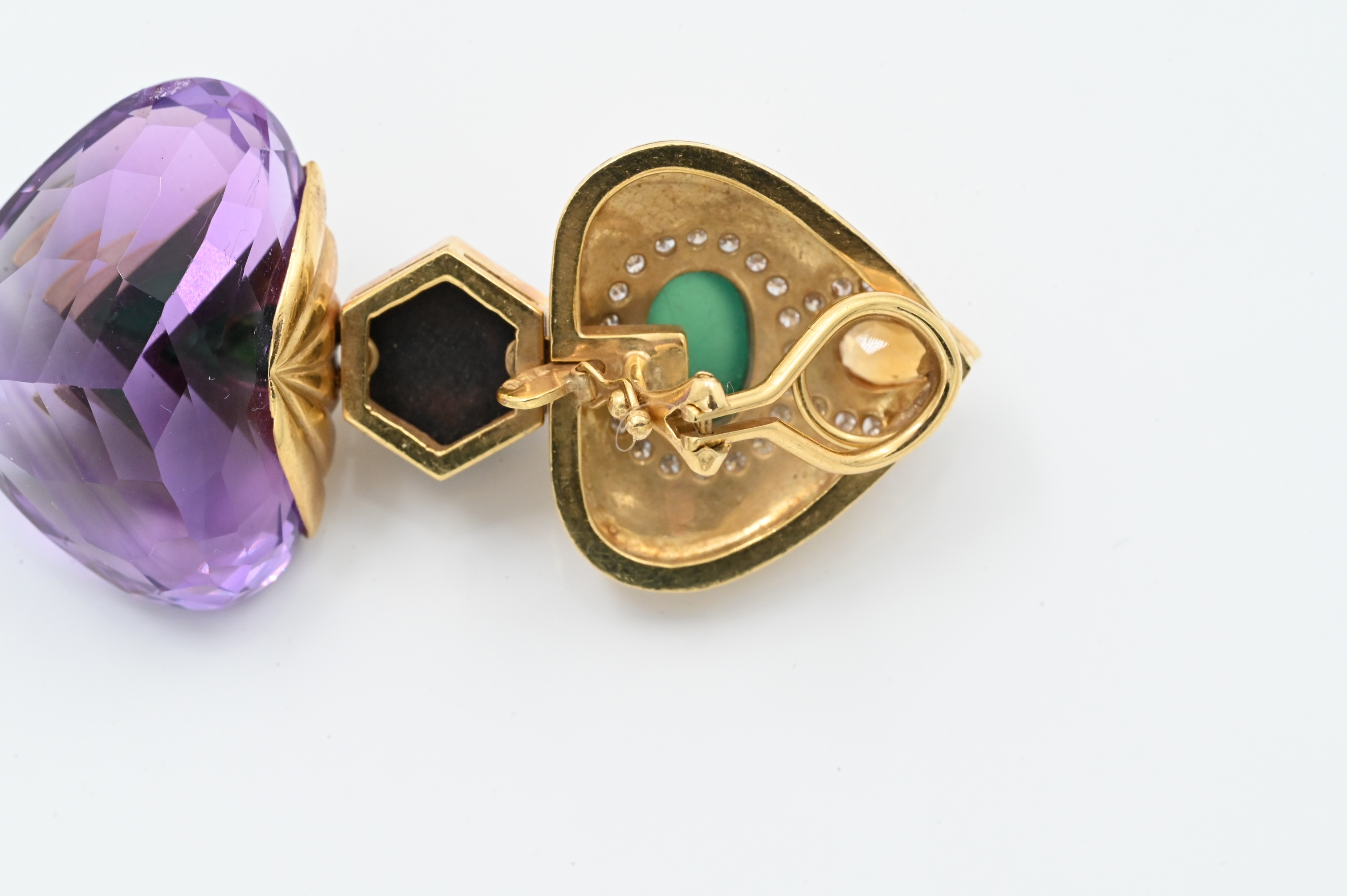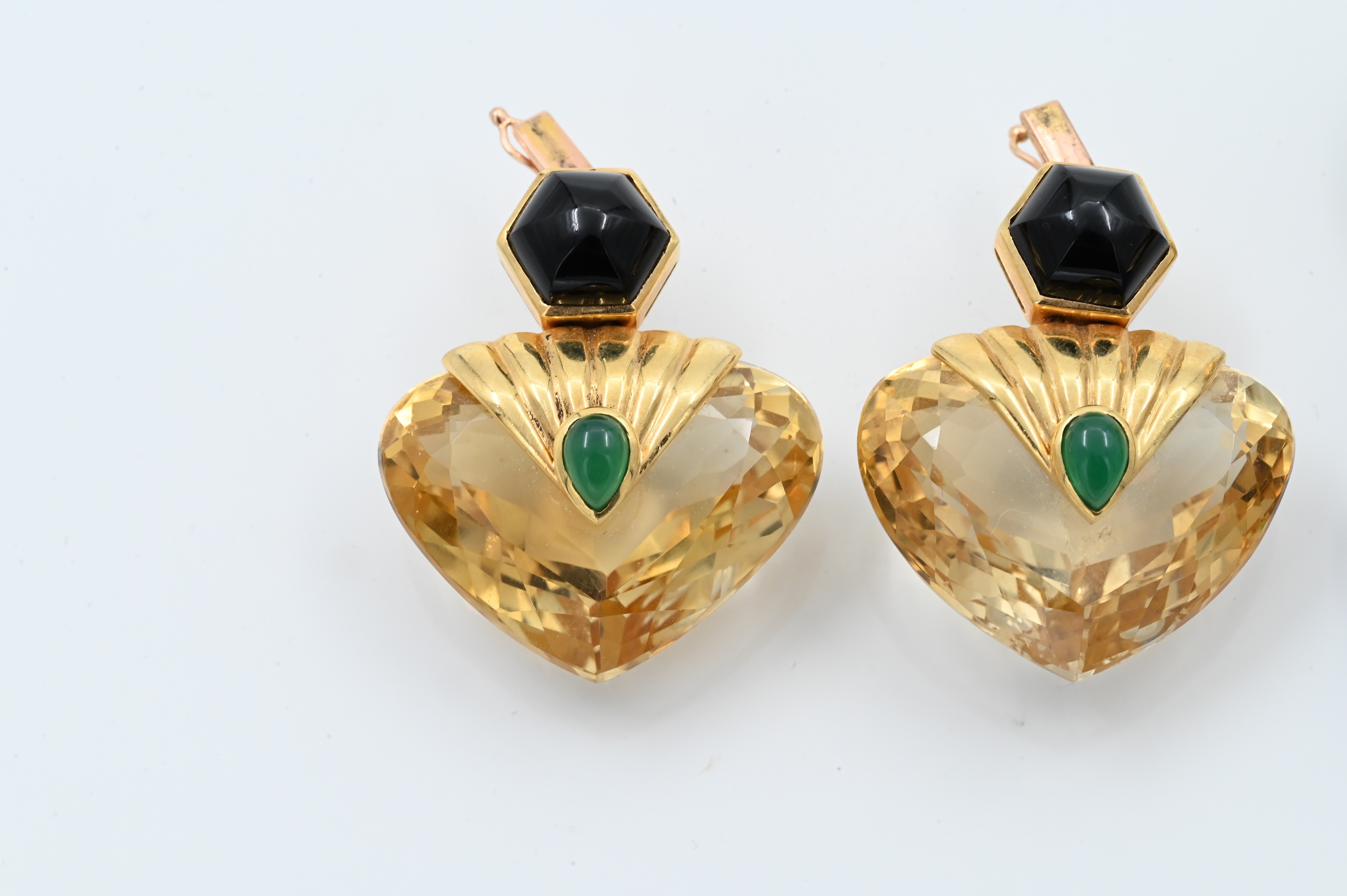 having interchangeable bottoms, 2 inches long, 45.5 grams for a full pair and 27.6 grams for the removable bottom pair, tops have two 9.5 mm x 7 mm oval cabochon chrysoprase, two 7.5 mm x 5 mm pear shaped cabochon citrines, and 56 diamonds, total weight approximately 1.12 carats, bottoms have either two 27 mm x 22 mm heart shape double cabochon amethysts or citrines, four 9 mm hexagon cabochon onyxes, and four 7 mm x 4 mm pear shaped cabochon chrysoprase, total weight 73.3 grams, 2 1/4″ long