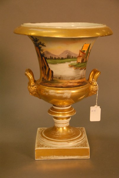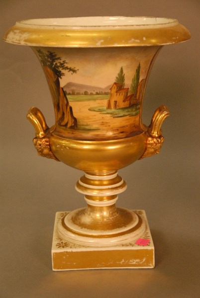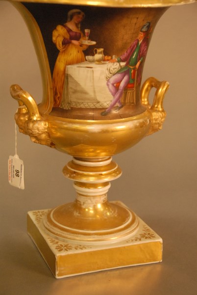 Lot 98: Pair of French porcelain urns, each with two hand painted panels and handles on turned revolving pedestal on square base, gilt decorated, probably early to mid 19th century one handle cracked. ht. 13 1/4in.