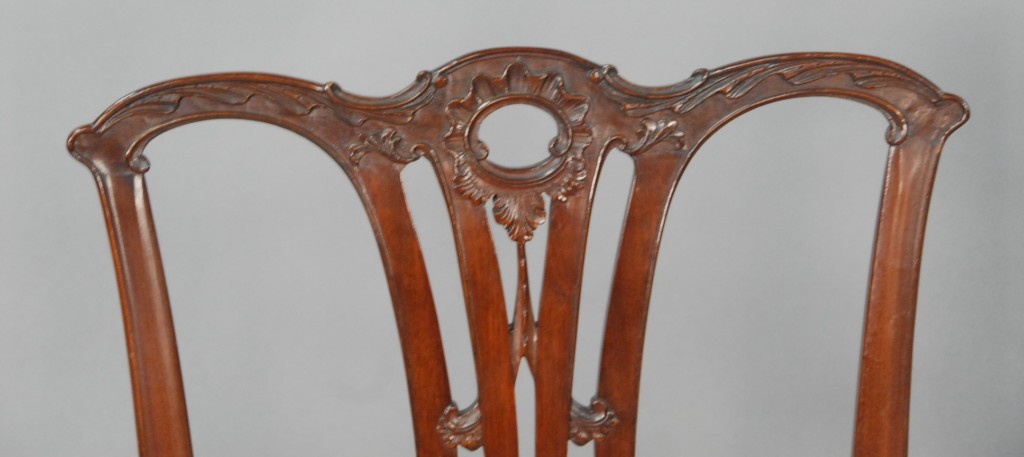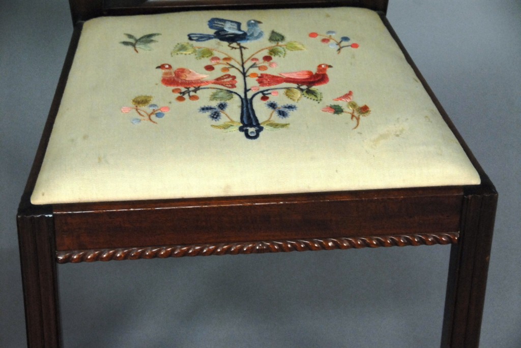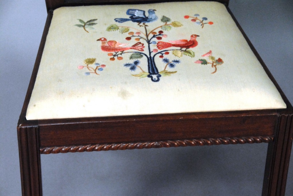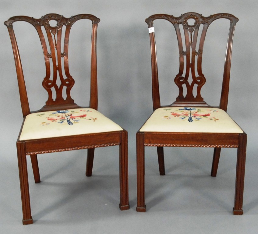 Pair of Margolis mahogany side chairs with carved backs and square molded legs having slip seats with crewel work, branded Margolis Shops.
