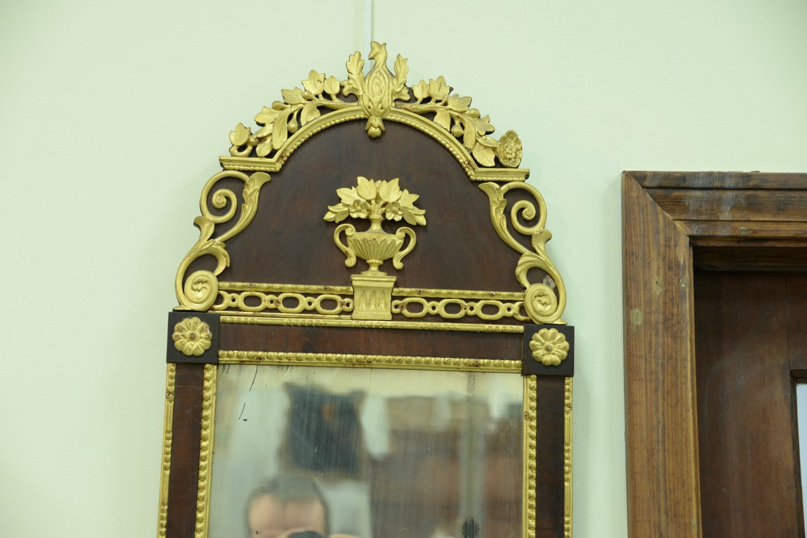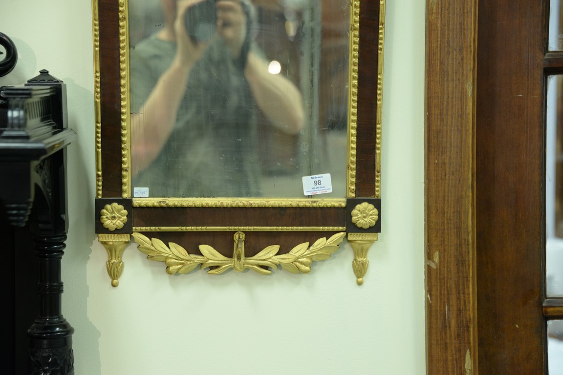 Lot 98: Queen Anne mahogany mirror with gilt foliage, urn, and trim. height 35 1/2 inches Provenance: Estate of R. Donald Bassette