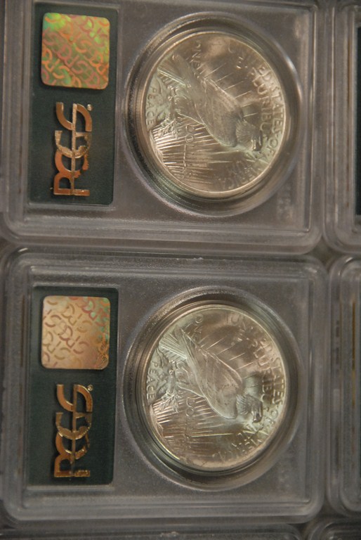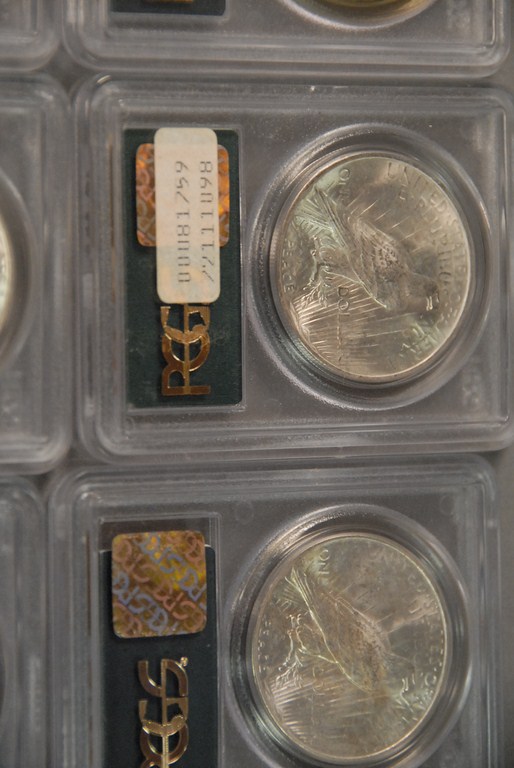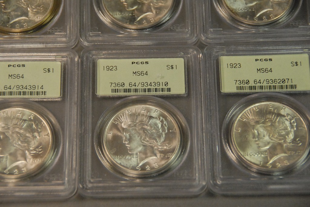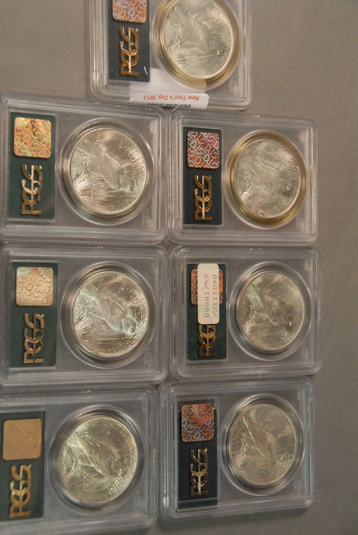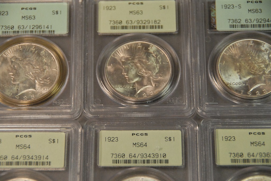 Seven silver dollars 1923 PCGS 63, 1923 PCGS 63, 1923 PCGS 63, 1923-S PCGS 63, 1923 PCGS 64, 1923 PCGS 64, and 1923 PCGS 64.