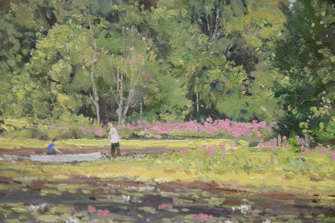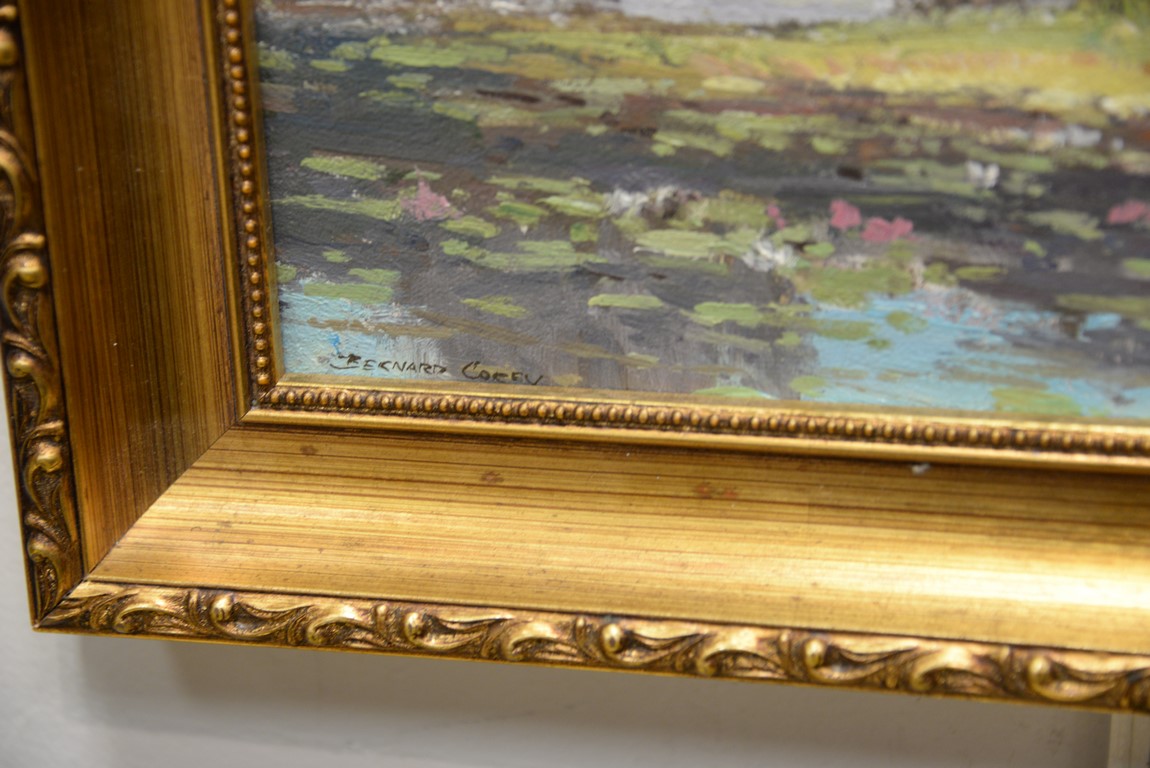 Lot 99: Bernard Corey American 1914-2000 Millbury, MA 1989, Spring Pond oil on masonite signed lower left: Bernard Corey 9 x…