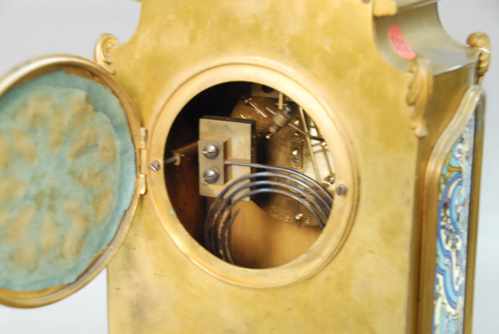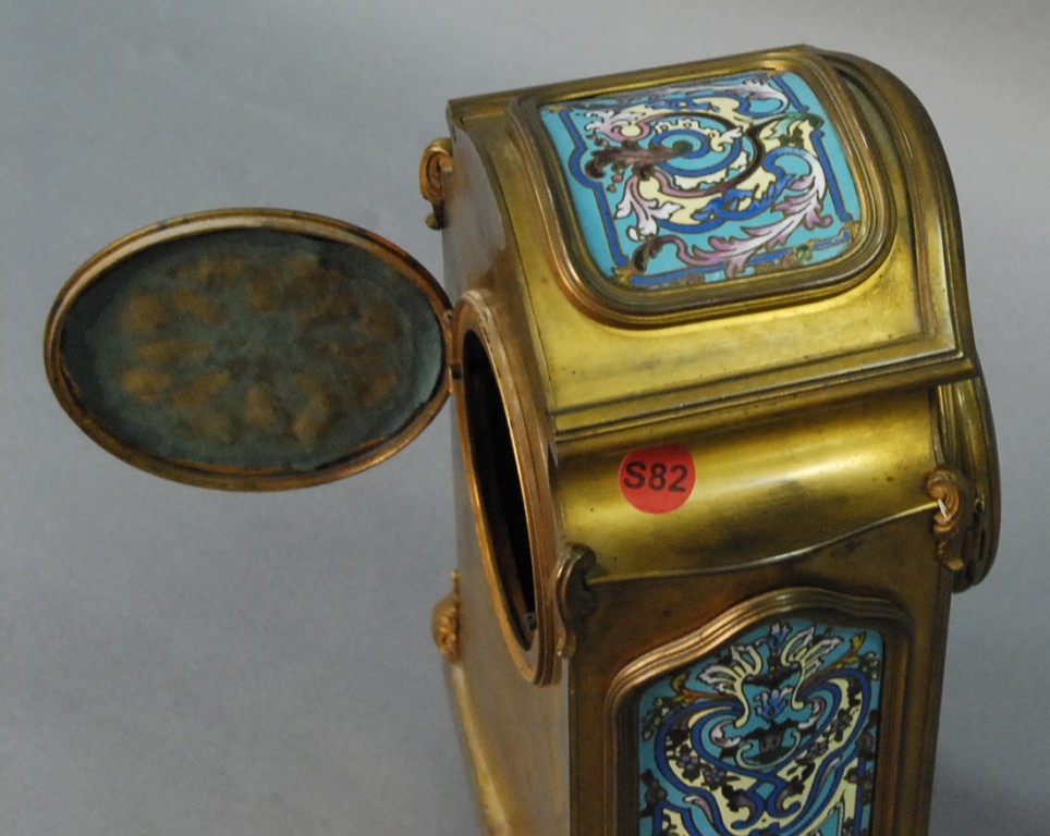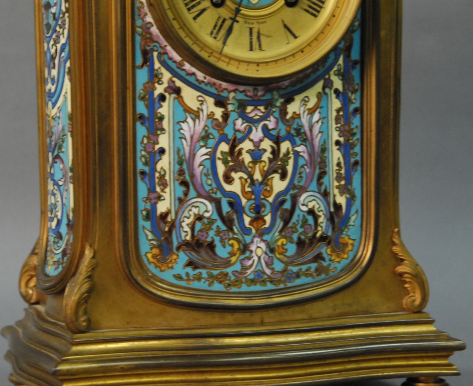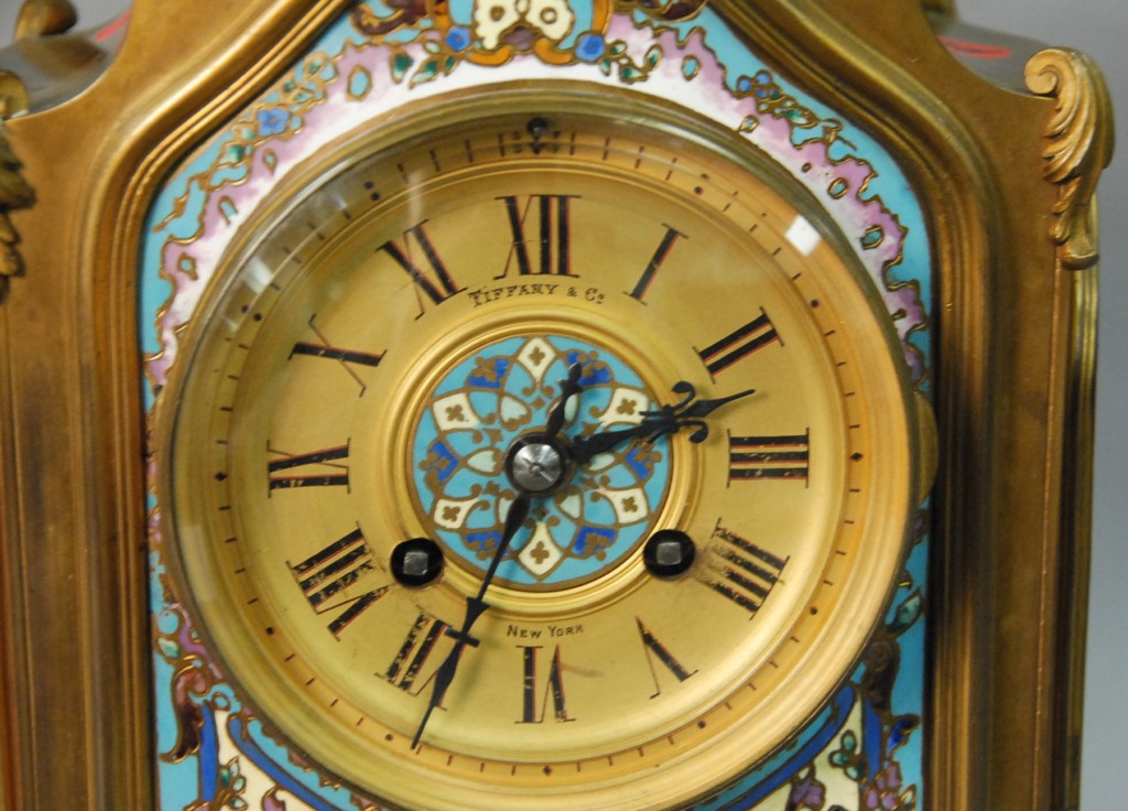 Brass and enameled mantle clock, dial marked Tiffany & Co. N.Y. height 13 1/4in.