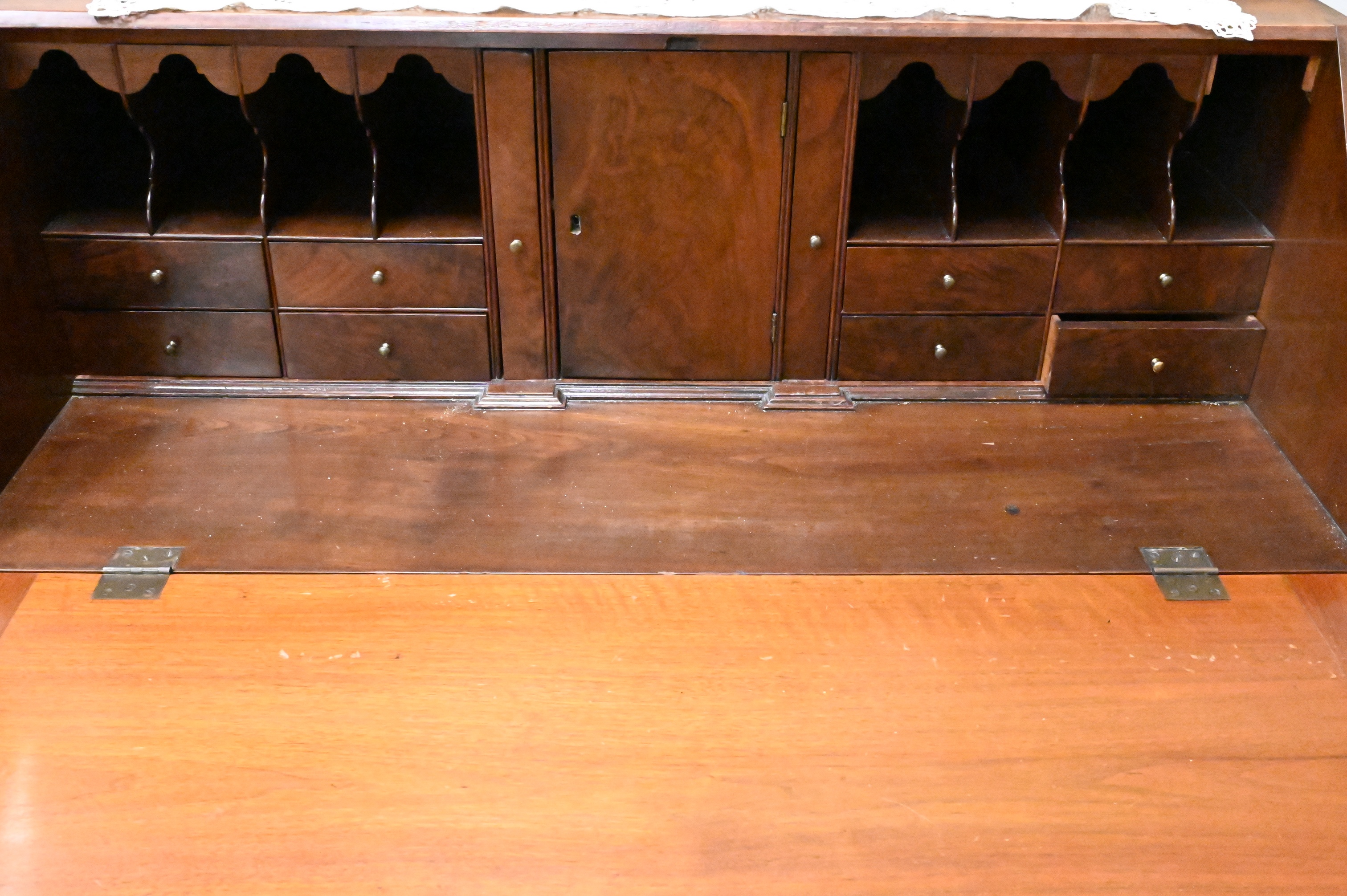 The hinged slant lid opening to an interior fitted with a central door and drawers, all faced in burl wood, over four graduated long drawers flanked by fluted columns, retaining original brass bail pulls, and set on ogee bracket feet. Constructed in walnut with rich color and figure.