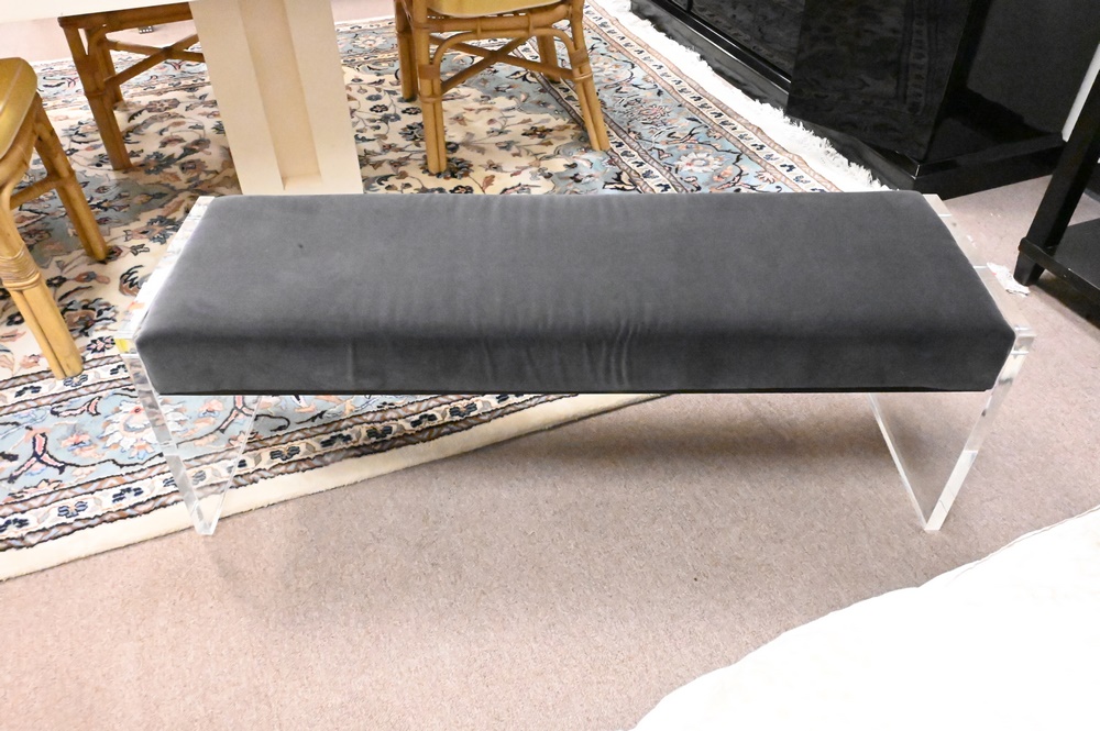 Lot 99: Contemporary Bench, having upholstered top and lucite base, height 17 inches, length 49 1/2 inches, depth 15 inches.